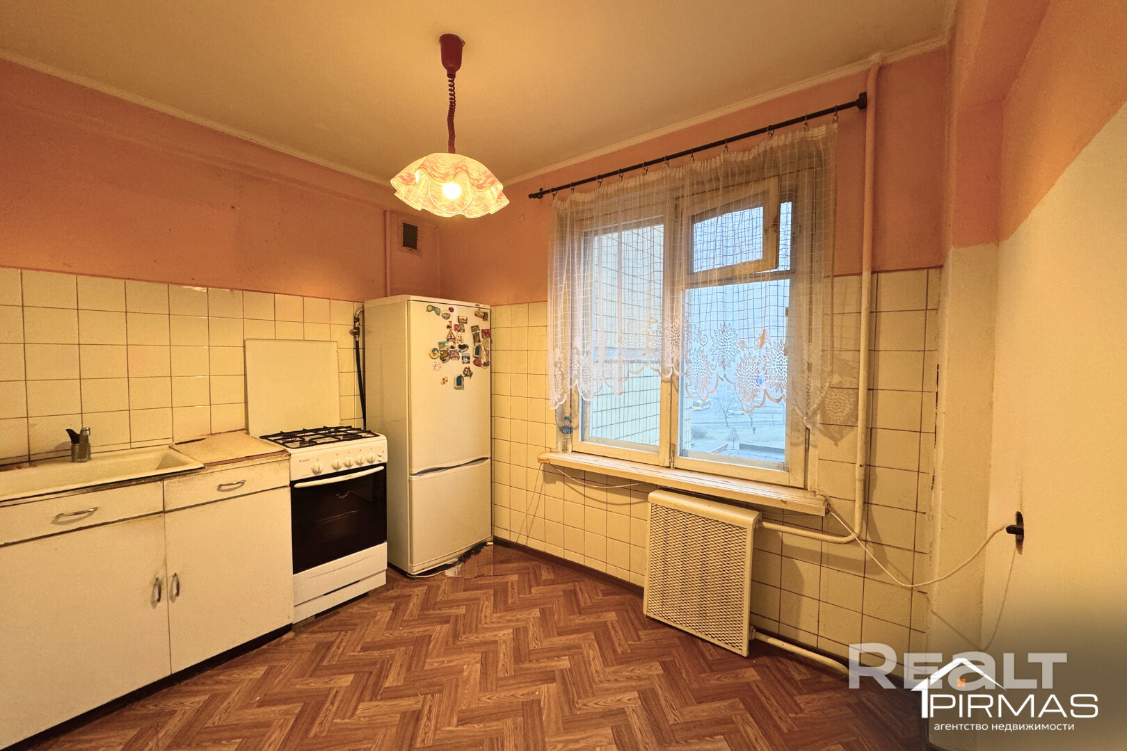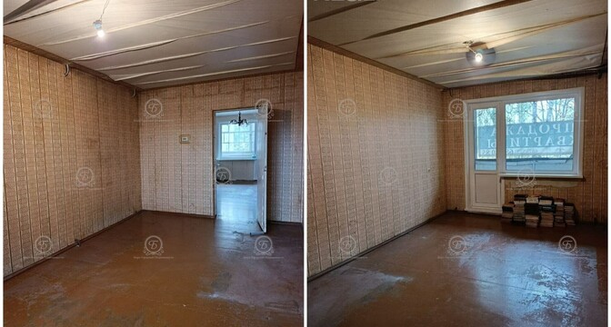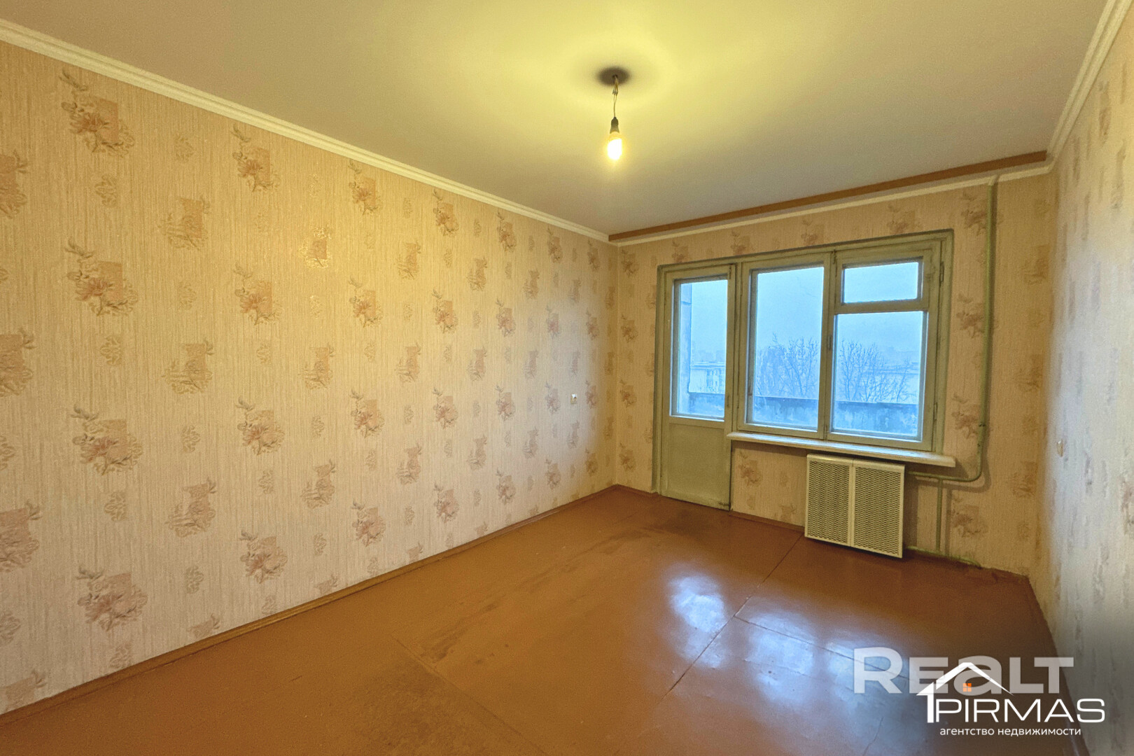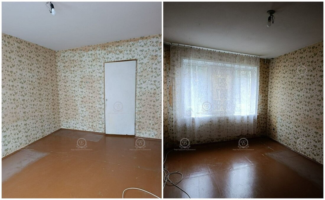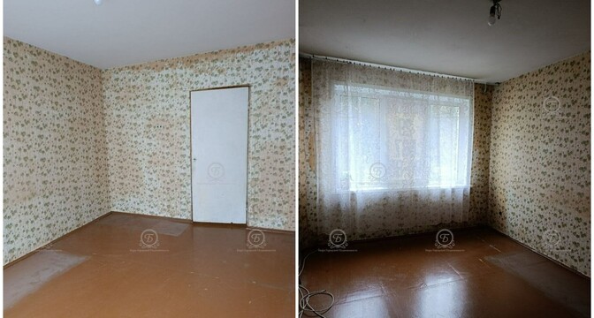 Жилье под ремонт. Тут практически нет мебели и техники, что упрощает демонтаж. В окнах стоят стеклопакеты, на полу лежит деревянное покрытие.