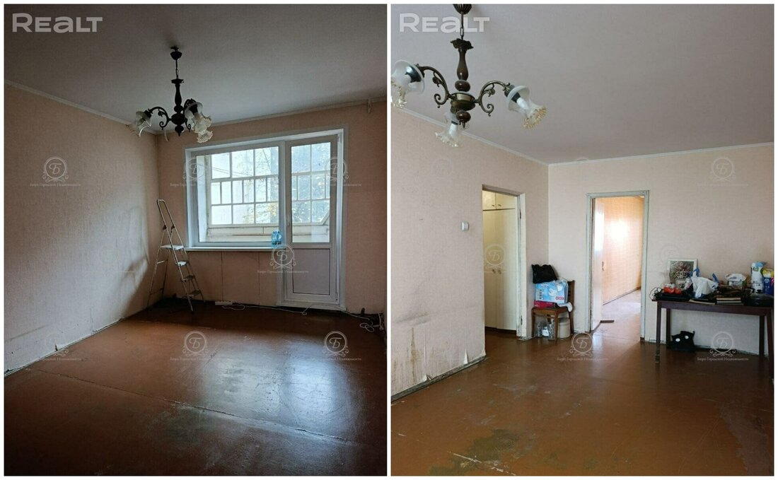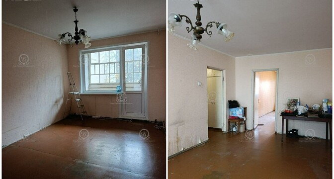 Квартира идет под ремонт. Менять нужно и оконные рамы, и пол. Одна из комнат является проходной. Есть лоджия и балкон.