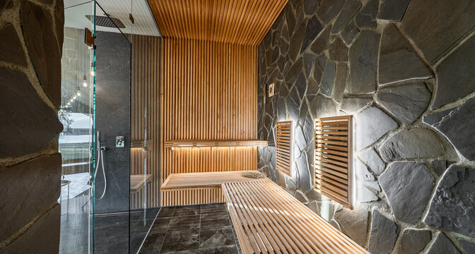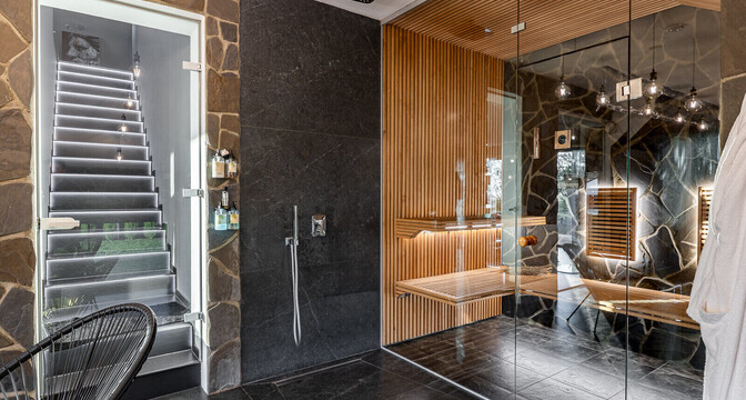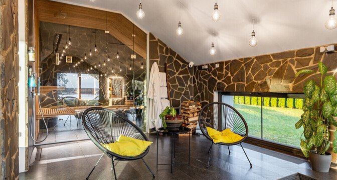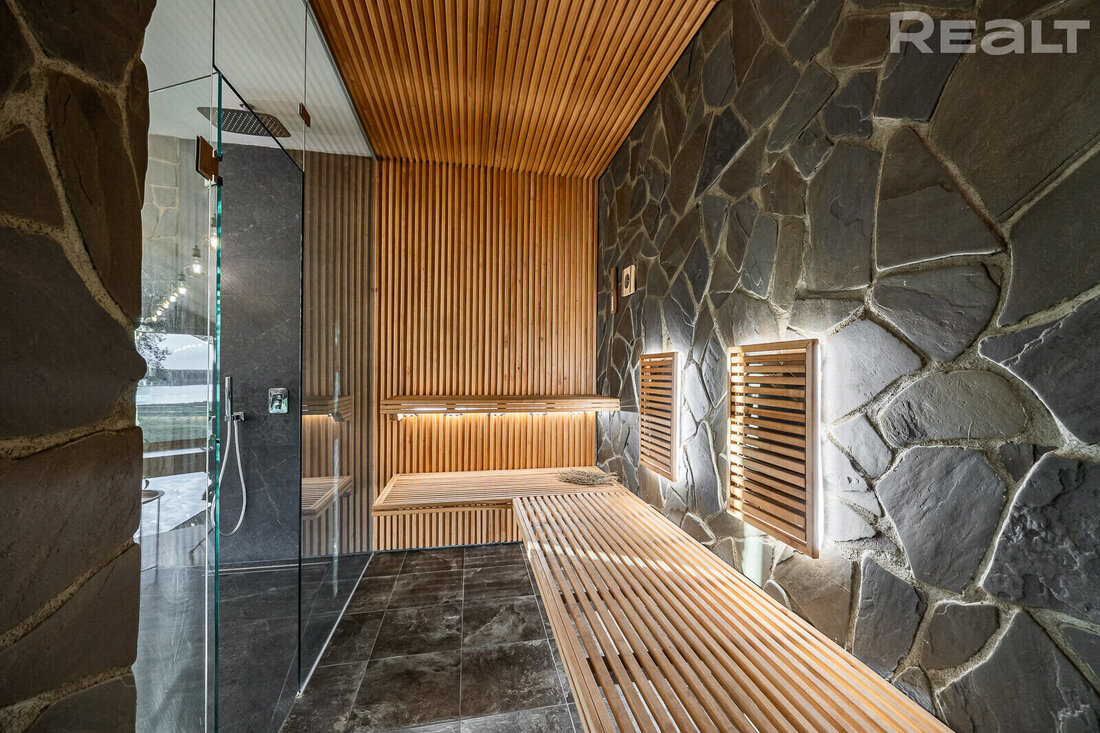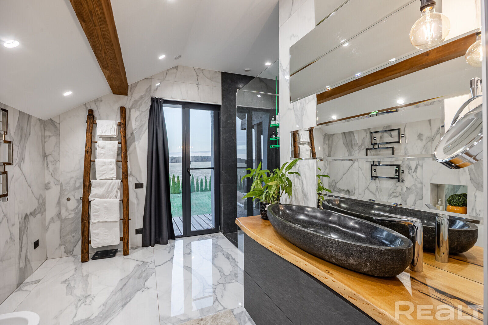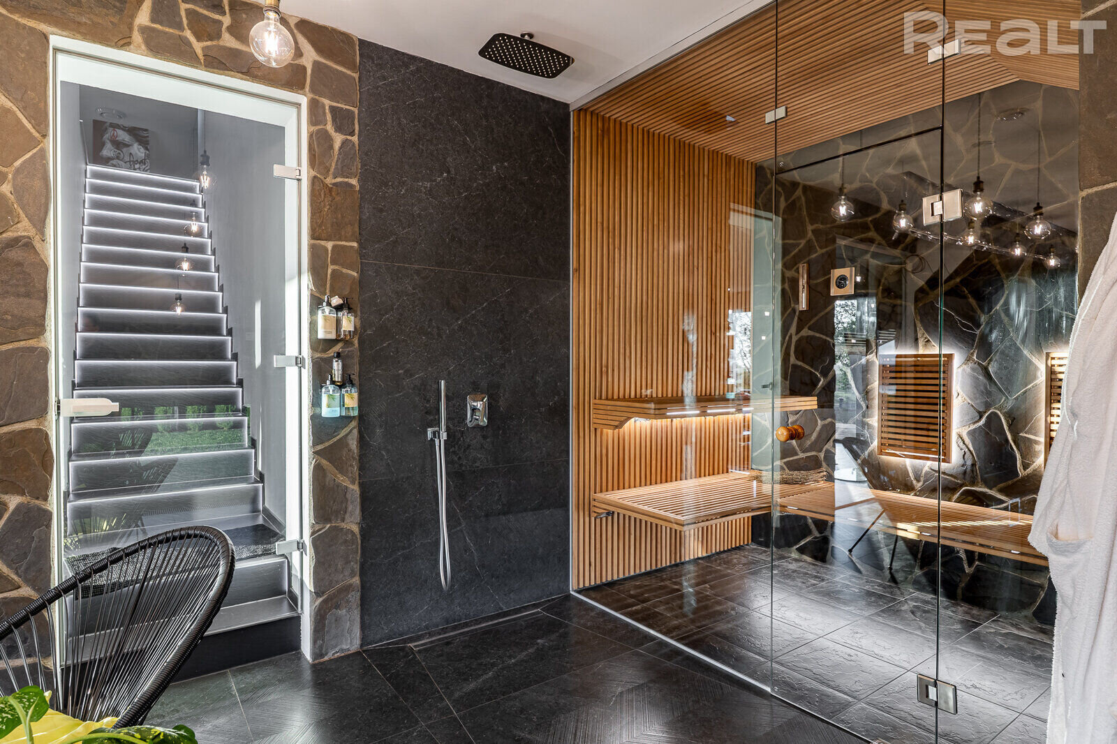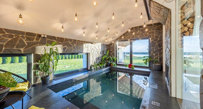 Сбоку расположилась зона СПА с бассейном, джакузи и сауной. В доме стоят окна в алюминиевом профиле, на полу лежат плитка и ламинат.