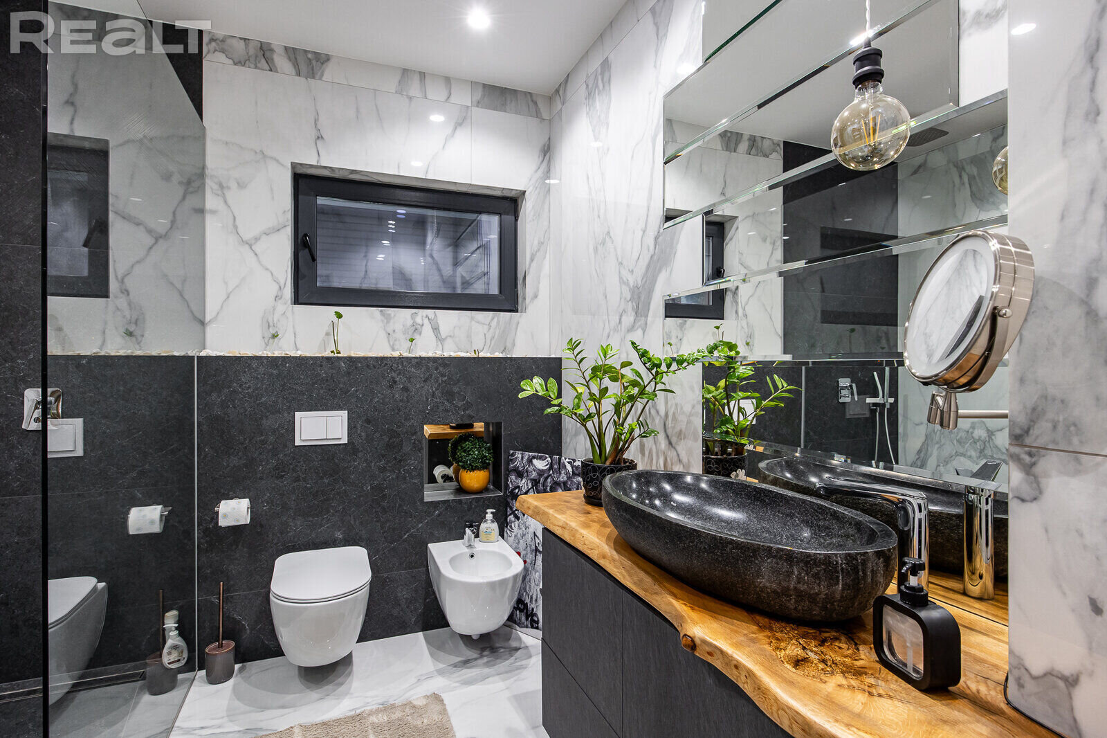 На мансардном этаже также есть один санузел. Вода поступает из скважины, канализация тут местная. Отапливается дом с помощью электричества: теплые полы, конвекторы.