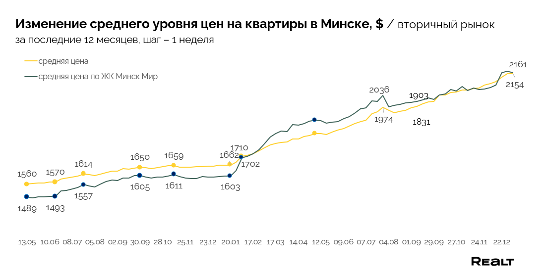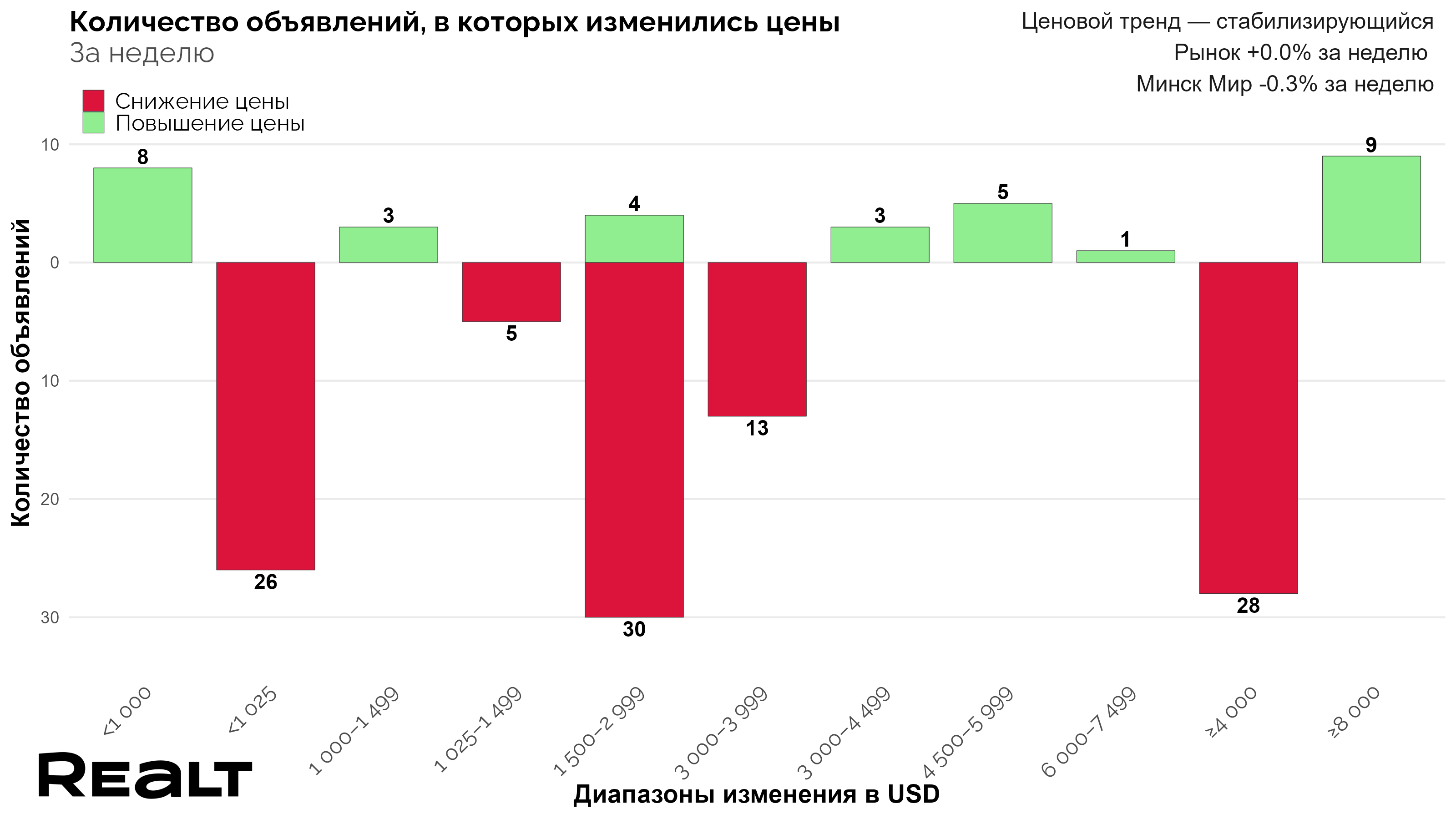 В последнюю же неделю декабря, подешевело всего 2% квартир от общего объема предложения (112 квартир, в среднем на 1000−4000 долларов), а доля случаев увеличения цены вовсе опустилась ниже 1% — стали дороже 49 квартир в среднем на 1000−8000 долларов.