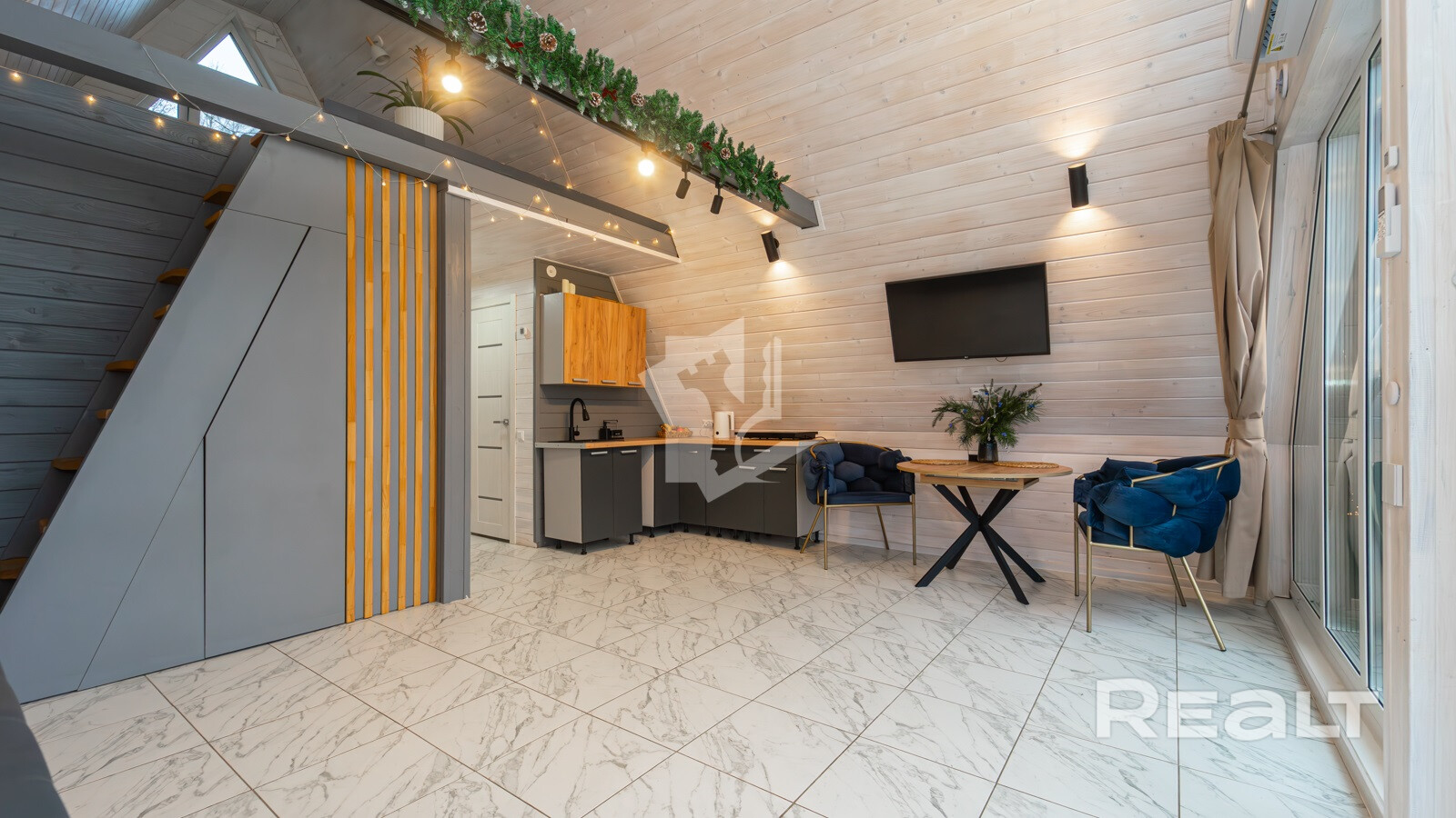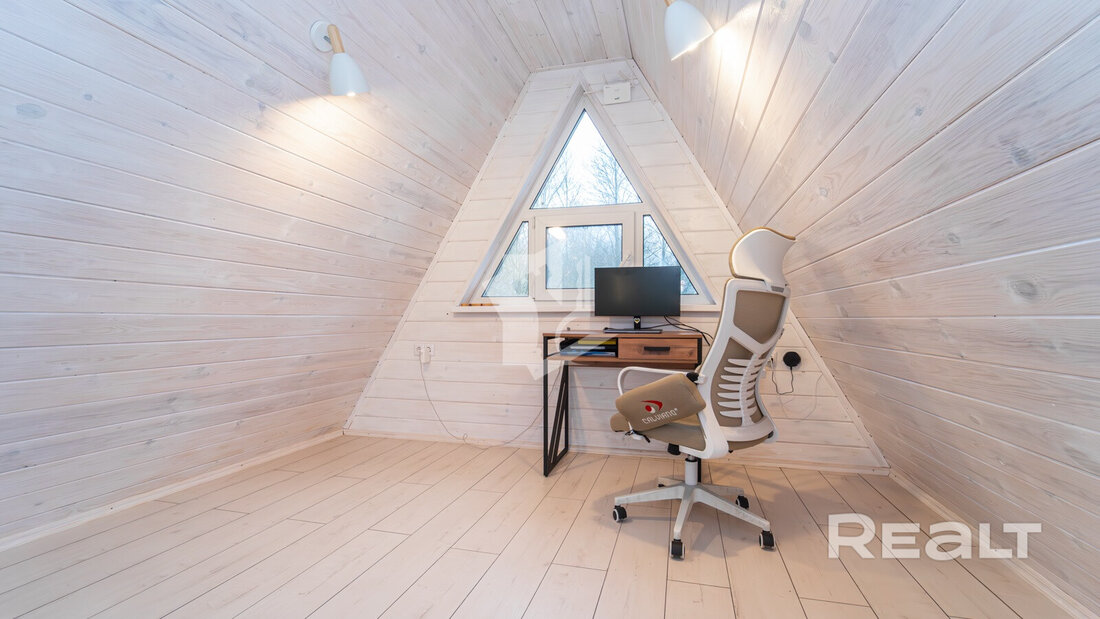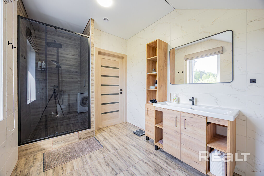 Внутри имеются все удобства: душ и санузел, вода из скважины. Встроенная система «умный дом» обеспечит максимальный комфорт.