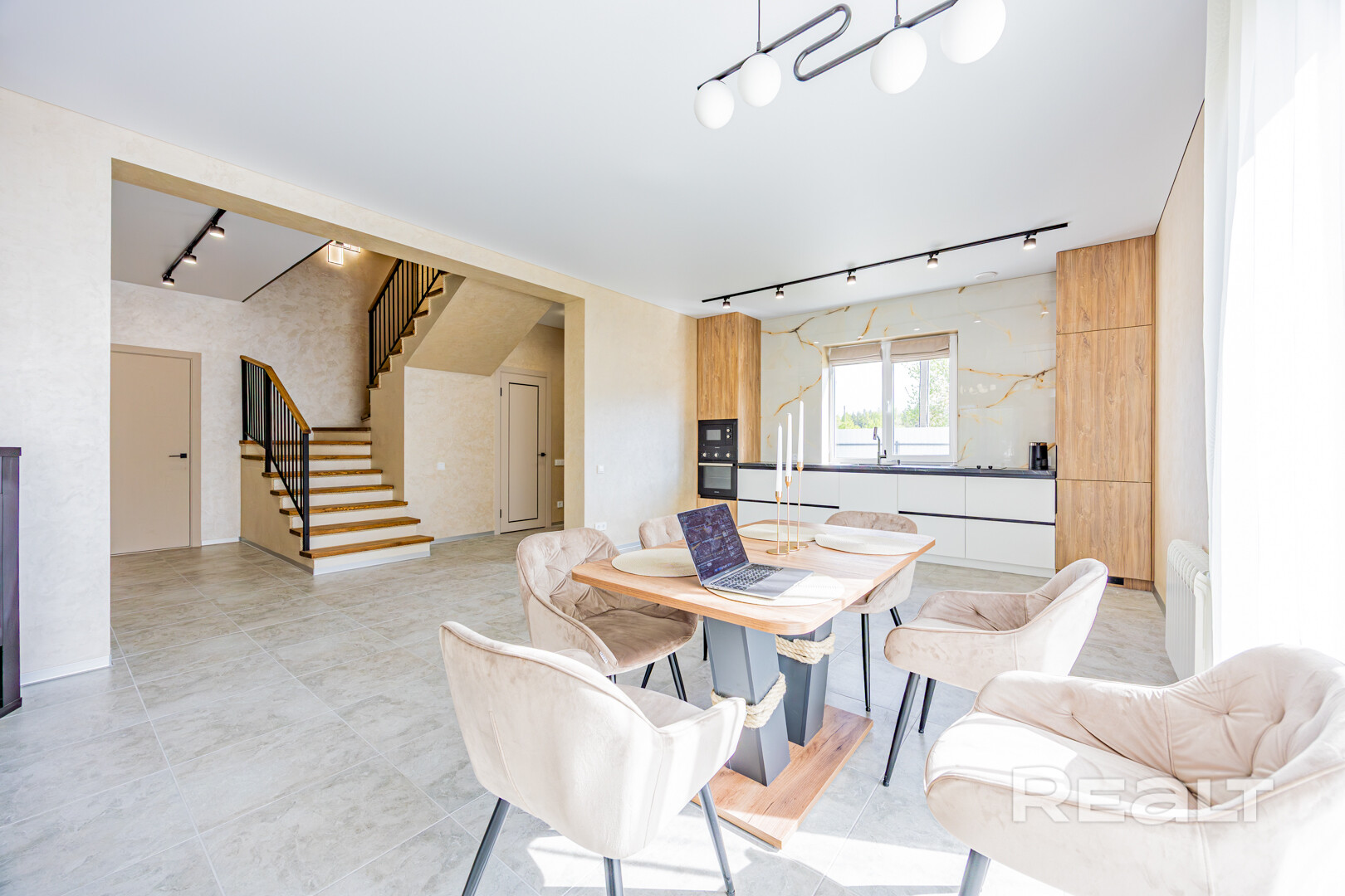 На первом этаже находятся гостиная-кухня с выходом на террасу, гостевая комната, раздельный санузел.
