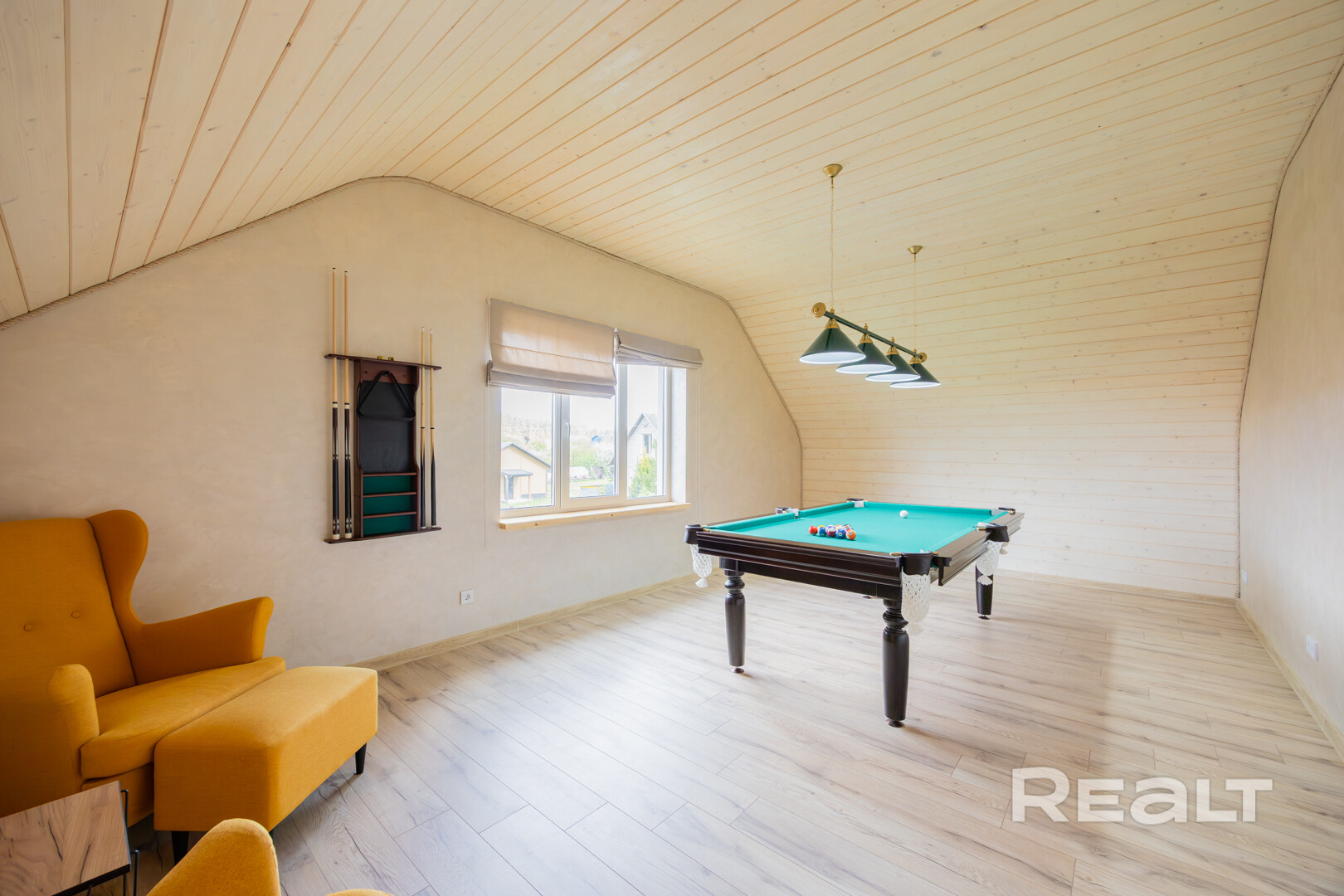 На втором – мастер-спальня, детская, совмещенный санузел, кабинет и бильярдная комната.