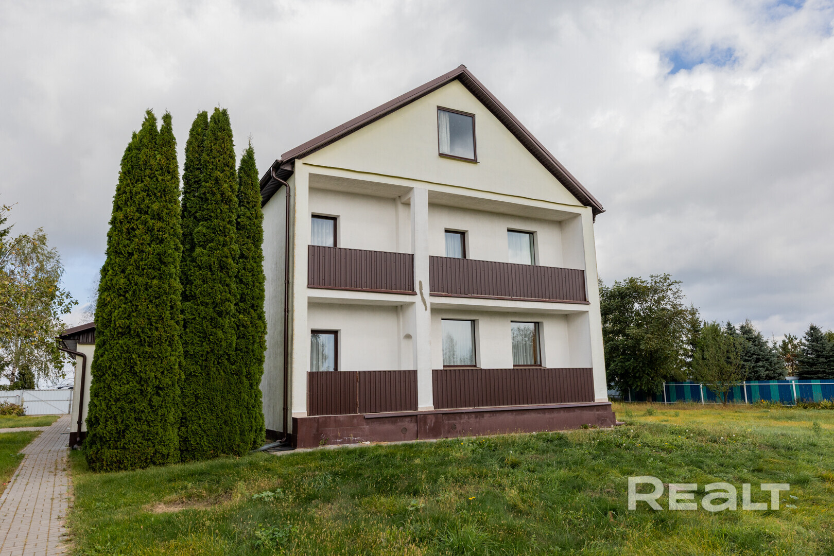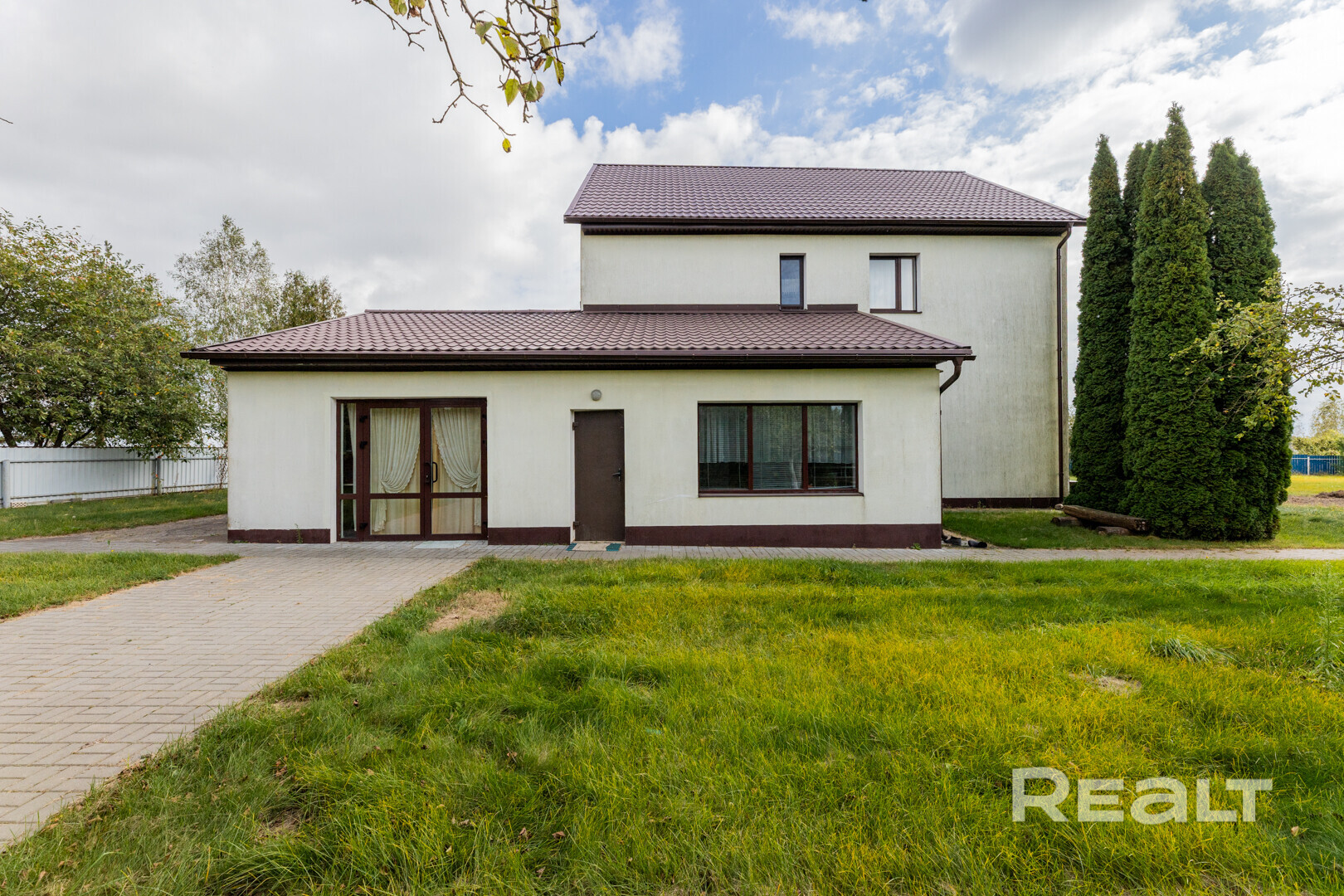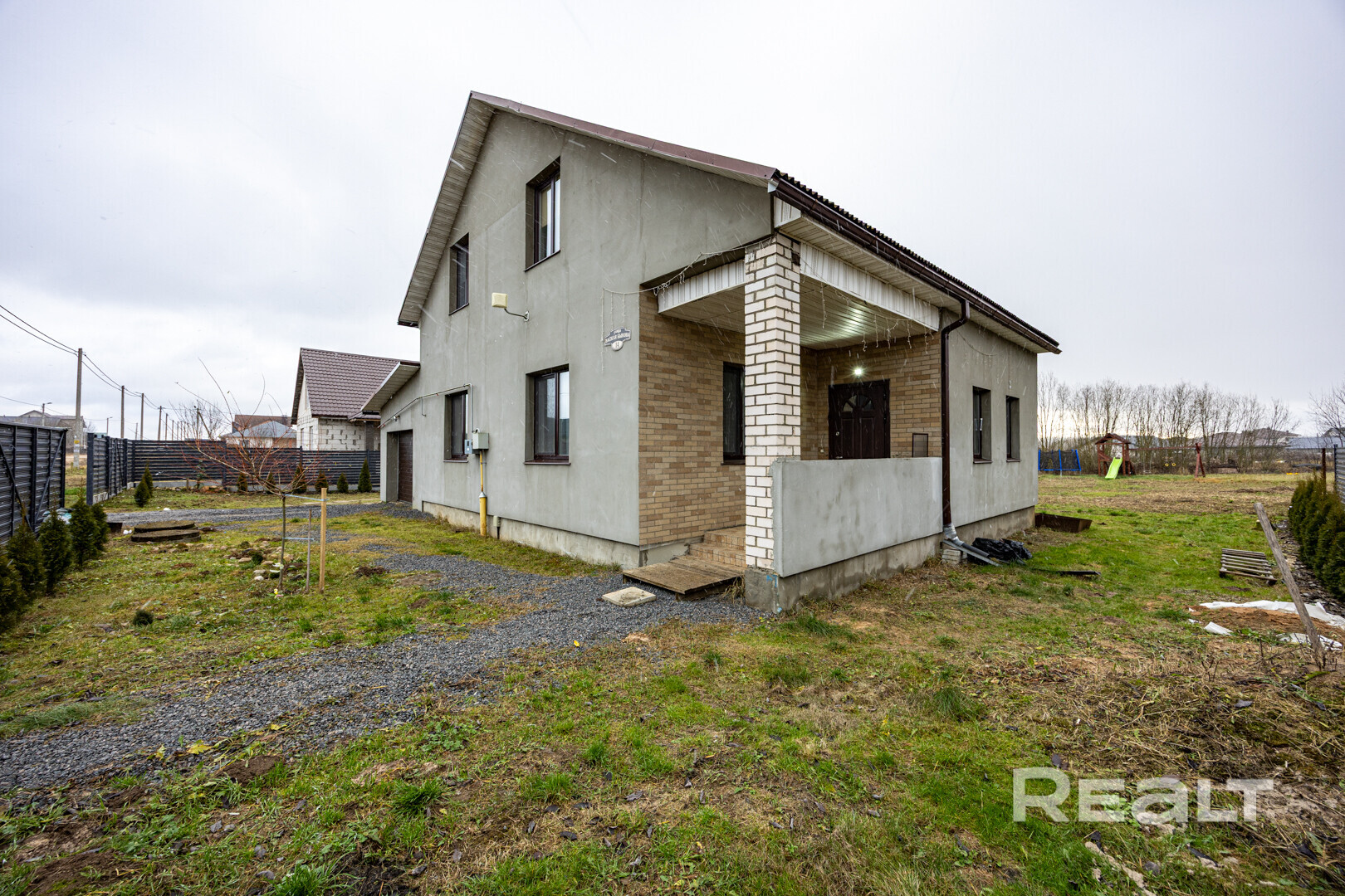 Коттедж двухэтажный, с пристроенным гаражом. Построен из блоков, утеплен и оштукатурен. На крыше – ондулин.