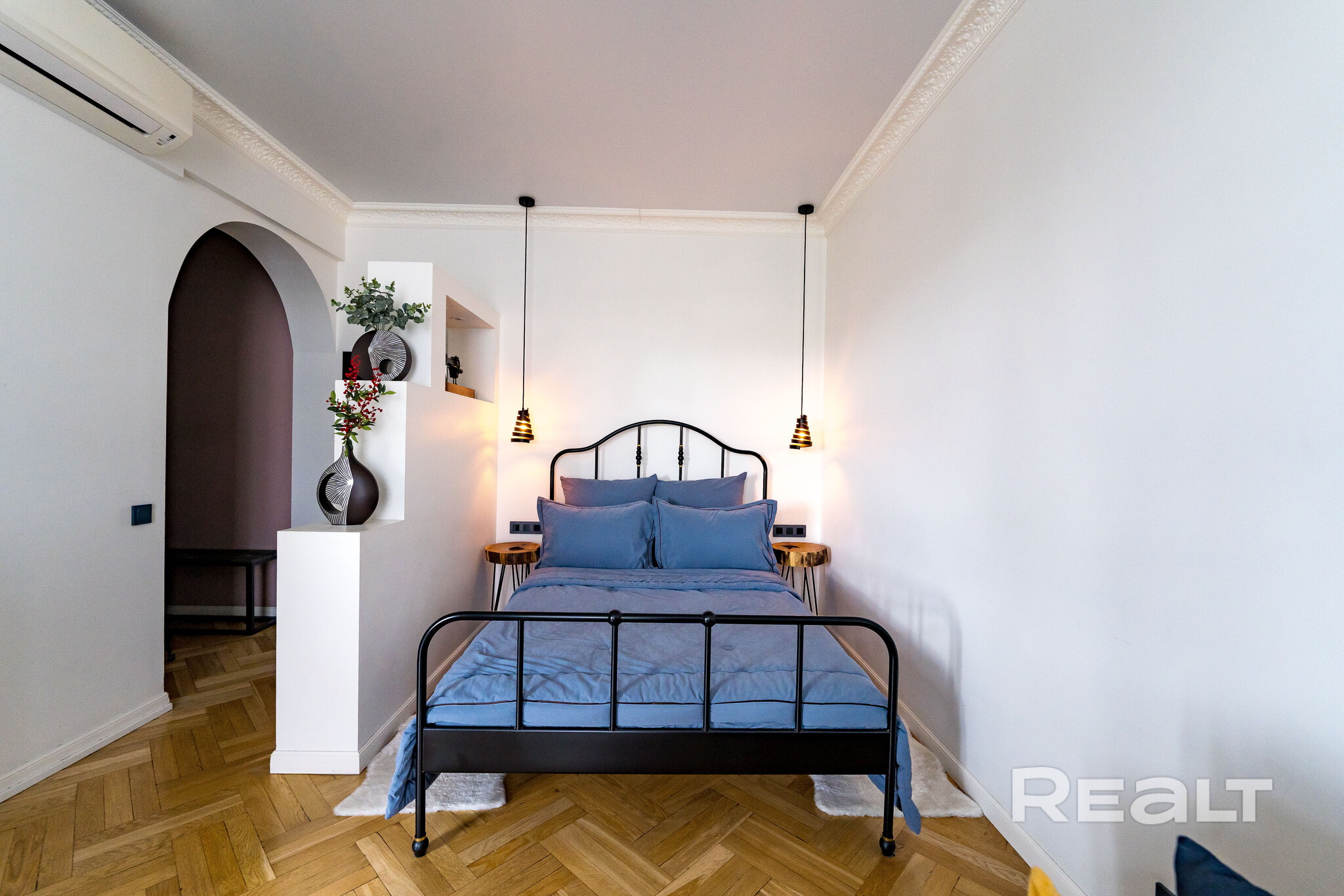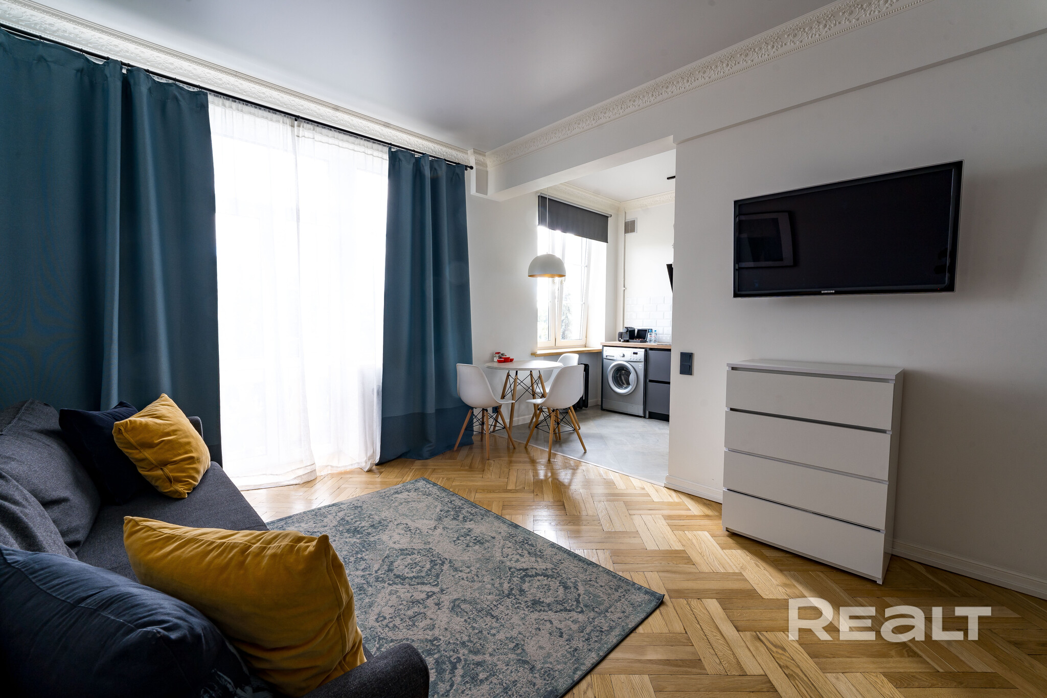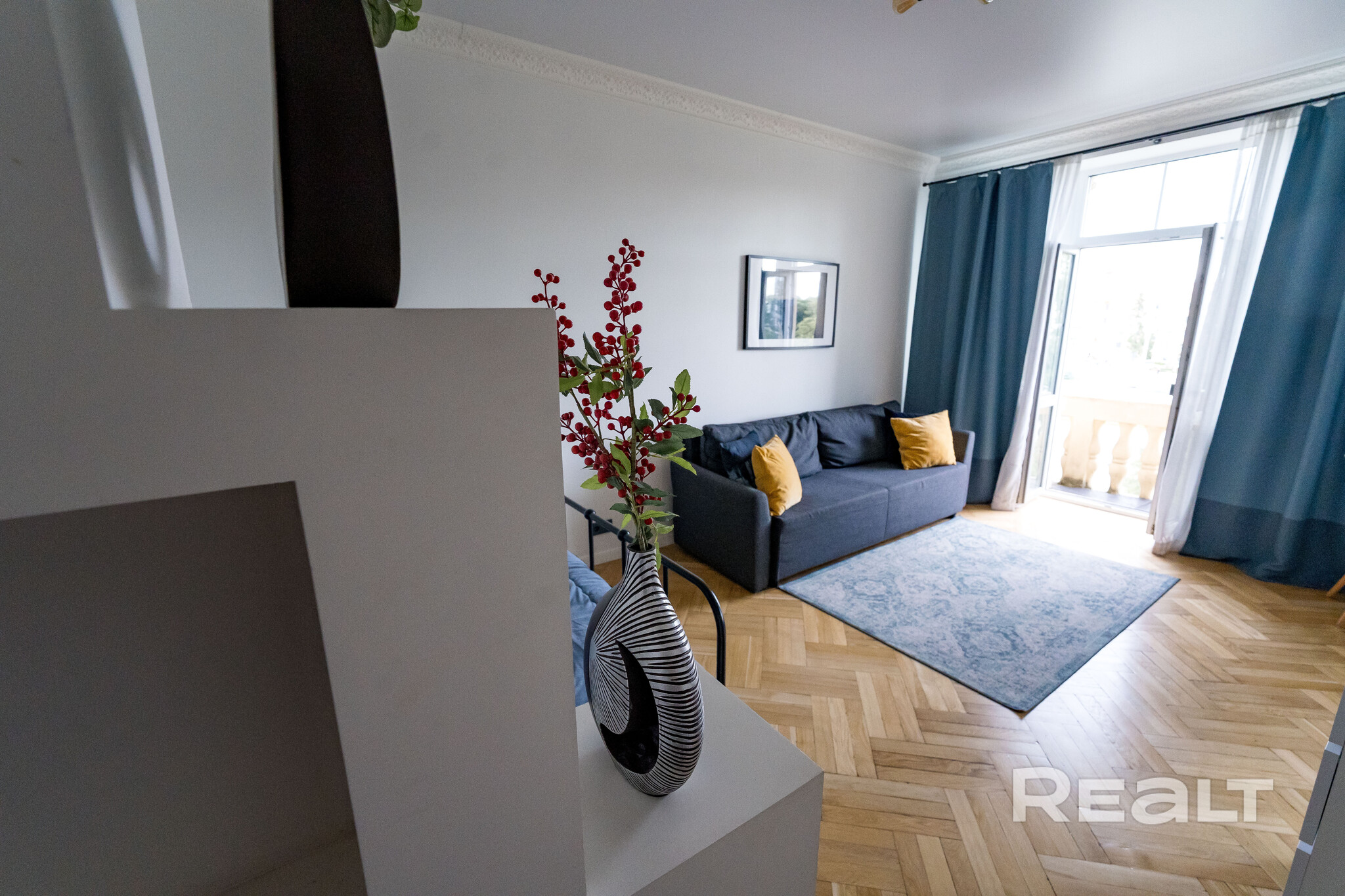 На Realt появилась в продаже однокомнатная квартира с видом на Вечный огонь. Это квартира, в которой сочетается аутентичность сталинки и стильный современный ремонт. Сейчас квартиру сдают на сутки, говорит продавец. Посмотрим этот вариант.