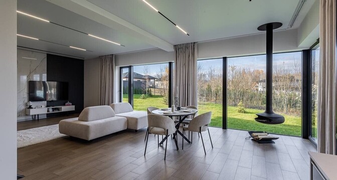 Современный вид имеет и интерьер: светлую отделку и мебель разбавляют теплый цвет пола и природа, за которой можно наблюдать через панорамные окна. Вместе с подвесным камином они наполняют гостиную особенным уютом.