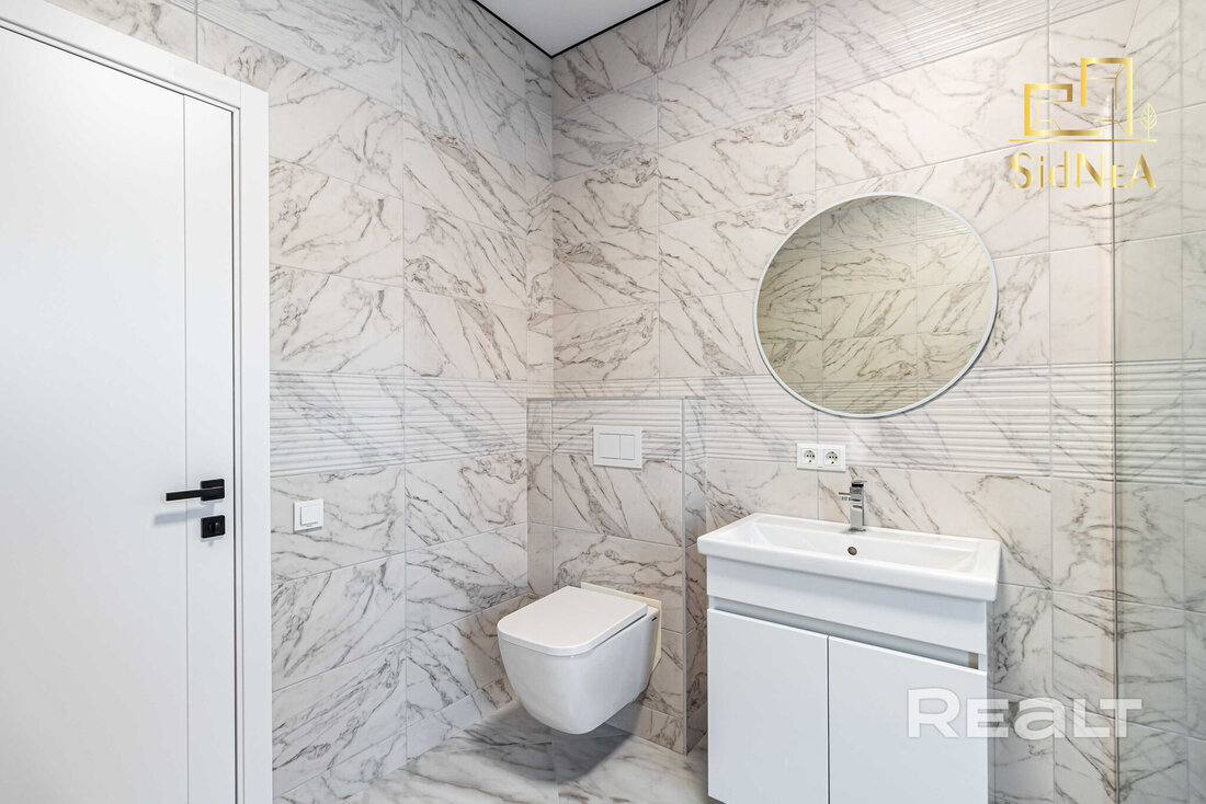 А вот санузел в доме — полностью готов. Он — совмещенный, облицован керамогранитом. Здесь уже установлена вся сантехника и душ. Второй туалет можно организовать в топочной комнате.
