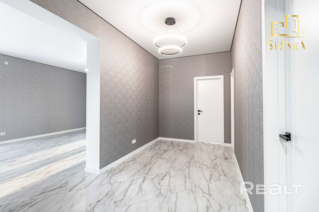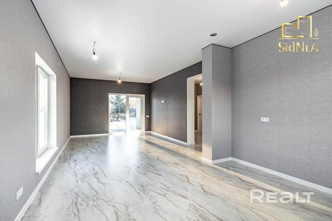 Внутри дачи — абсолютно новая отделка «под ключ». На полу в гостиной — крупноформатный керамогранит с мраморным рисунком, в жилых комнатах — ламинат, наверху — натяжные потолки.