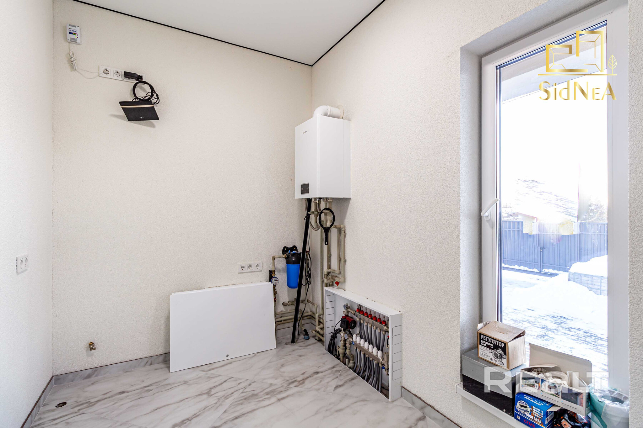Отапливается дом газом (двухконтурный котел). В жилых комнатах установлены радиаторы отопления, а в кухне-гостиной, санузле, топочной и коридоре есть еще и теплые водяные полы.