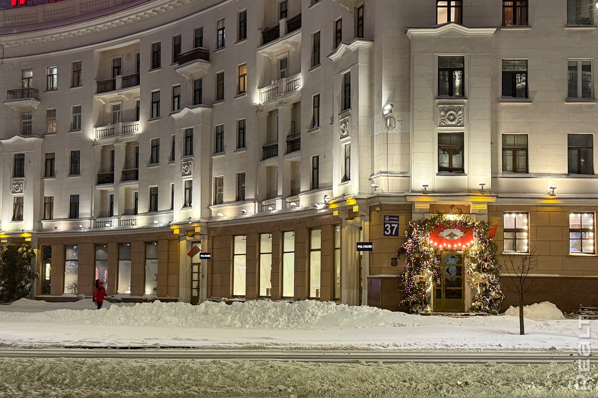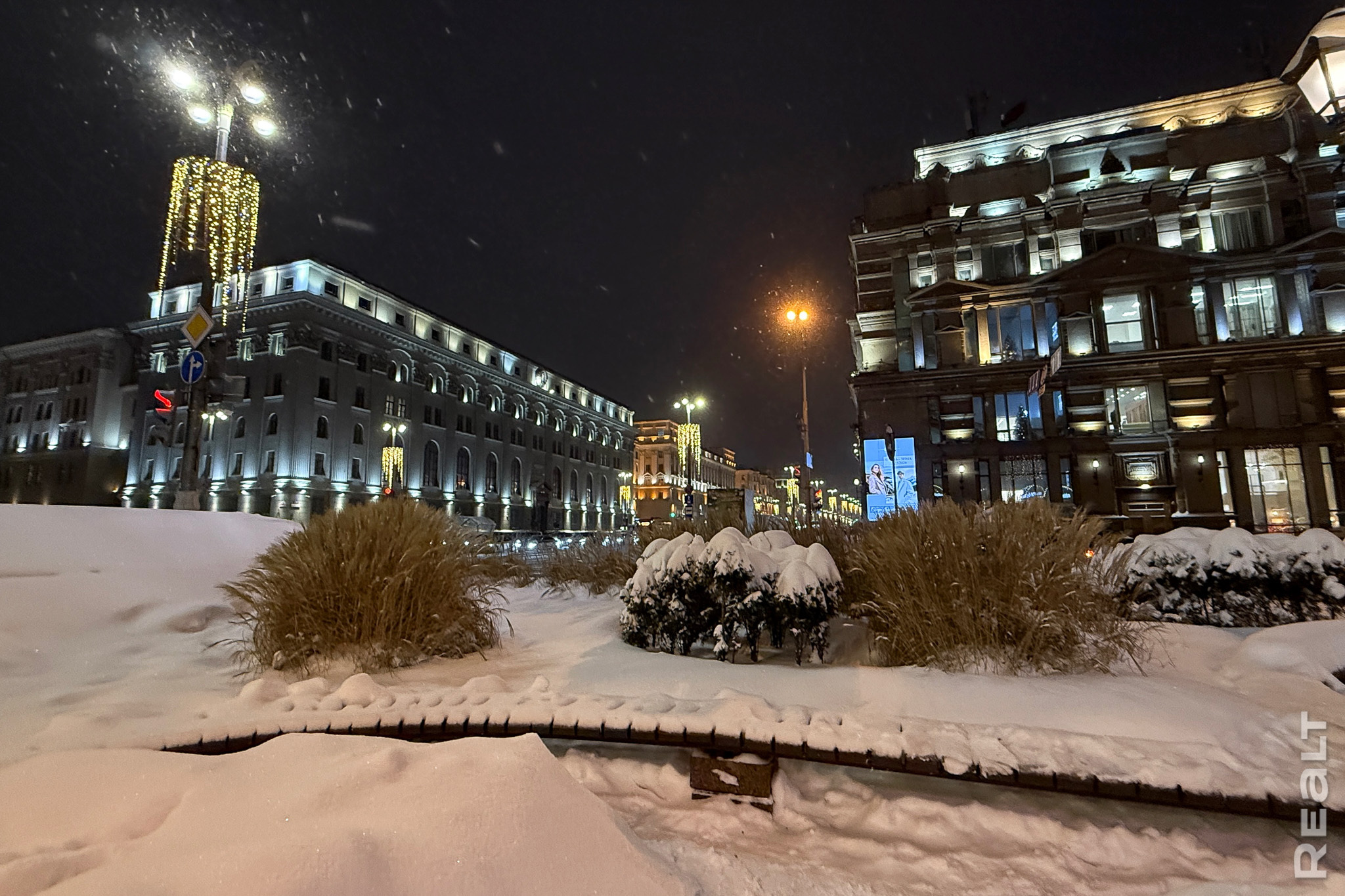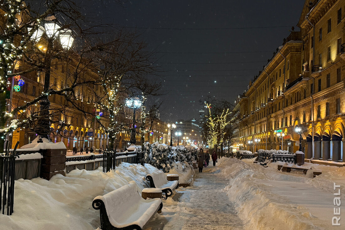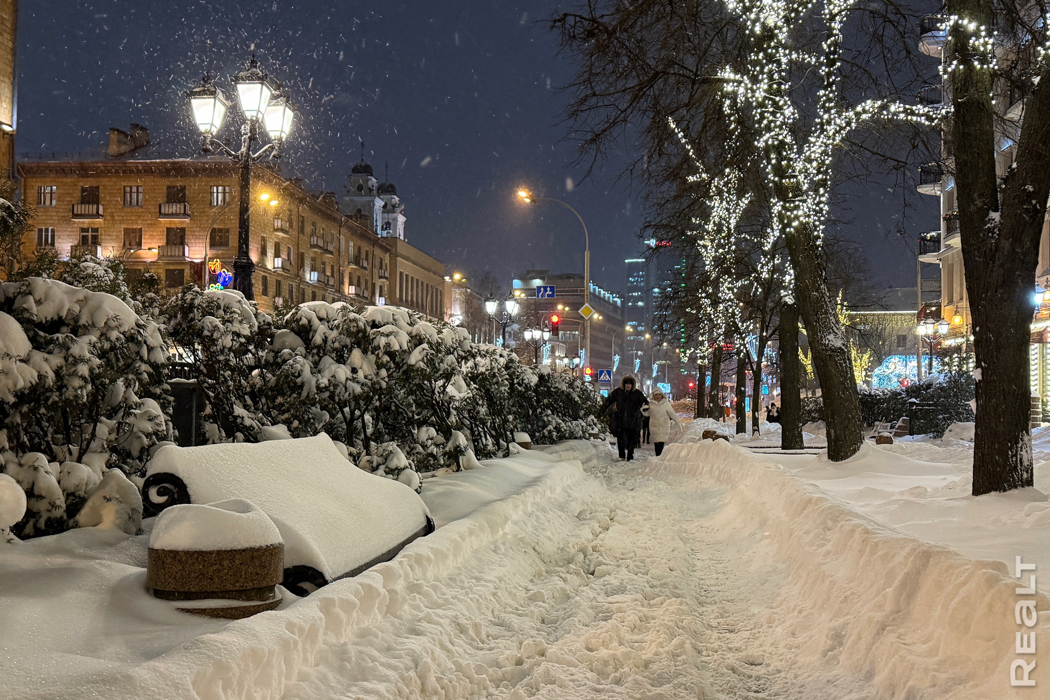 Минск уже второй день выглядит словно в зимней сказке! Огромное количество снега вместе с вечерней иллюминацией создает праздничную атмосферу.