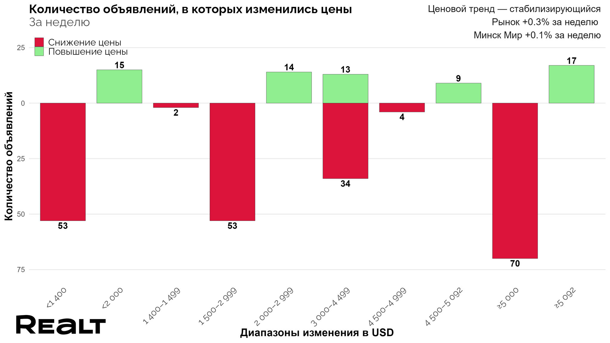Дисбаланс между количеством случаев снижения и поднятия цен по-прежнему сохраняется, с перевесом в сторону первых, что наглядно видно на инфографике ниже. Именно поэтому мы характеризуем текущий ценовой тренд, как стабилизирующийся.