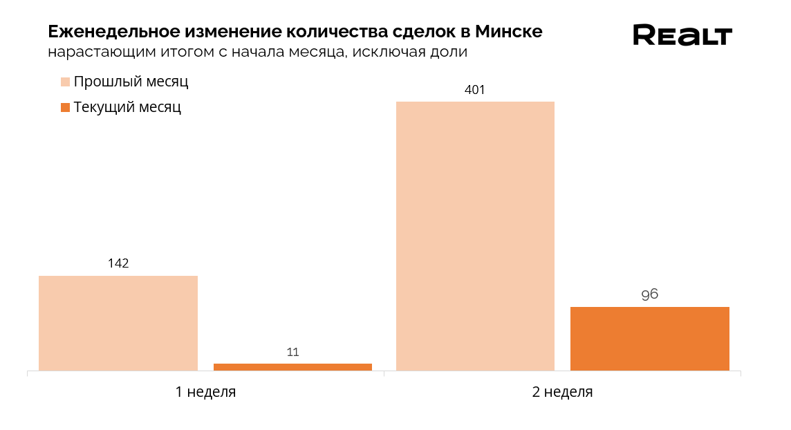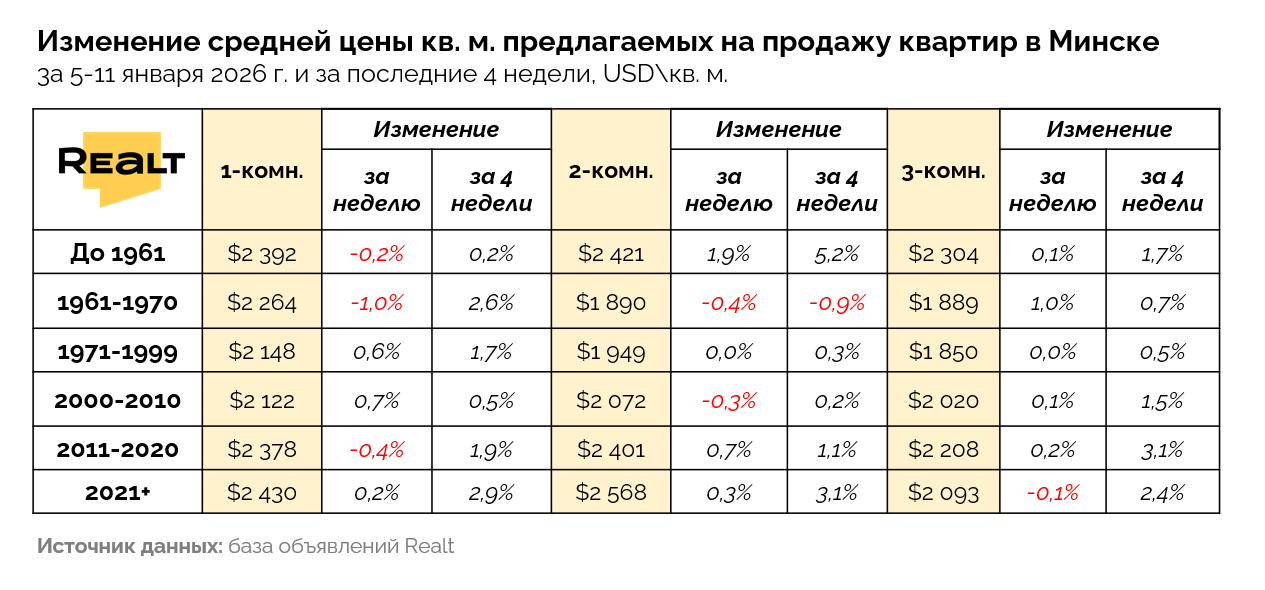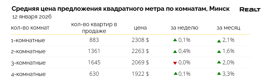 В первую же неделю января, подешевело 5% квартир от общего объема предложения (236 квартир, в среднем на 1000−5000 долларов), а доля случаев увеличения цены всего 2% — стали дороже 107 квартир в среднем на 2000−6000 долларов.