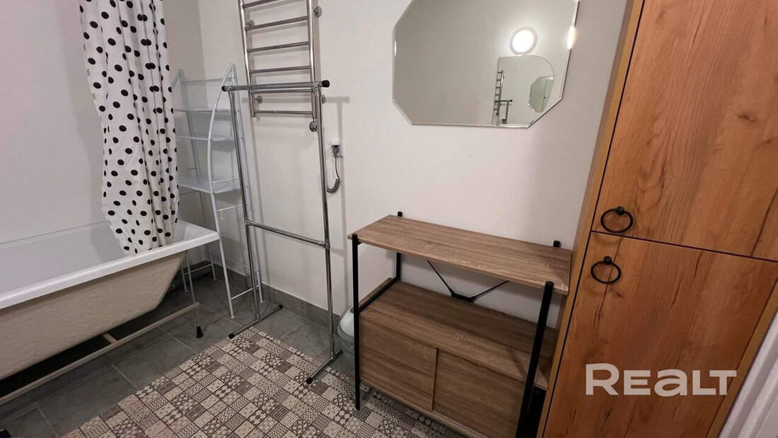 В однокомнатной квартире, по сути — студии, сделан стандартный ремонт. На фотографиях можно заметить светлые стены, линолеум, плитку и сантехнику.