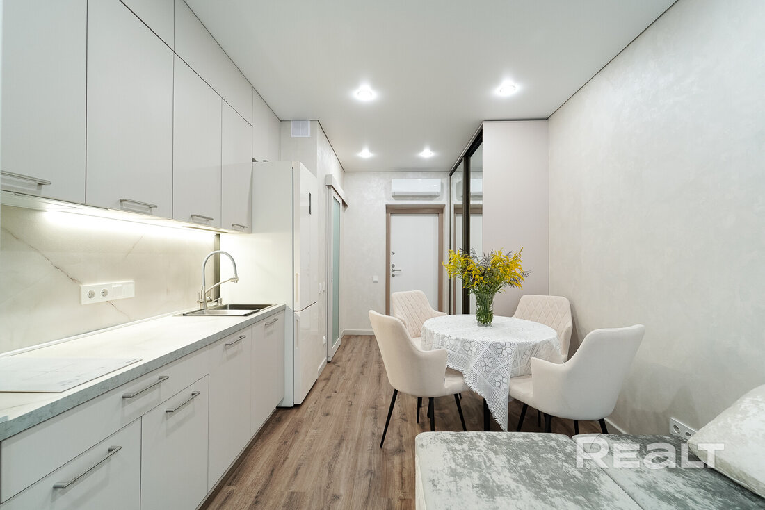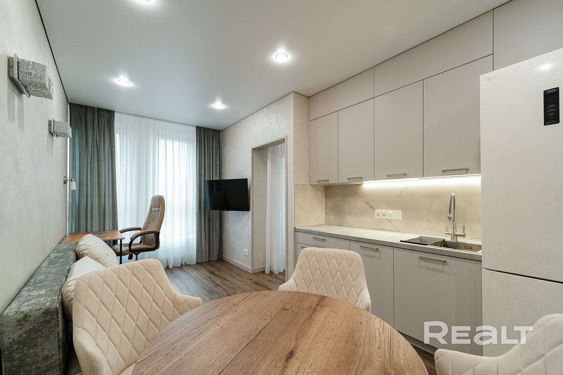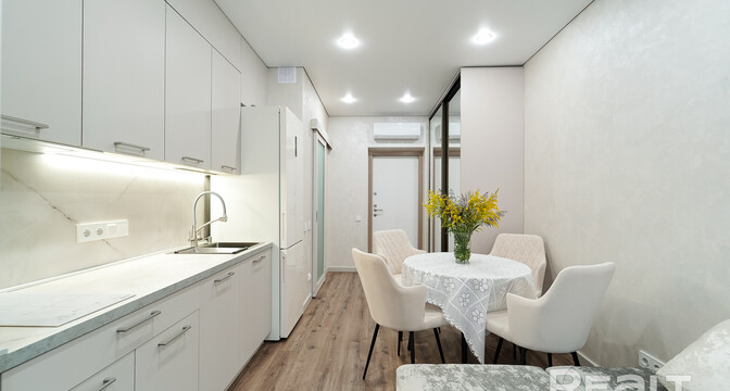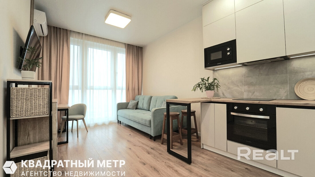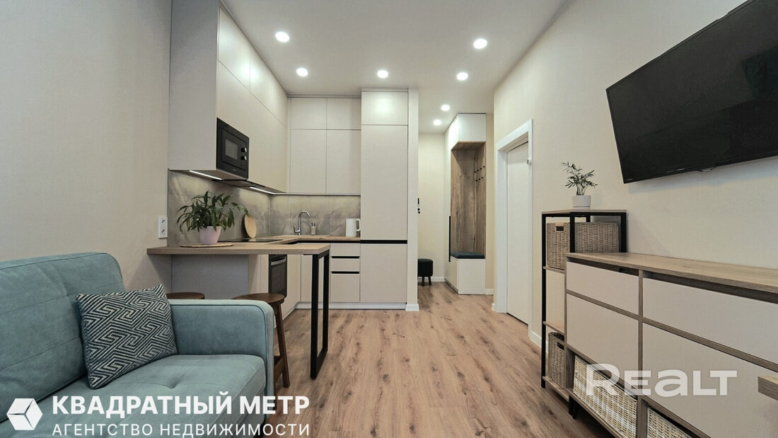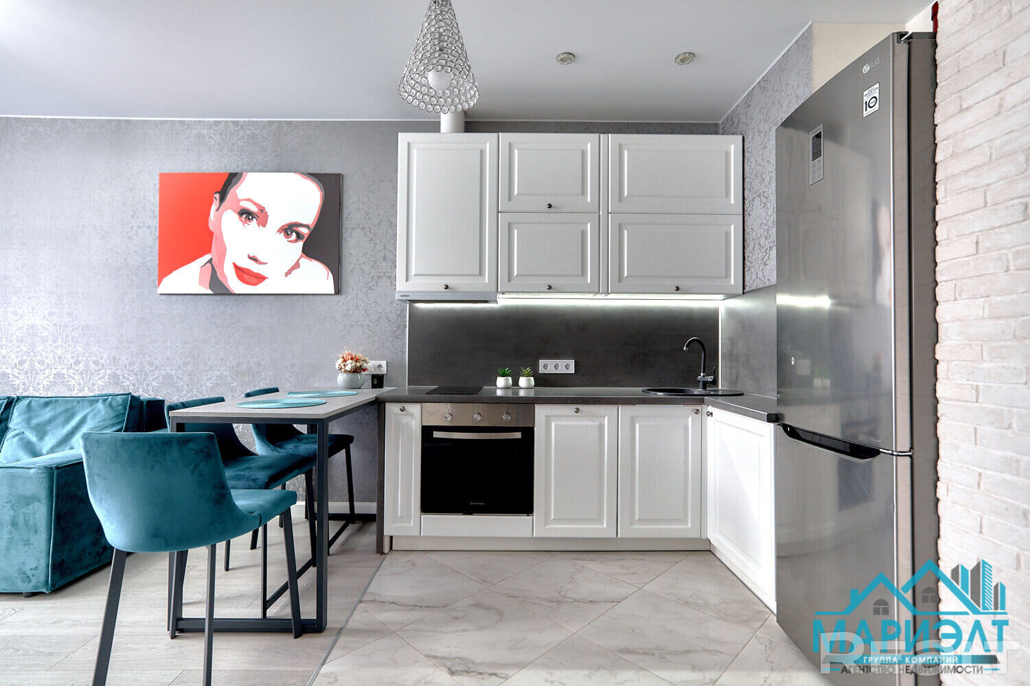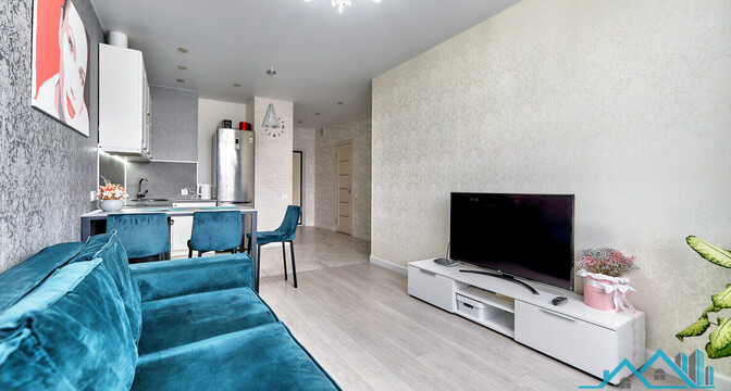 На полу в квартире уложен ламинат, стены оклеены однотонными обоями, потолок матовый натяжной с точечными светильниками и парящими линиями. В кухне из техники есть индукционная варочная поверхность, духовой шкаф, вытяжка, посудомоечная машина и холодильник. В гостиной зоне — обеденная группа, диван со спальным местом и телевизор. Здесь же есть выход на лоджию.