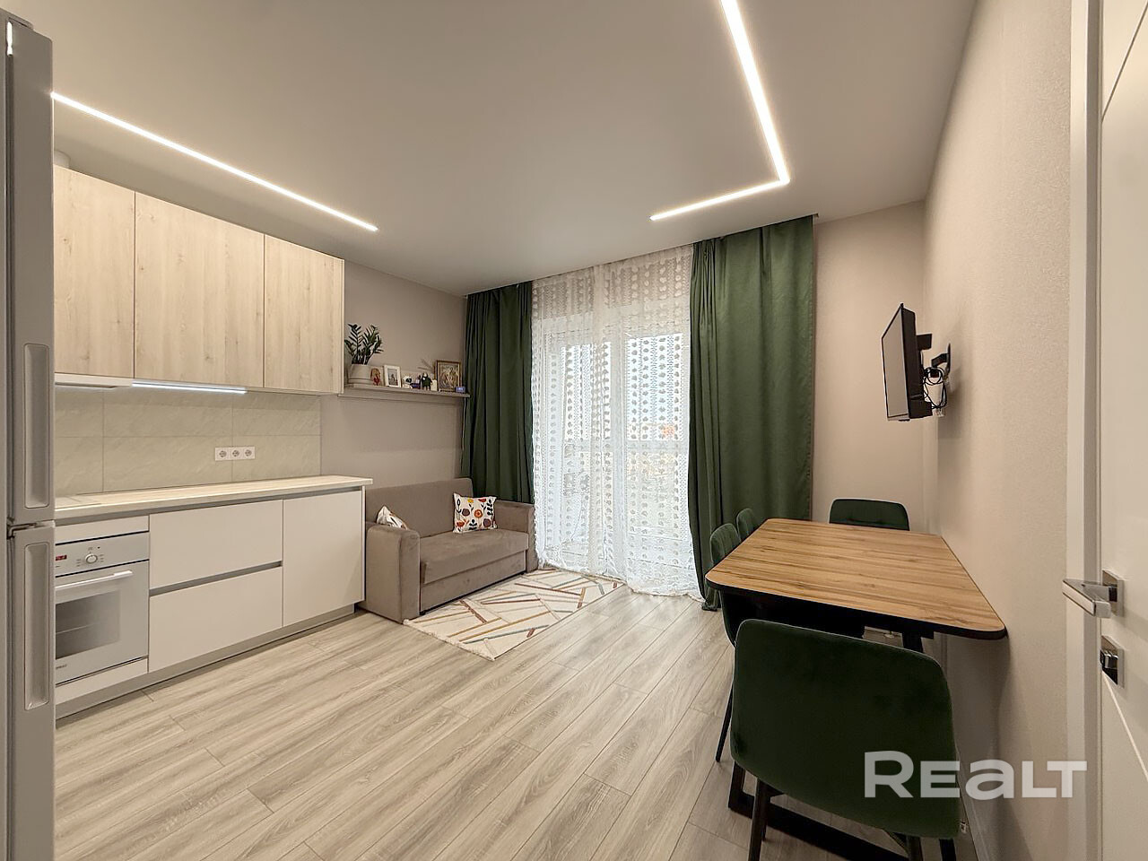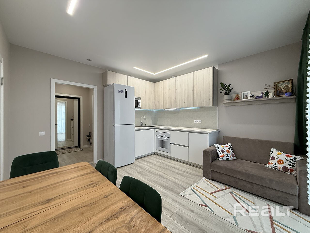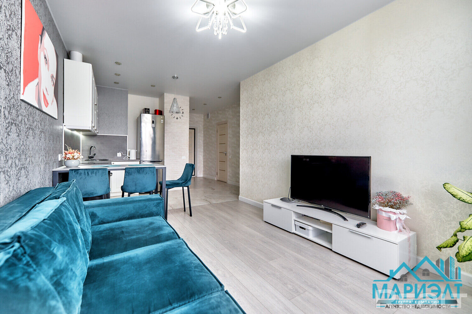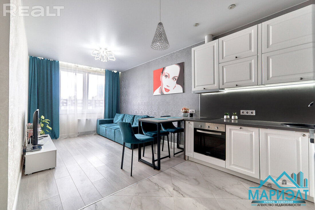 На полу в квартире уложен ламинат, стены оклеены однотонными обоями, потолок матовый натяжной с точечными светильниками и парящими линиями. В кухне из техники есть индукционная варочная поверхность, духовой шкаф, вытяжка, посудомоечная машина и холодильник. В гостиной зоне — обеденная группа, диван со спальным местом и телевизор. Здесь же есть выход на лоджию.