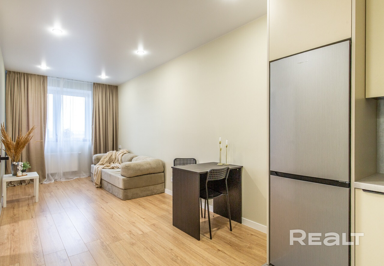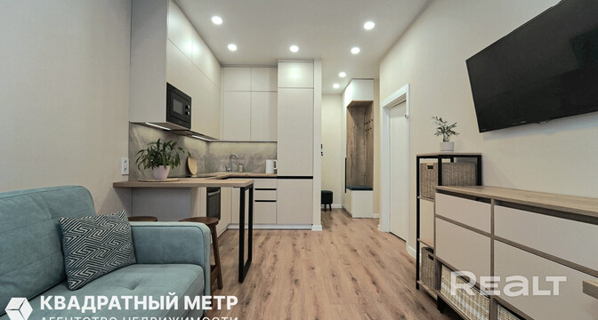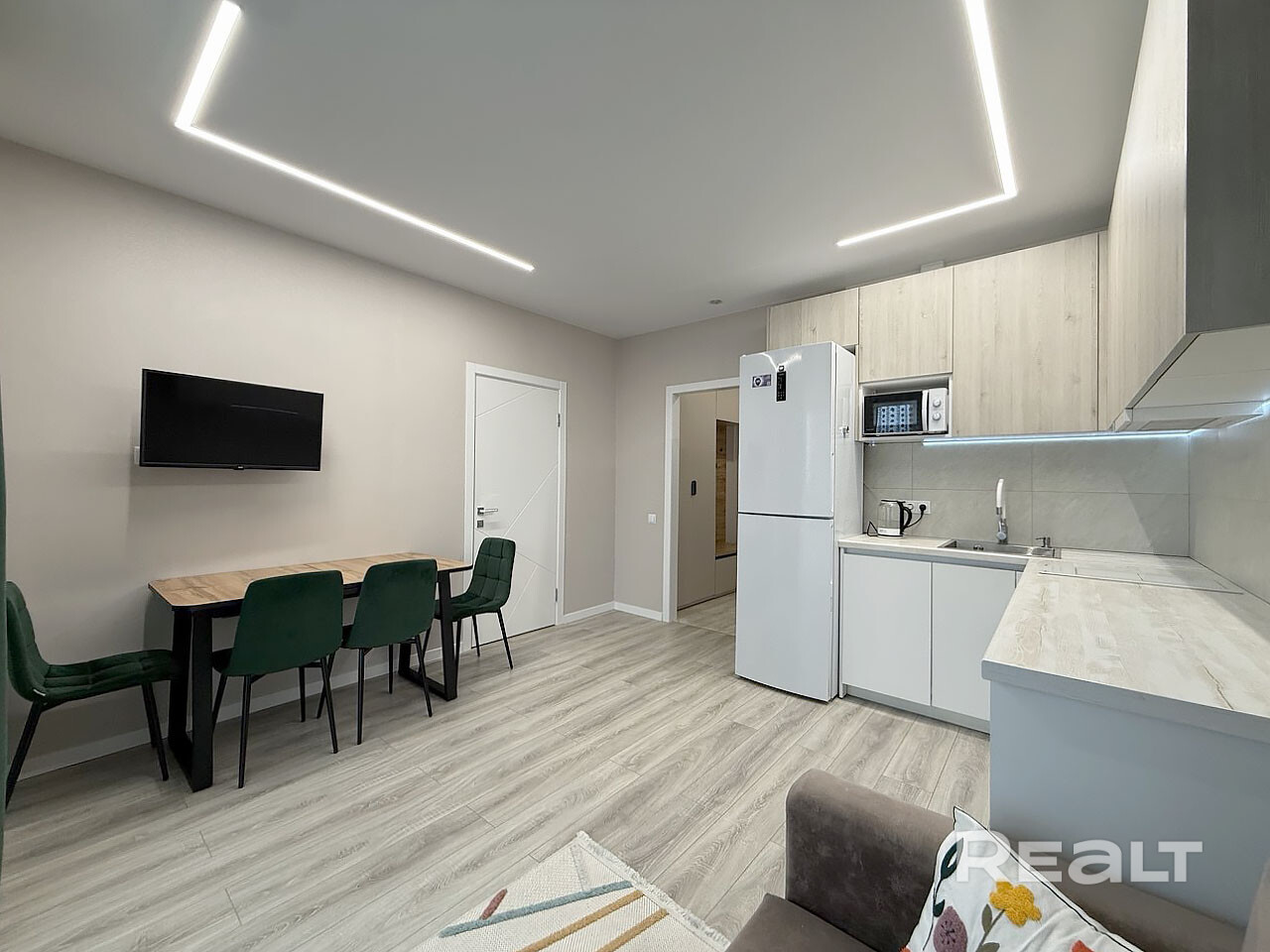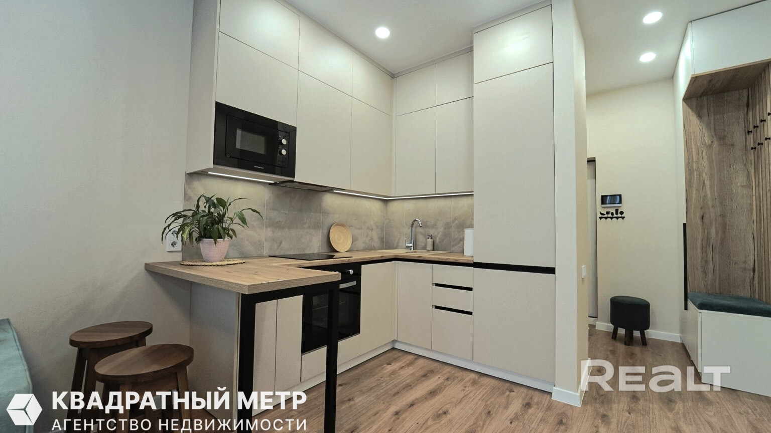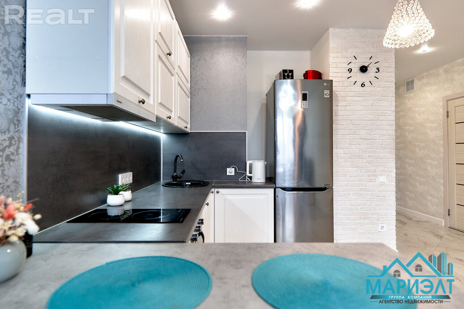 На полу в квартире уложен ламинат, стены оклеены однотонными обоями, потолок матовый натяжной с точечными светильниками и парящими линиями. В кухне из техники есть индукционная варочная поверхность, духовой шкаф, вытяжка, посудомоечная машина и холодильник. В гостиной зоне — обеденная группа, диван со спальным местом и телевизор. Здесь же есть выход на лоджию.