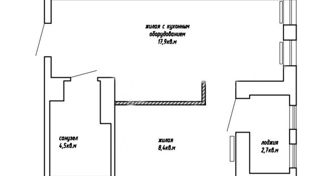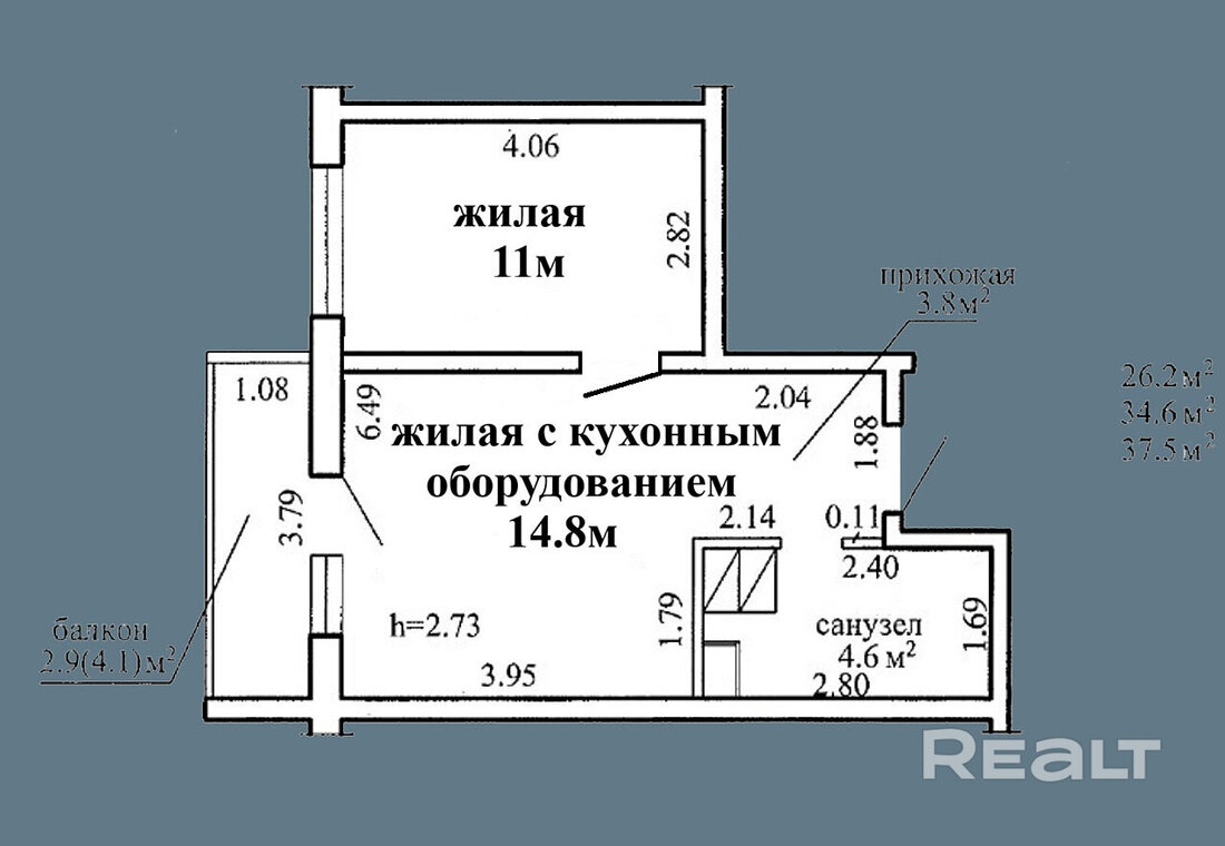 Квартира расположена на четвертом этаже из 23-х. Общая площадь — 37,5 квадрата, а на жилой метраж приходится 26 метров. В квартире возвели перегородку — это позволило оборудовать кухню-гостиную площадью около 15 квадратов и отдельную спальню метражом 11 квадратов.