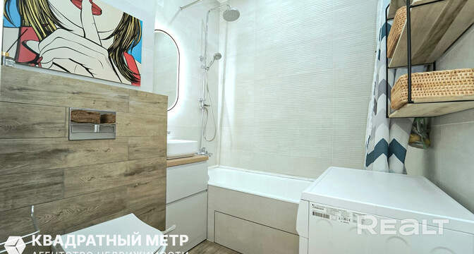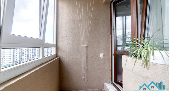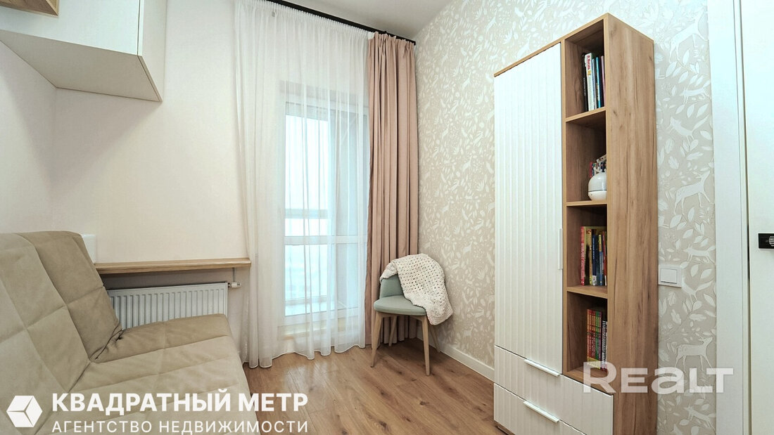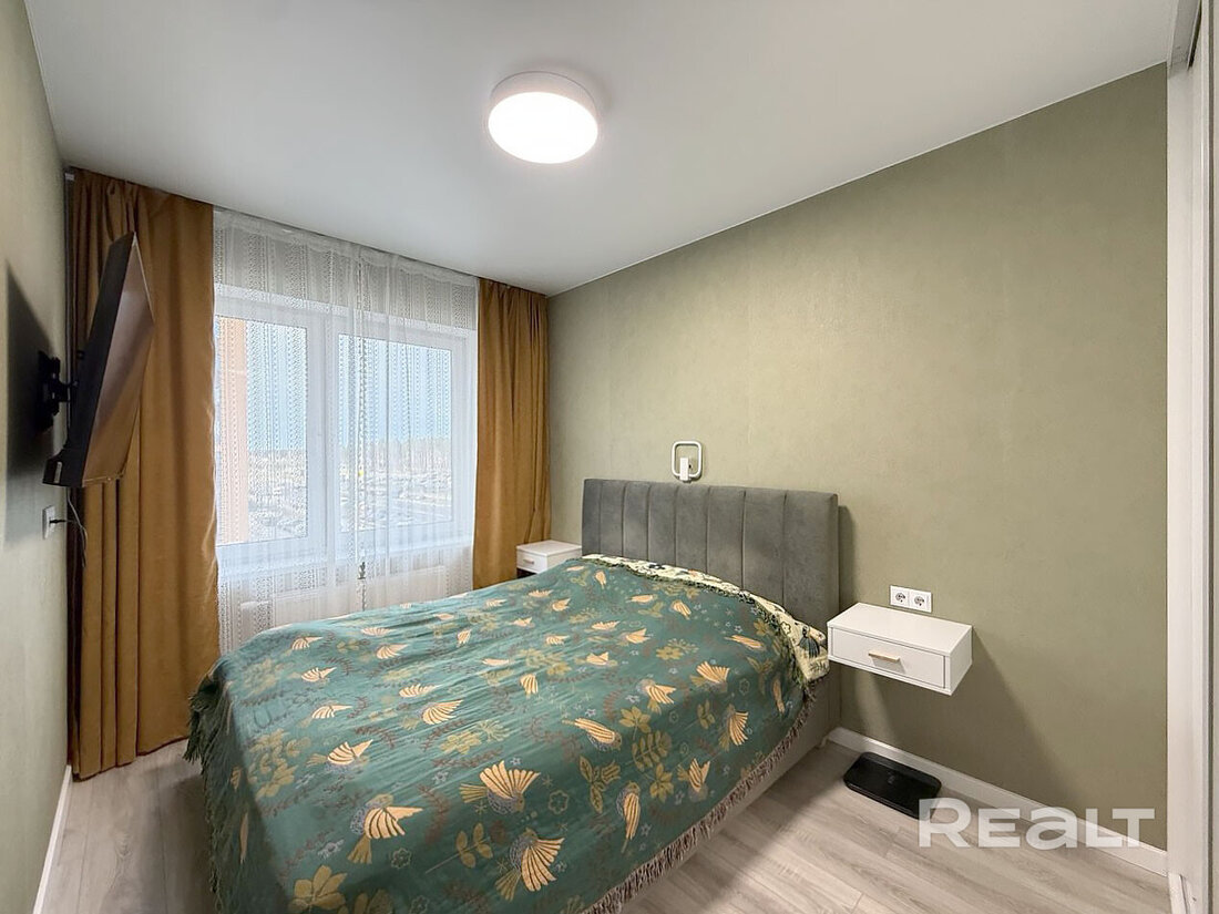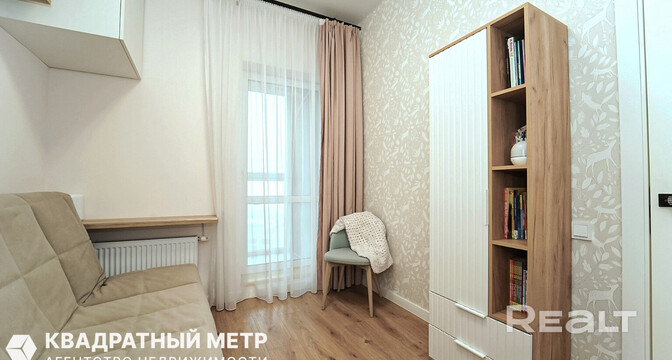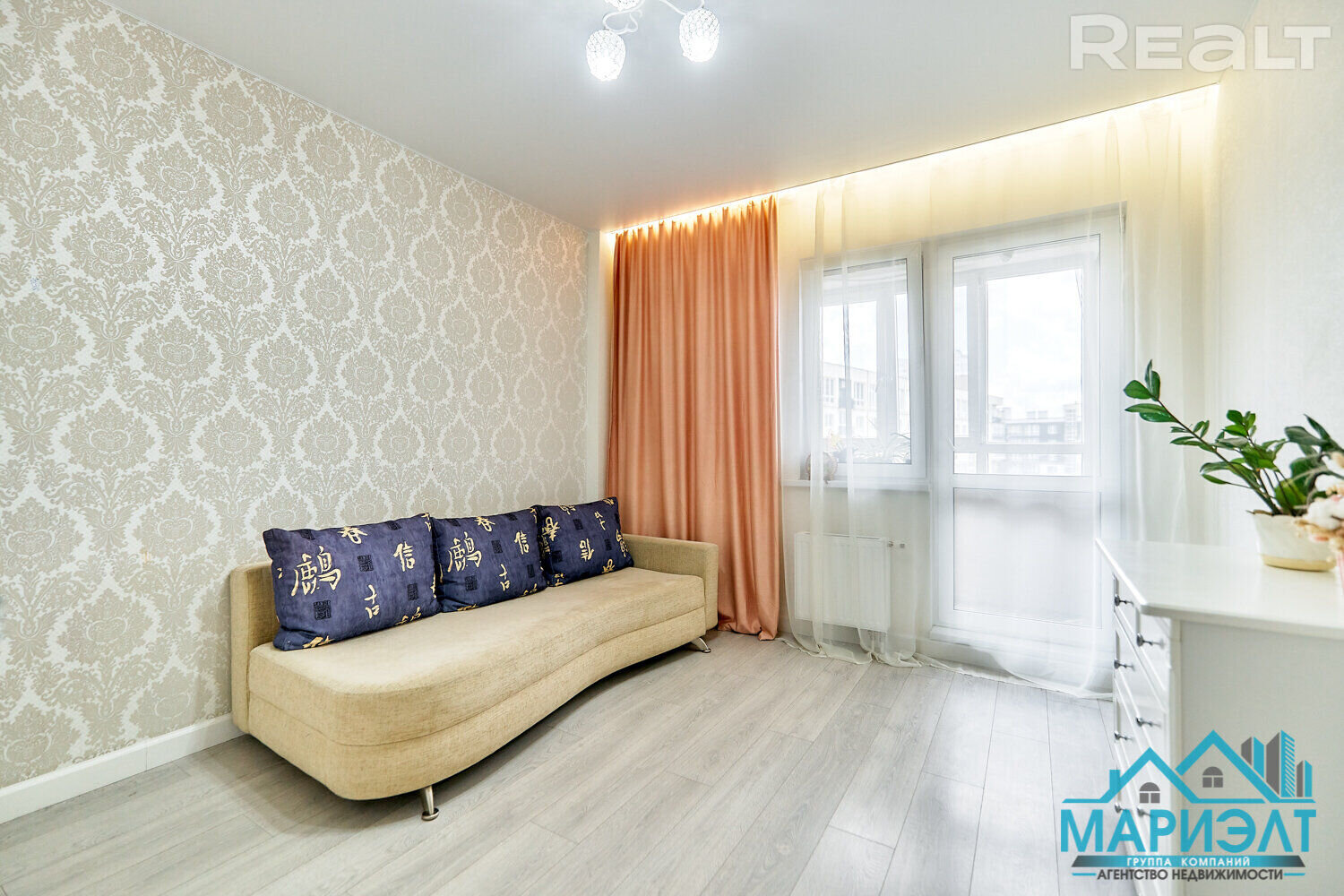 Квартира расположена на 16-м этаже 16-этажного дома 2020 года постройки. Из необычных для Минск-Мира бонусов — потолки в этой евродвушке трехметровые. Общая площадь — 34 квадрата. На этой площади удалось выделить изолированную комнату метражом 9 квадратов.