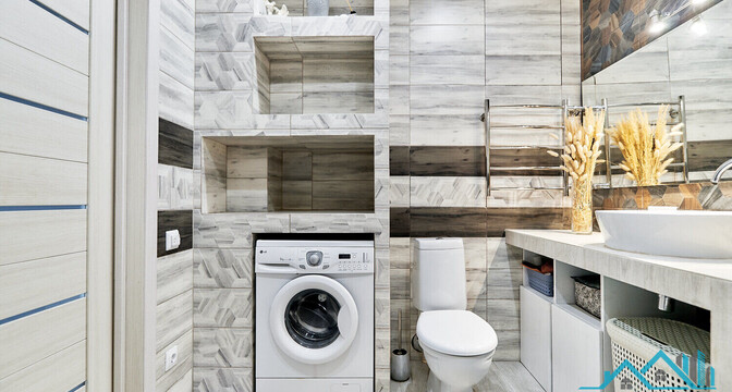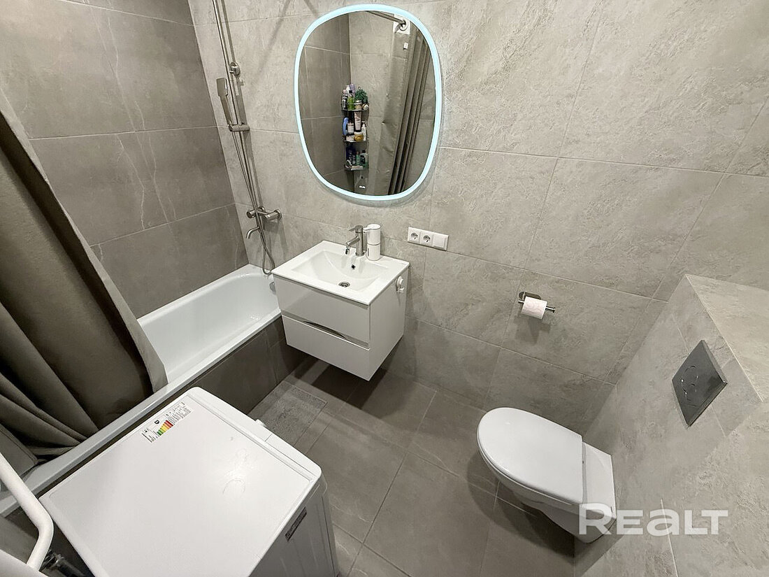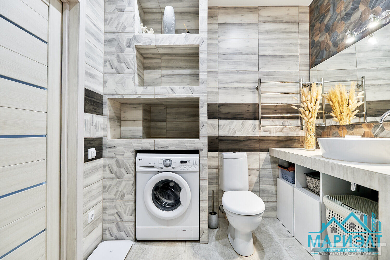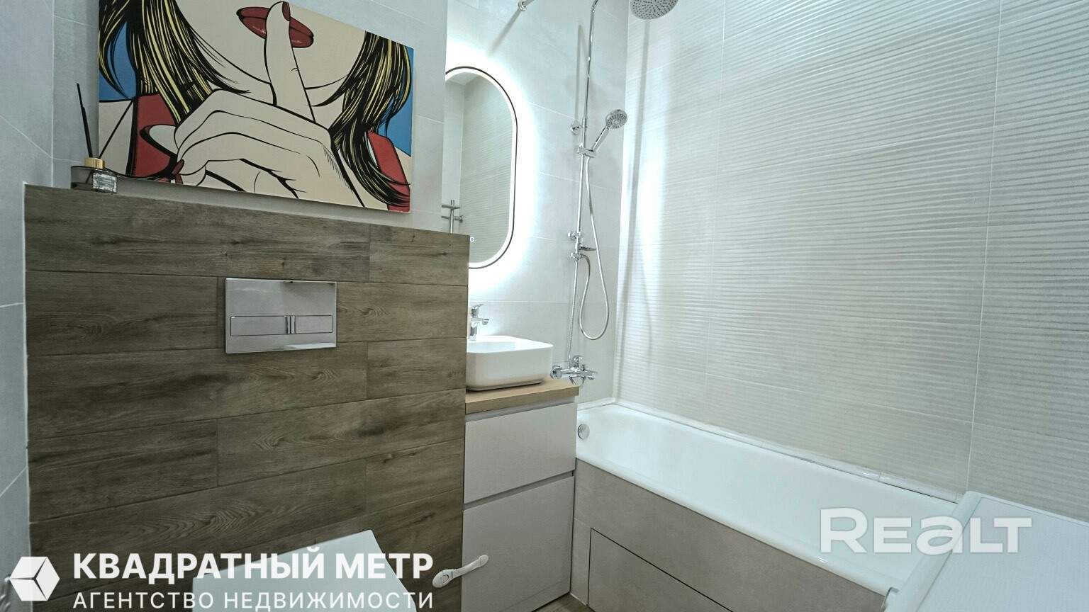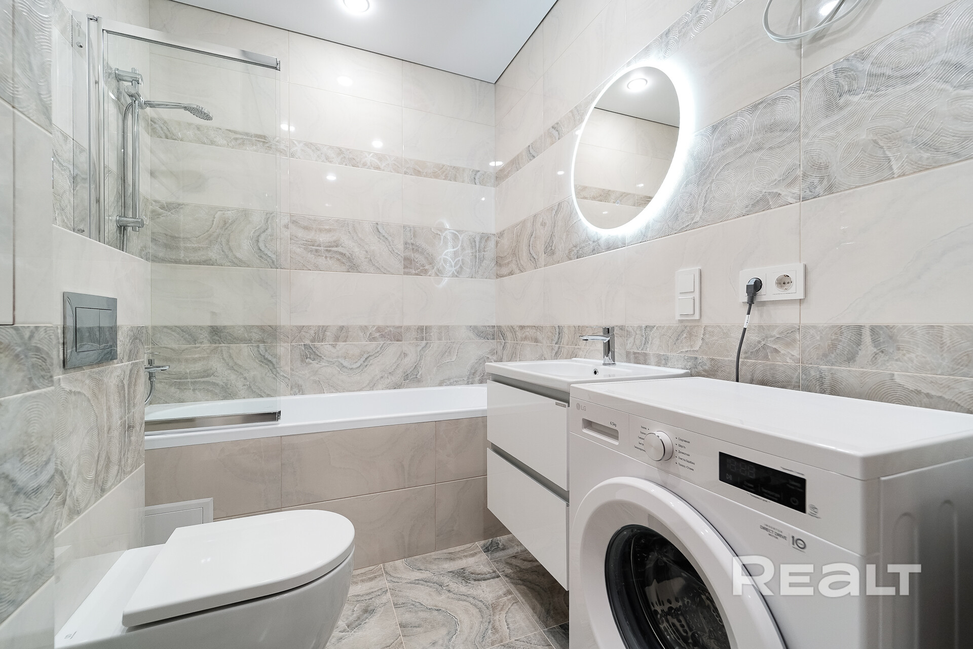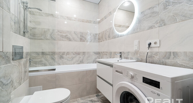 В совмещенном санузле установлена инсталляция, подвесной унитаз, металлическая ванна увеличенного размера. Есть подвесная тумба с раковиной, зеркало с подсветкой, стирально-сушильная машинка LG. Все коммуникации спрятаны за скрытым люком.
