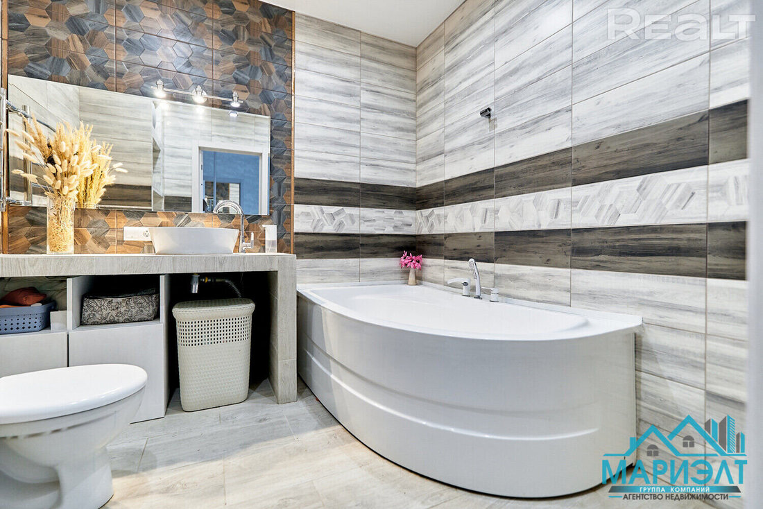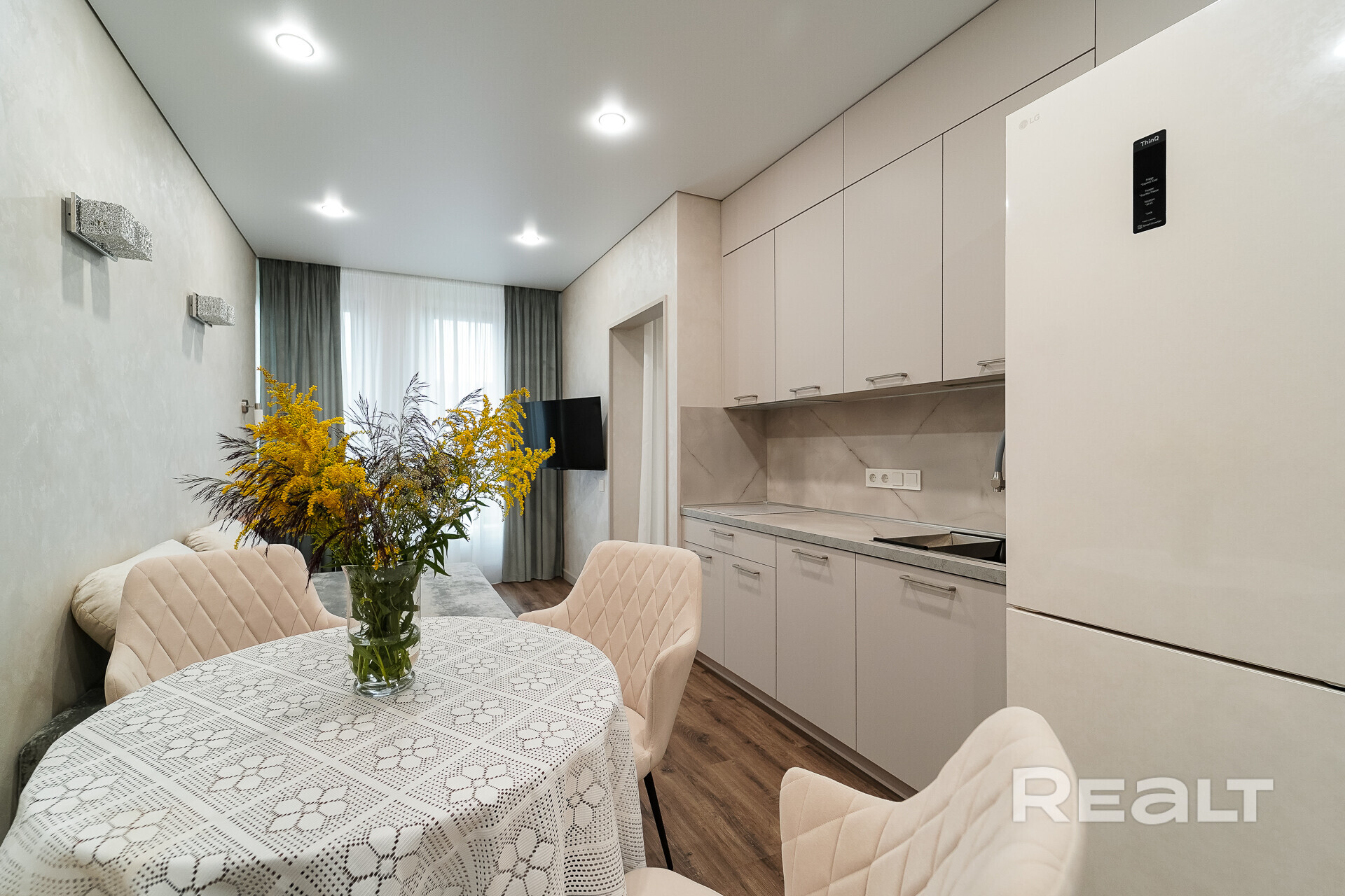 Ремонт в квартире выполнен по дизайн-проекту, интерьер в бежевых оттенках. Встроенная мебель выполнена на заказ из МДФ. В кухне из техники есть индукционная варочная панель, духовой шкаф, встроенный холодильник, посудомоечная машина, вытяжка и микроволновая печь. В спальне выход на остекленную лоджию. В совмещенном санузле установлена ванна.