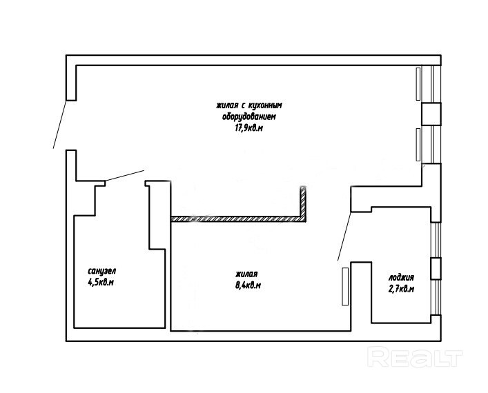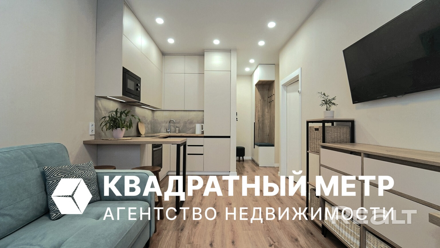 Общая площадь — 33 квадрата. На стенах декоративная штукатурка, на полу кварц-винил, в санузле пол с подогревом. Установлен кондиционер. Вся техника на расширенной пятилетней гарантии. В жилой комнате сделан ремонт, но мебели нет. Есть застекленная лоджия. Санузел совмещенный. Есть кладовая на цокольном этаже.