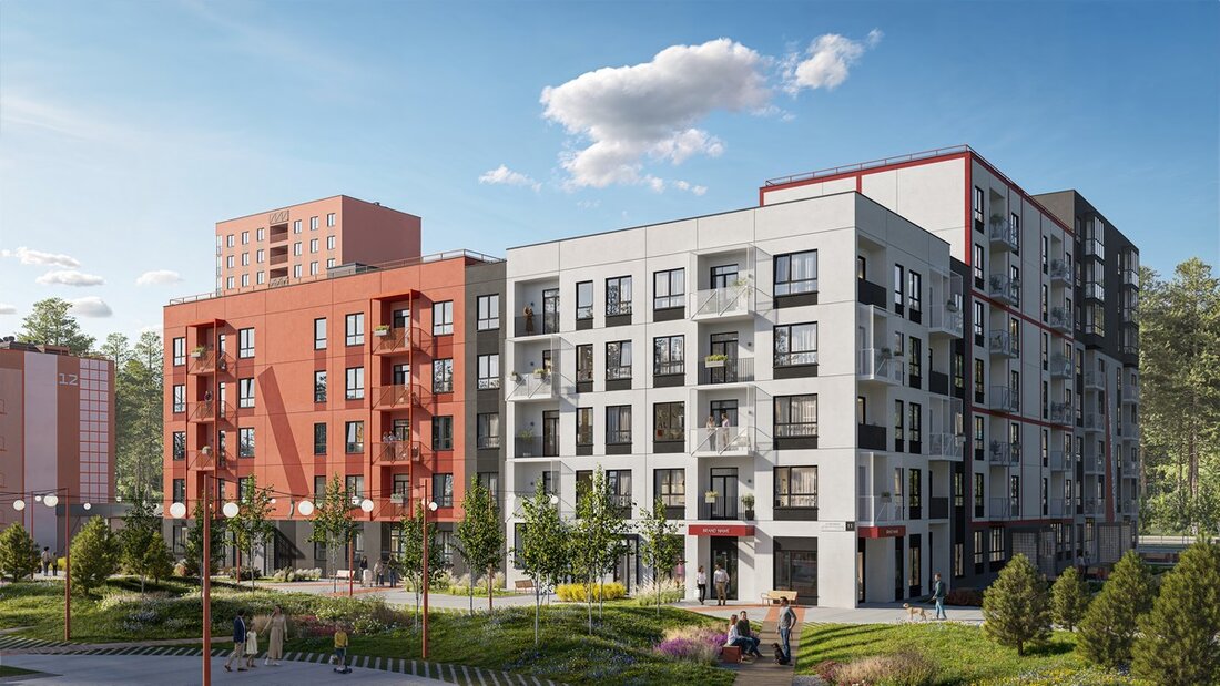 Дом в стиле конструктивизма будет выделяться разноэтажным объемом, контрастными цветами и фасадной графикой. Всего в доме будет 98 квартир разных форматов, в том числе студии площадью 27−28 квадратов. Их дополняют квартиры евроформата с двумя, тремя и четырьмя жилыми комнатами. Предусмотрена и единственная в доме пятикомнатная 95-метровая квартира.
