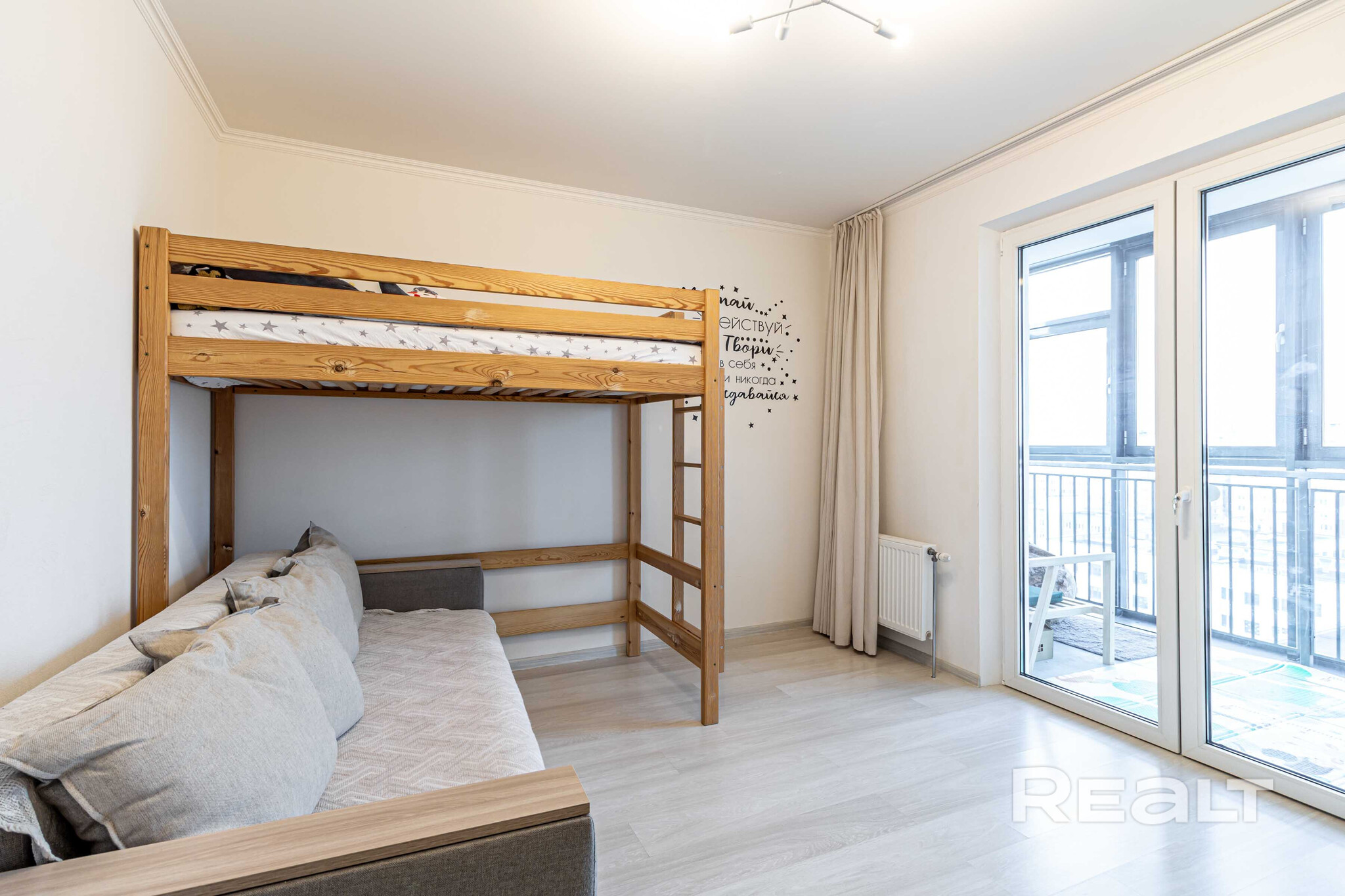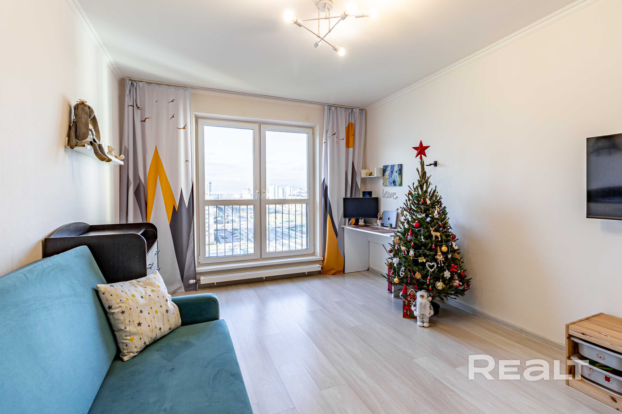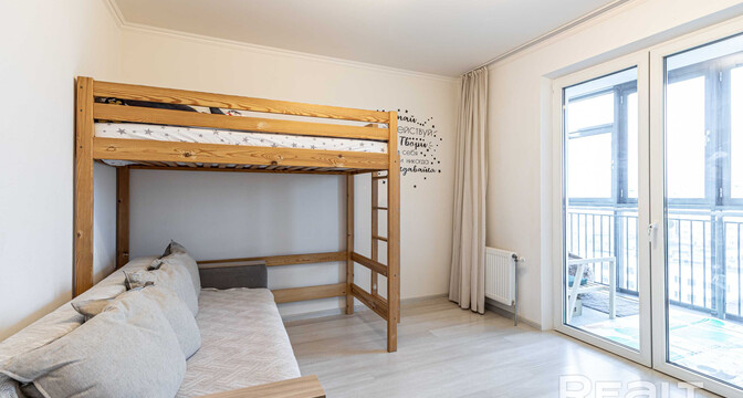 Жилье готово к заселению: тут светлая отделка, установлены стеклопакеты (окна большие), на полу лежат ламинат и плитка. Комнаты изолированные. В одной из них обустроена детская и есть выход на панорамную лоджию.