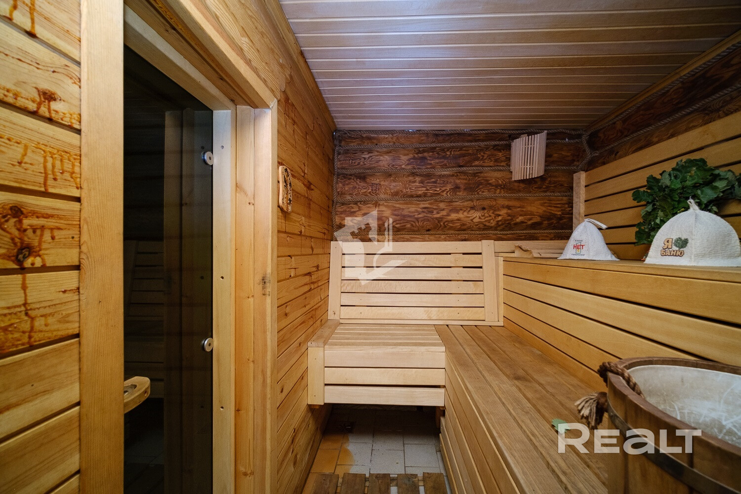 Во дворе рядом с домом находится деревянная баня, построенная в едином стиле. Она двухэтажная, с мини-кухней и жилой комнатой — можно использовать как гостевой дом. На террасе — кедровая бочка.