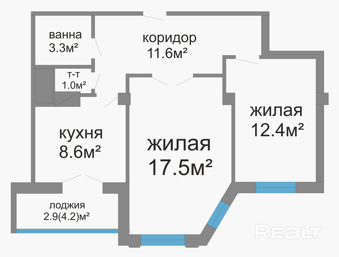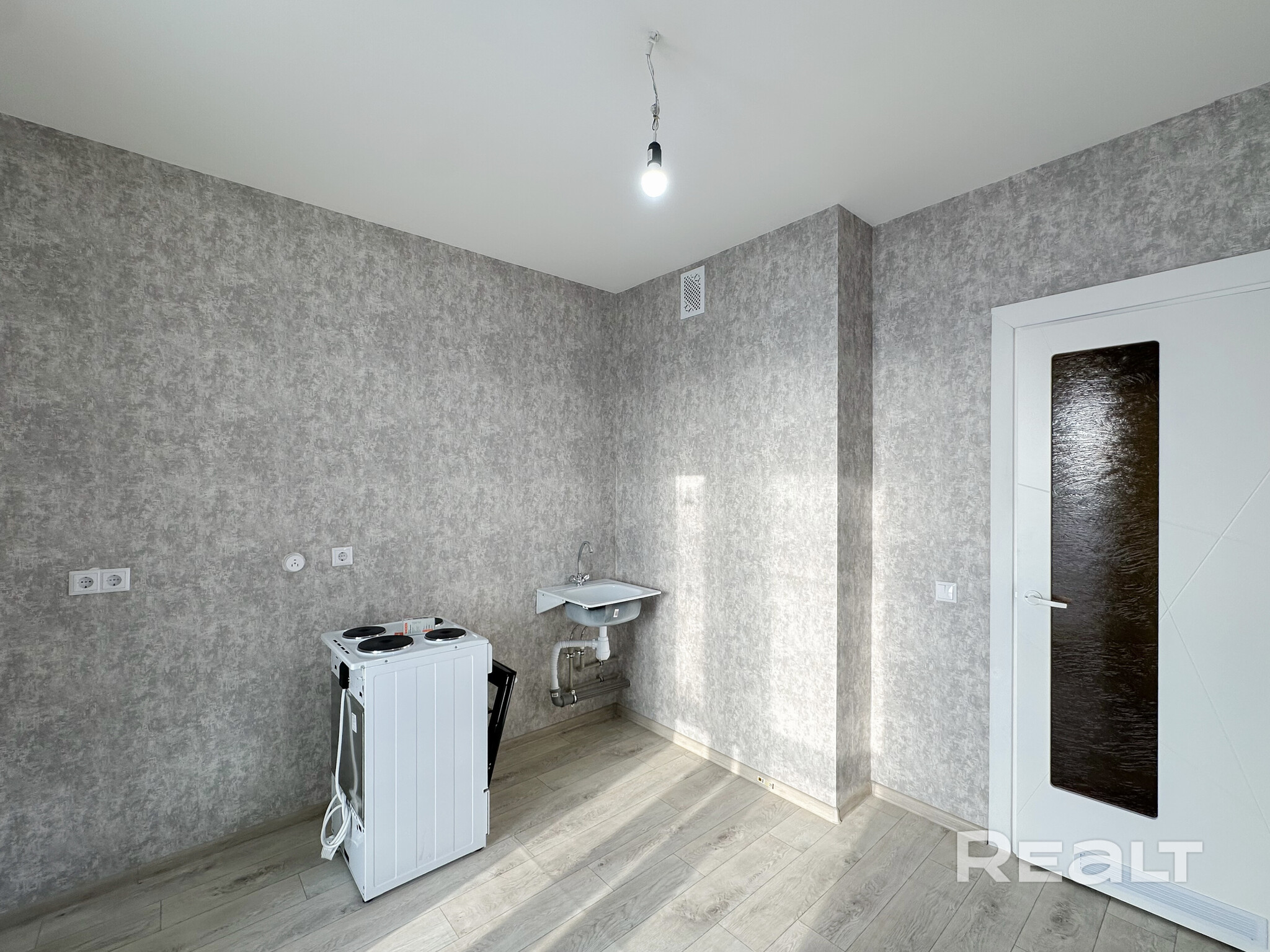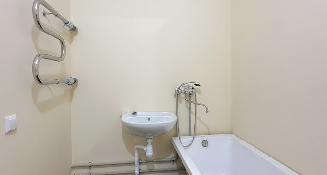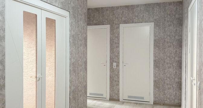 Все помещения в квартире уже отделаны. Тут есть линолеум, обои, электроплита, раковина, умывальник, ванна, унитаз, выключатели, розетки и межкомнатные двери.