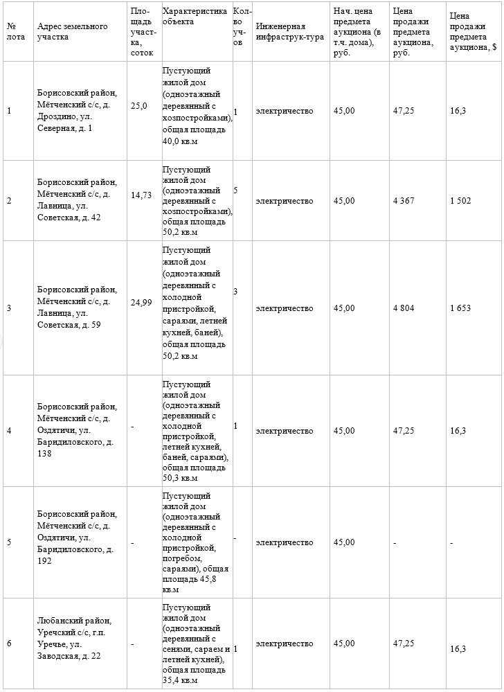 Отметим, что большого интереса у потенциальных покупателей дома не вызвали. Во-первых, земельные участки, на которых они находятся, не имеют кадастровых номеров и не определена их площадь. Исключением стали 3 участка в Борисовском районе, где присутствуют эти показатели. Во-вторых, из коммуникаций имеется только электричество. В итоге начальная цена на все на лоты (кроме двух) составила 45 рублей. Что касается заявок, то они поступили на 11 домов, на 5 из них подали по одной заявке. При начальной цене 45 рублей дома проданы единственным заявителям за 47,25 рубля, или 16,3 доллара по курсу Нацбанка на день проведения аукциона. На 5 лотов заявлений не поступило.