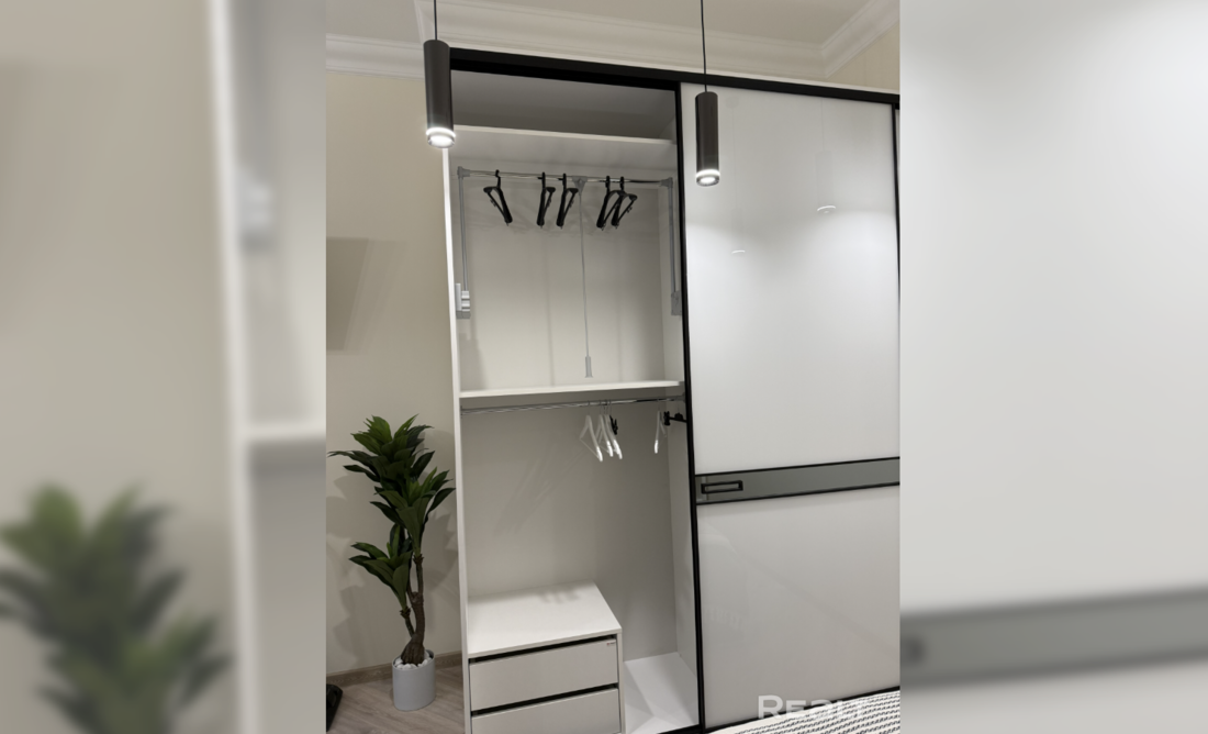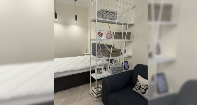 В гостиной стоит диван, а за стеллажом спрятано спальное место. Есть встроенный шкаф. В гостиной выход на незастекленный балкон.