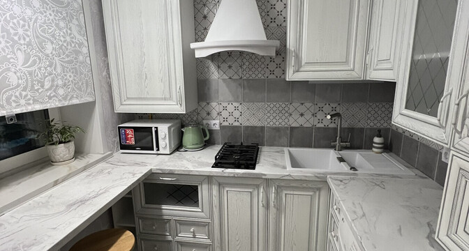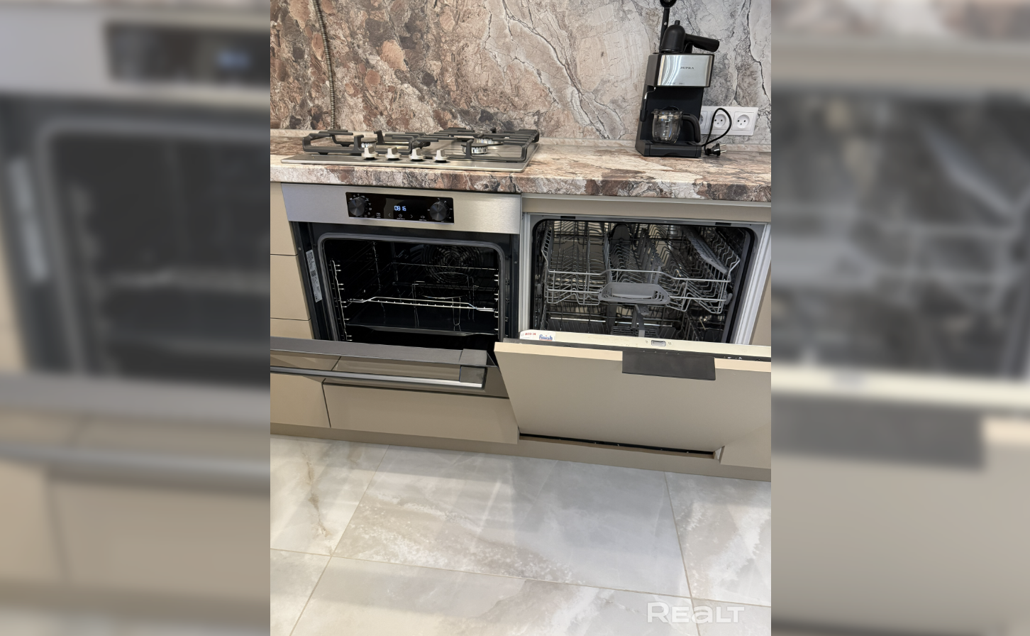 В кухне из техники электроплита Gorenje, посудомоечная машина Bosch, духовой шкаф, холодильник и микроволновая печь. Установлен фильтр для очистки воды. Есть выход на балкон.