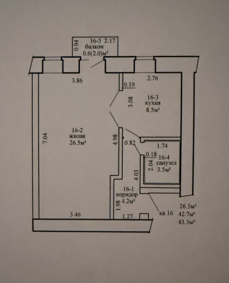 Квартира находится на втором этаже. Ее общая площадь — 43 квадрата, а жилая — 23. Кухня занимает 8 метров.