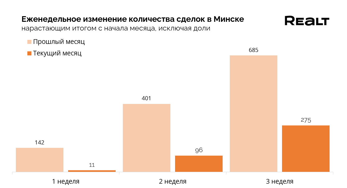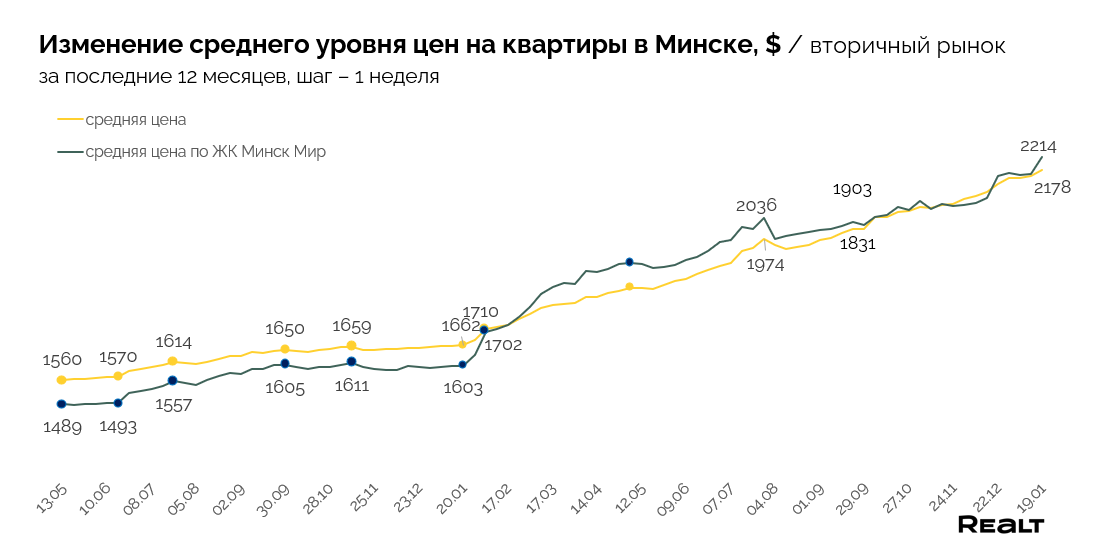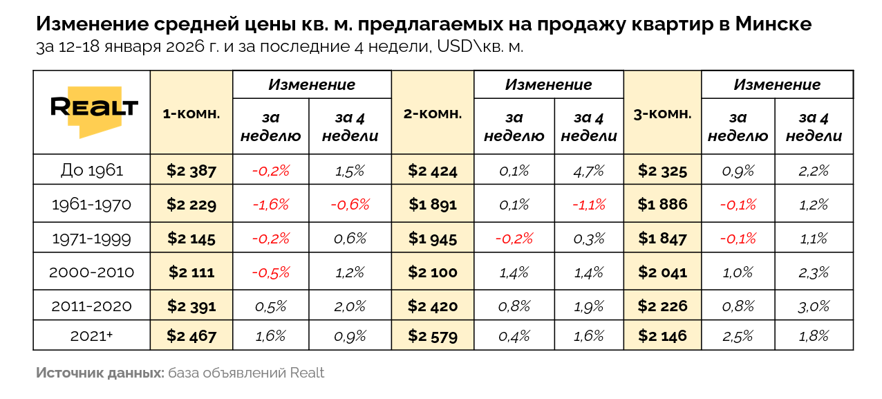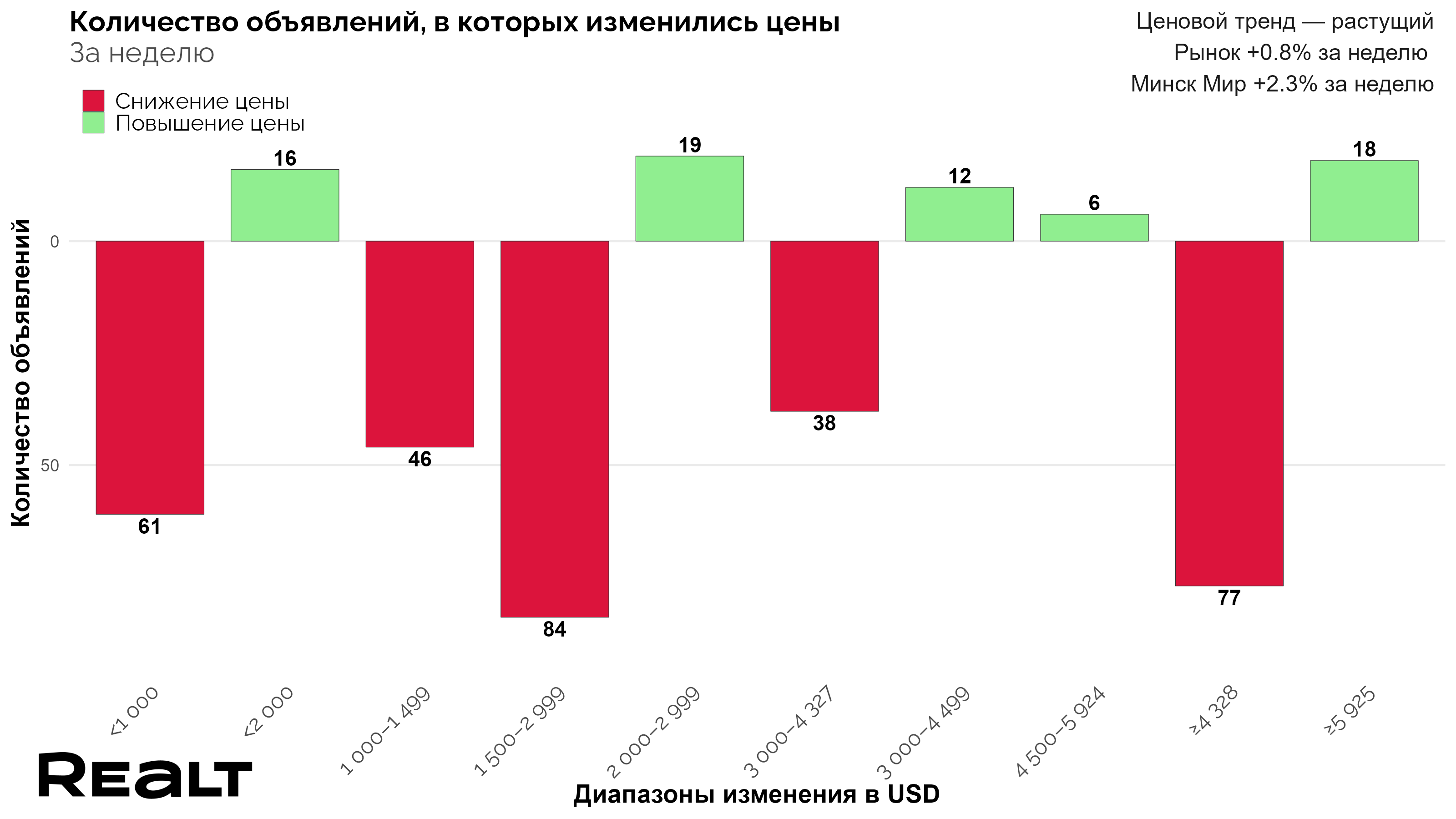 За вторую полную неделю января, подешевело 7% квартир от общего объема предложения (332 квартир, в среднем на 1000−4000 долларов), а доля случаев увеличения цены всего 2% — стали дороже 103 квартиры в среднем на 2000−6000 долларов.