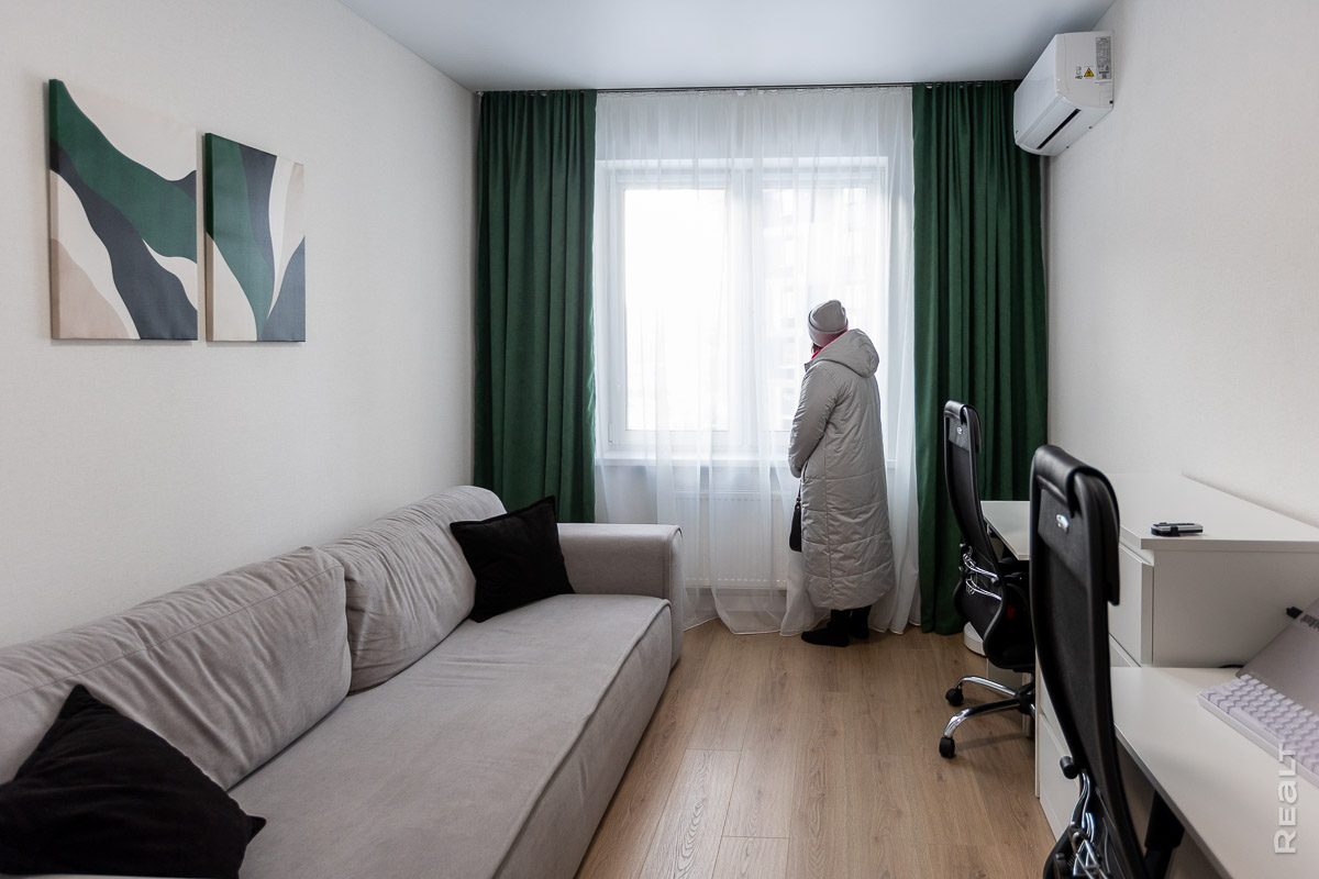 Игорь изначально ориентировался на этот жилой комплекс. Посещение одной из квартир только усилило желание купить жилье именно здесь. «Из плюсов для себя отметил то, что рядом с домом природная зона, сразу лес, есть, где прогуляться. Парковки — и велосипедная, и автомобильная — прямо возле подъезда. Однако, наверное, главный минус в том, что это просто бетонные стены. Возможно, как раз из-за этого создается ощущение, что в квартире мало света и не мешало бы добавить еще одно окно. В любом случае, в квартиру нельзя сразу заехать, нужно делать ремонт. При этом однозначно придется решать вопросы с электрикой, увеличивать количество розеток», — замечает Игорь.