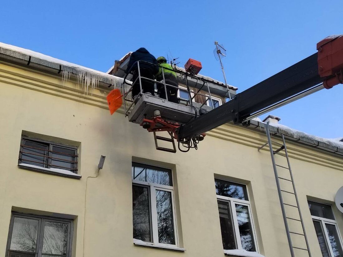 Сейчас коммунальщики каждый день осматривают крыши жилых домов и после этого убирают опасные скопления снега, наледи и сосулек. В первую очередь обращают внимание на скатные кровли. Как это выглядит, показали в телеграм-канале «ЖКХ Минск. Официально».