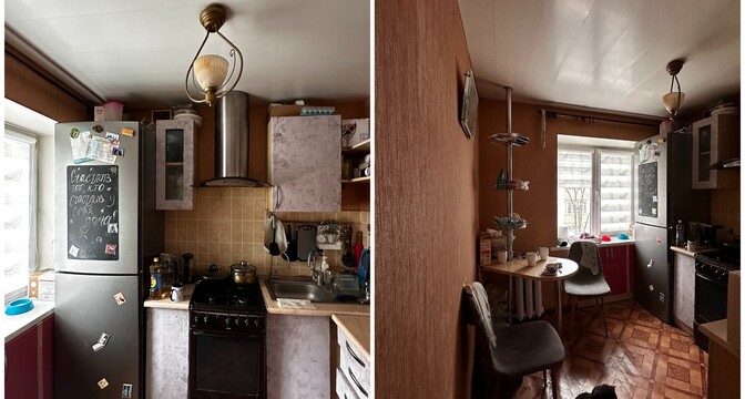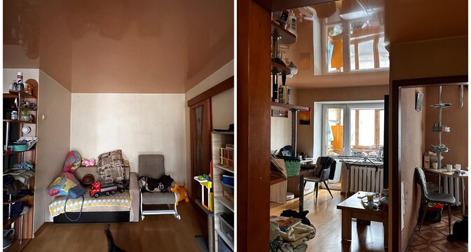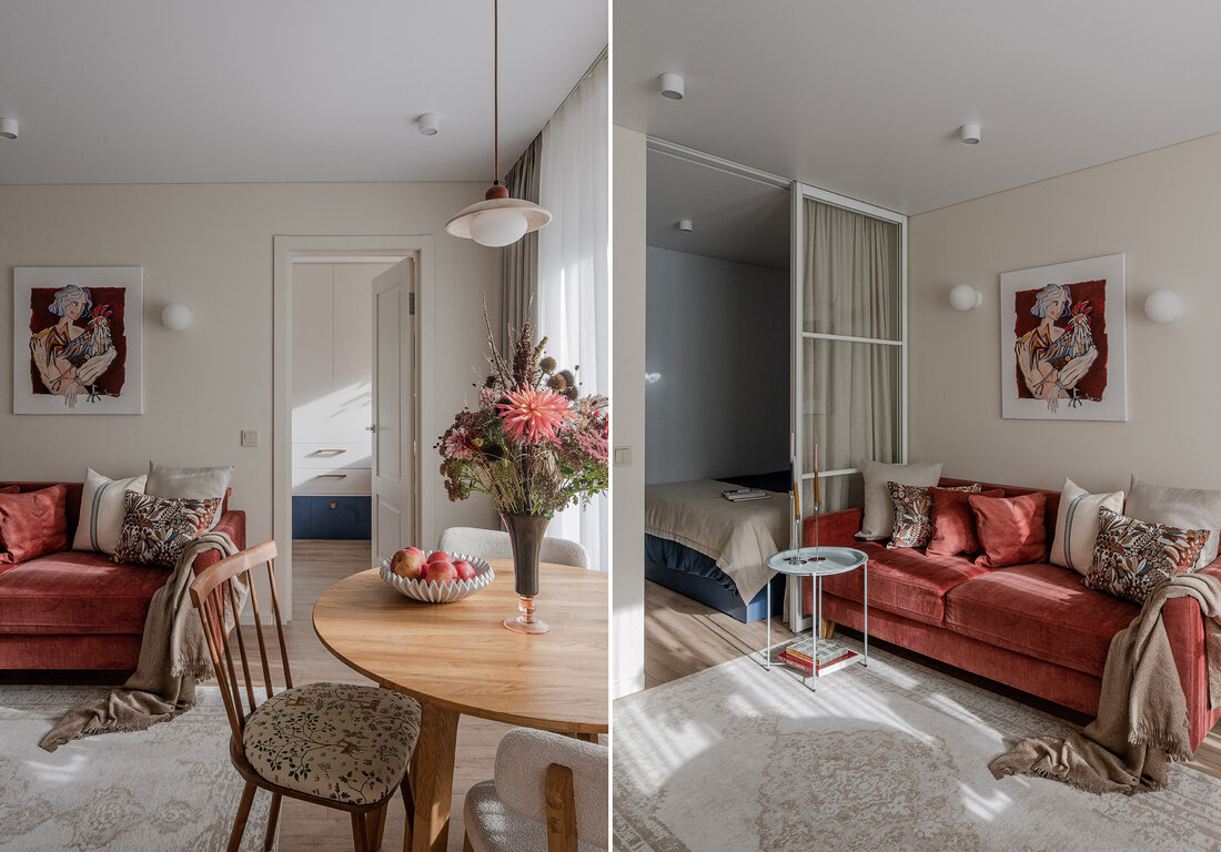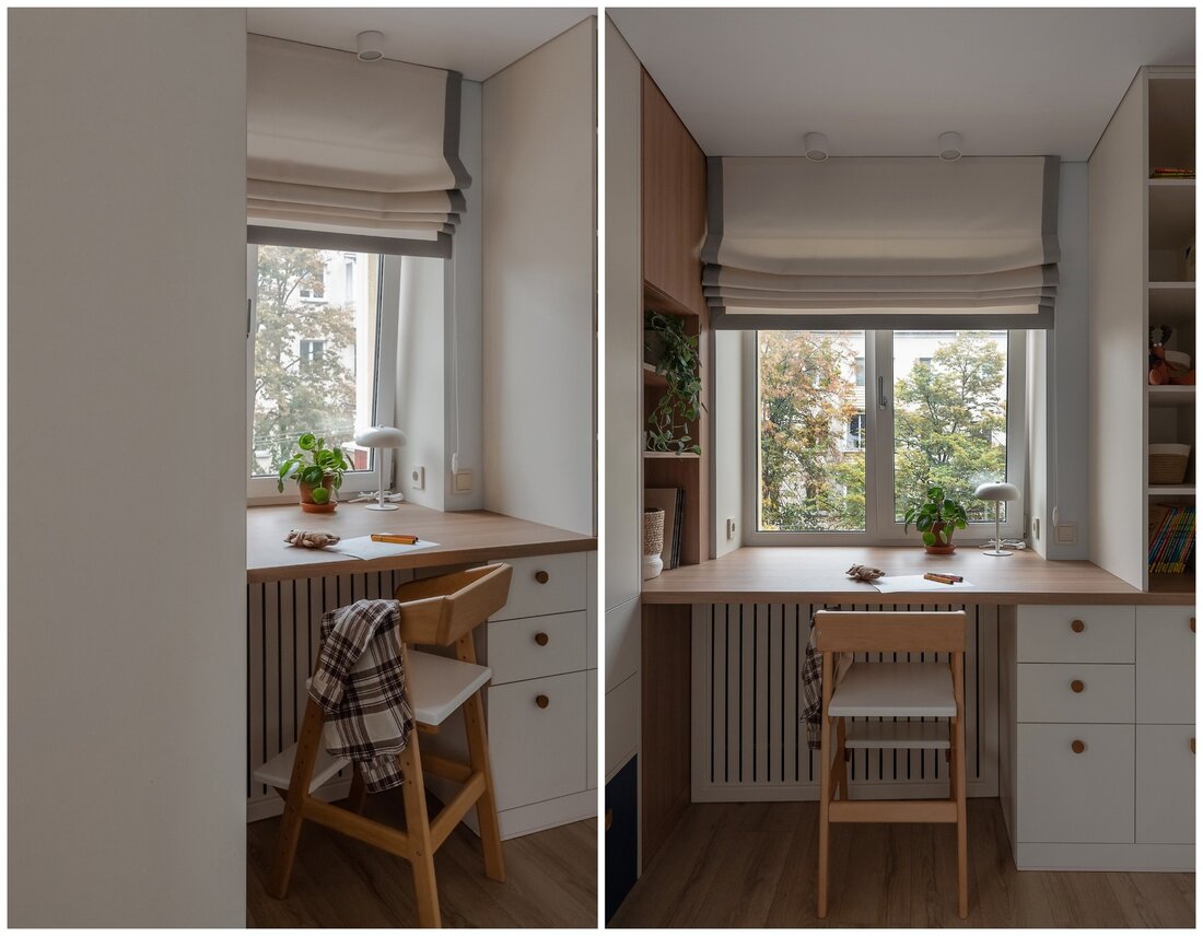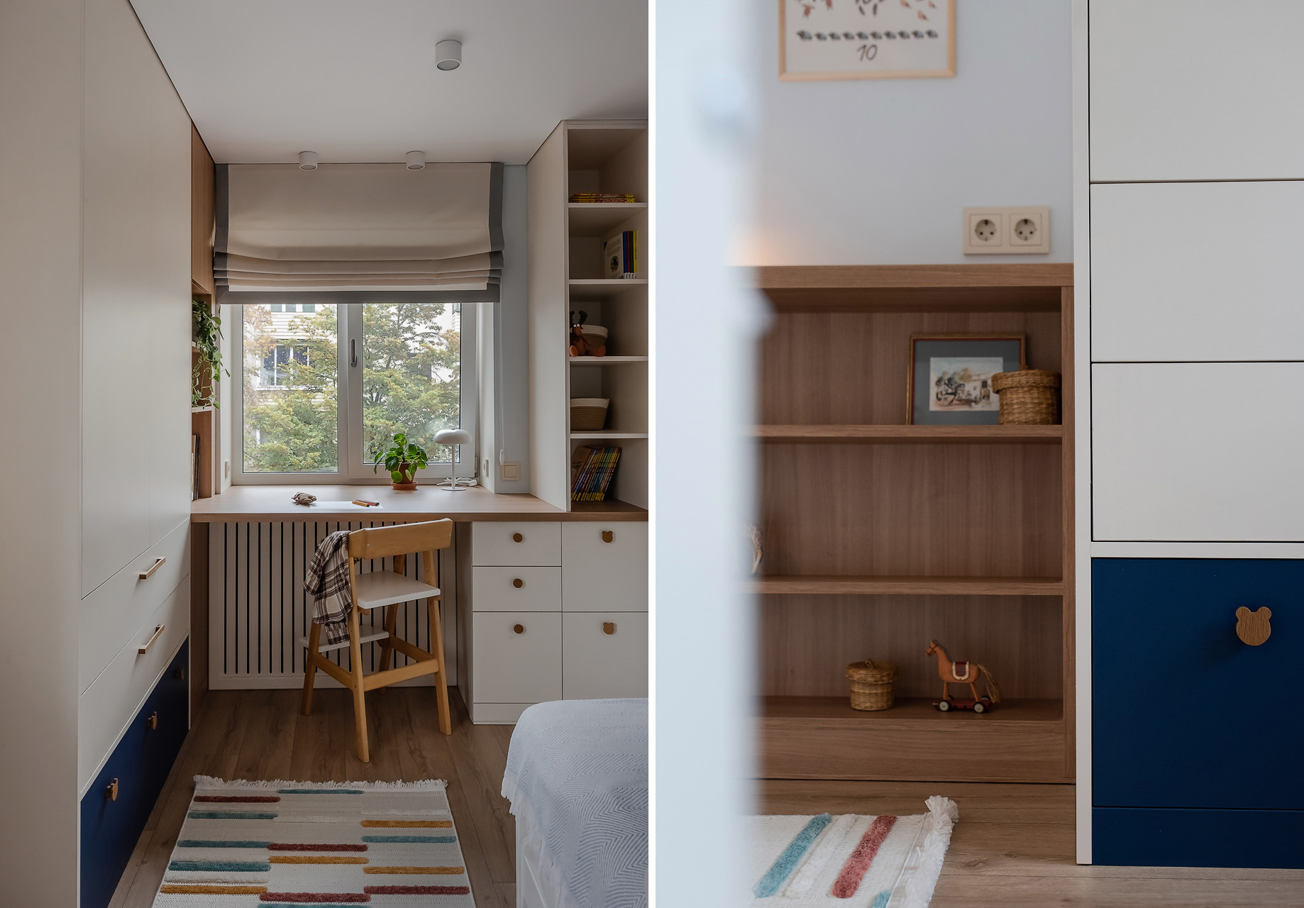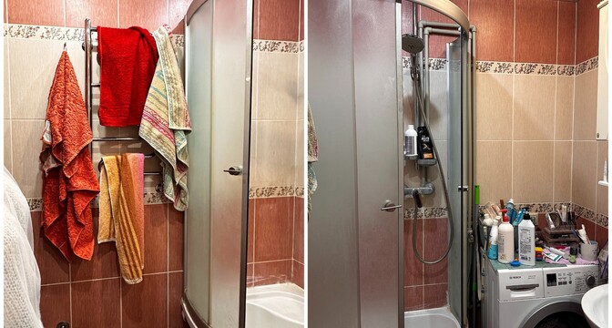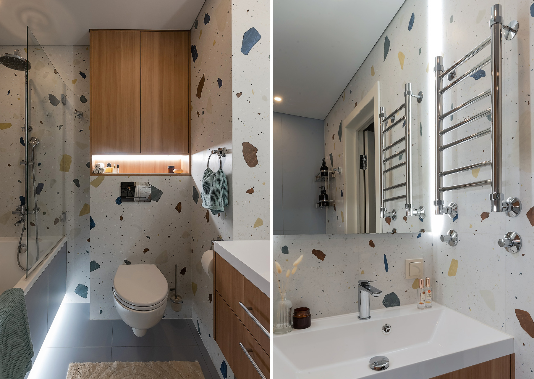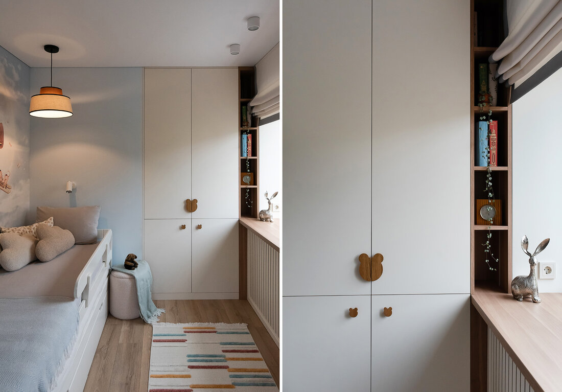 — Как и говорили выше, санузел потерпел полную трансформацию. Изначально вход располагался со стороны прихожей, из-за чего двери постоянно сталкивались друг с другом. Внутри не было места для хранения, душевая кабина протекала и совершенно не подходила для семьи с маленьким ребенком. Теперь тут имеются подвесной унитаз, полноценный умывальник и ванна. Узел с умывальником оказался самым технически сложным. Роль играли миллиметры, поэтому раковину изготавливали на заказ.
