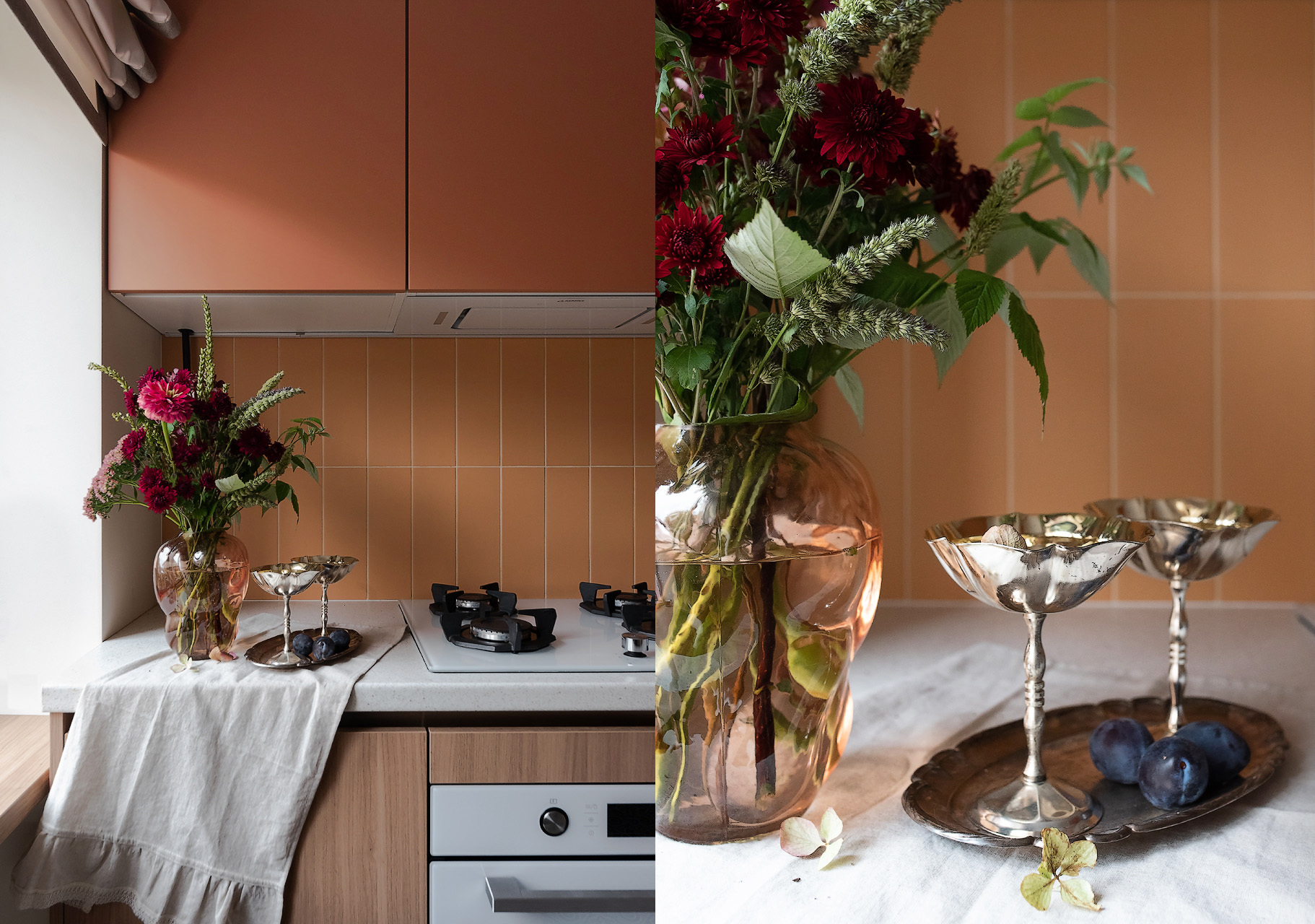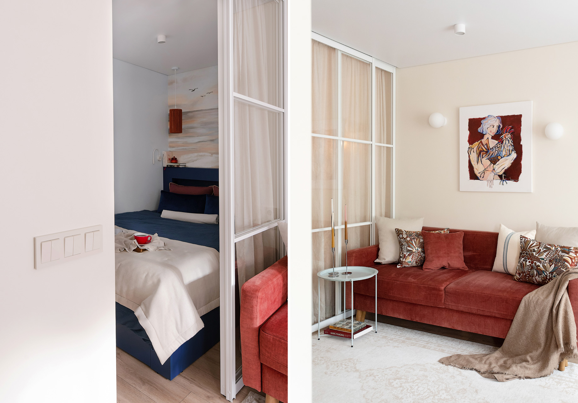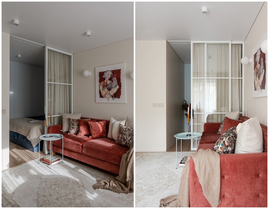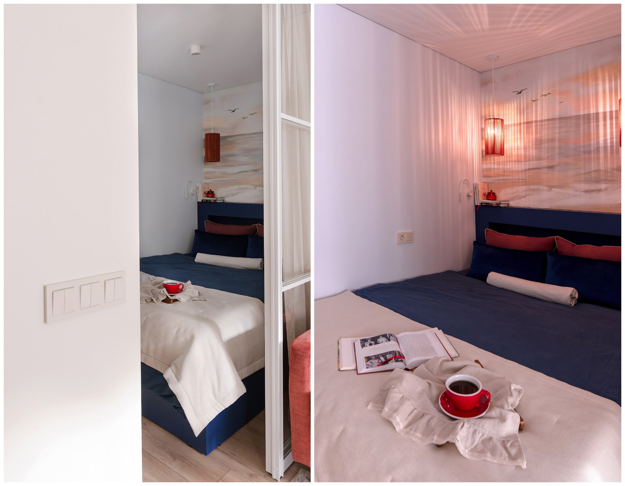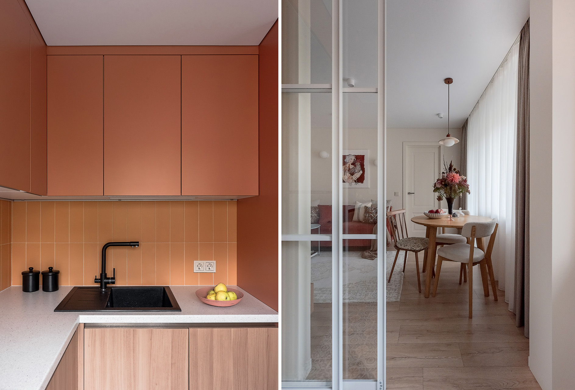 — Как и говорили выше, санузел потерпел полную трансформацию. Изначально вход располагался со стороны прихожей, из-за чего двери постоянно сталкивались друг с другом. Внутри не было места для хранения, душевая кабина протекала и совершенно не подходила для семьи с маленьким ребенком. Теперь тут имеются подвесной унитаз, полноценный умывальник и ванна. Узел с умывальником оказался самым технически сложным. Роль играли миллиметры, поэтому раковину изготавливали на заказ.
