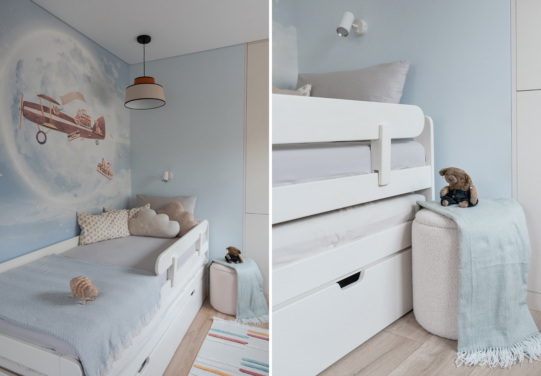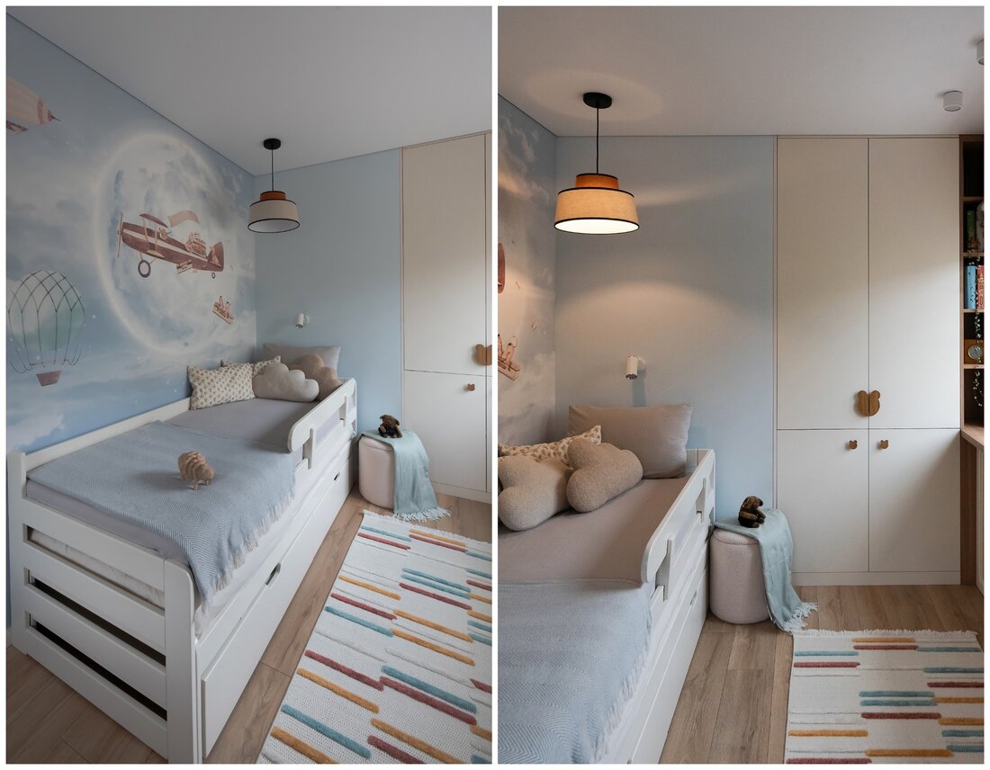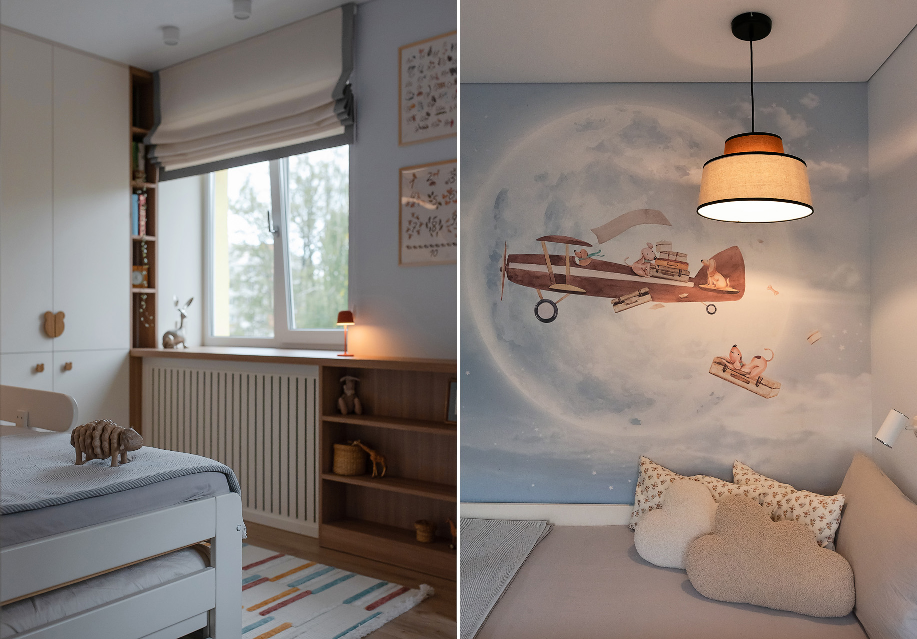 В детской тоже есть фреска. На этот раз использовали бесшовные обои от белорусского производителя Vinni.by. Рисунок ребенок выбирал сам.