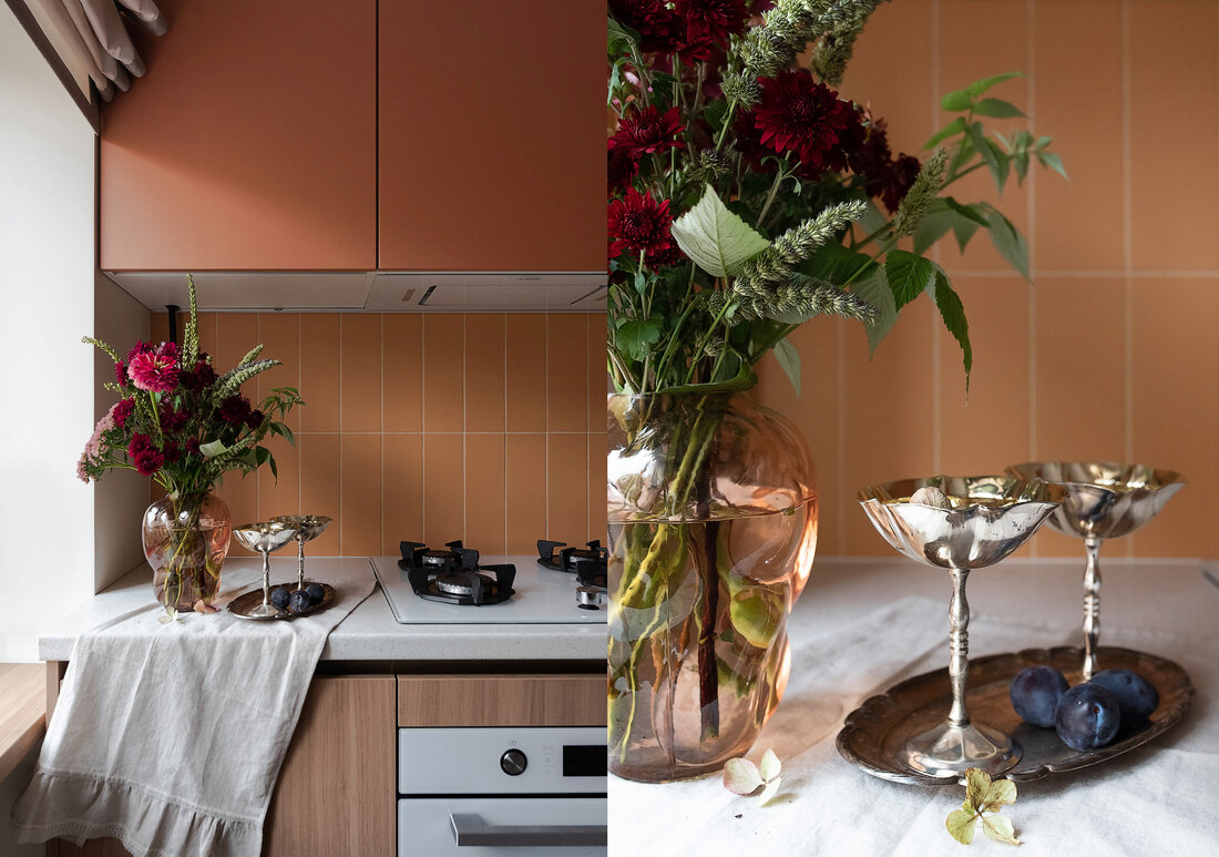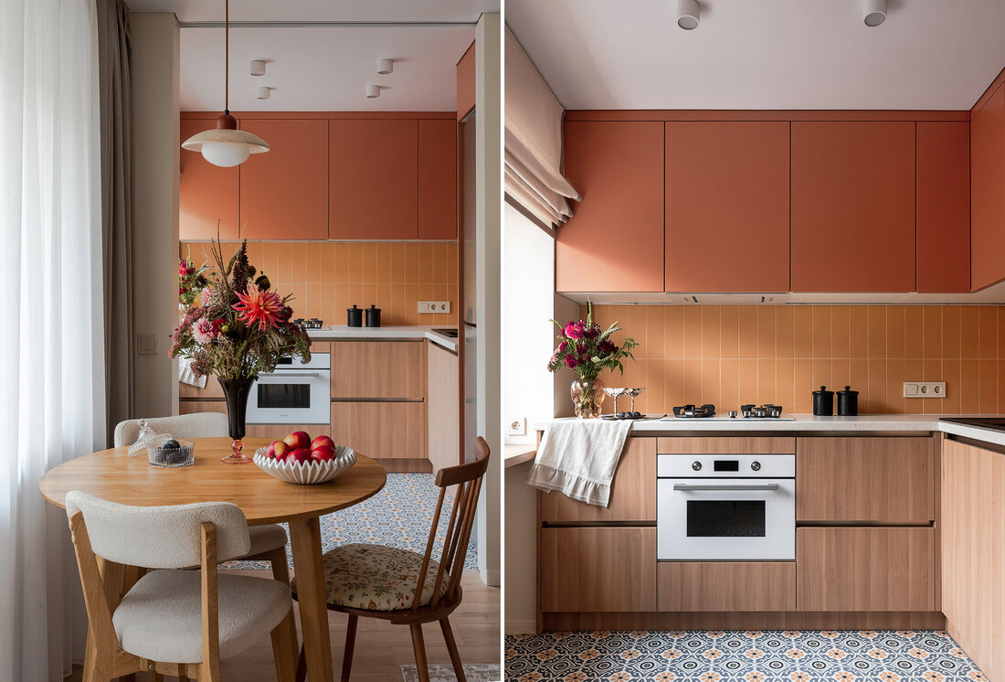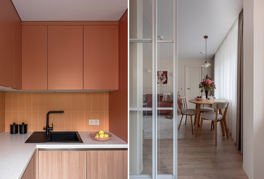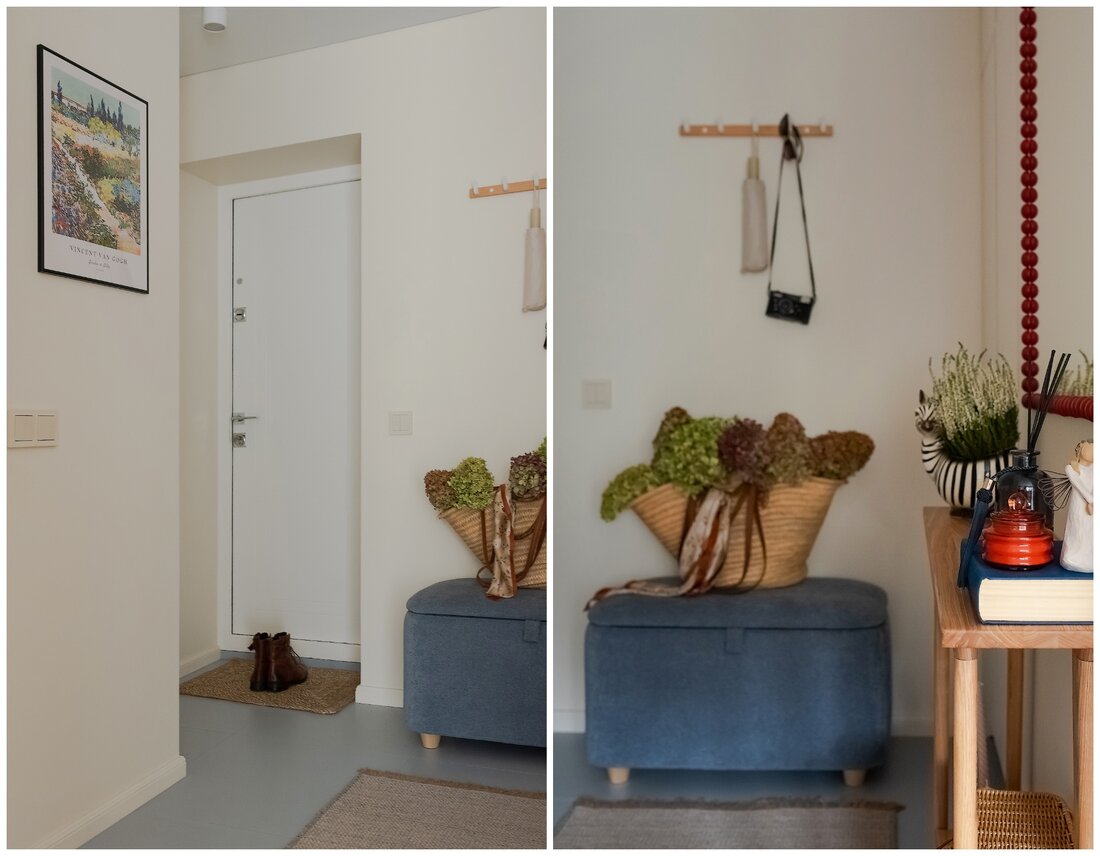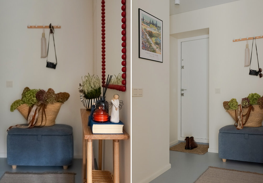 По концепции санузел должен давать ощущение чистоты и свежести, но при этом добавить тепла. Поэтому выбрали мягкий голубой оттенок плитки в сочетании с крупным терраццо и терракотовыми акцентами. Голубую плитку решили продлить и в прихожую, обозначив таким образом грязную зону, и визуально связав оба пространства.