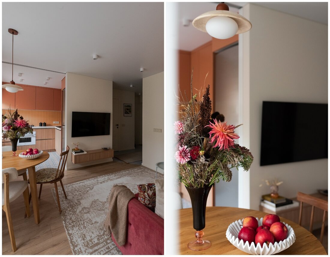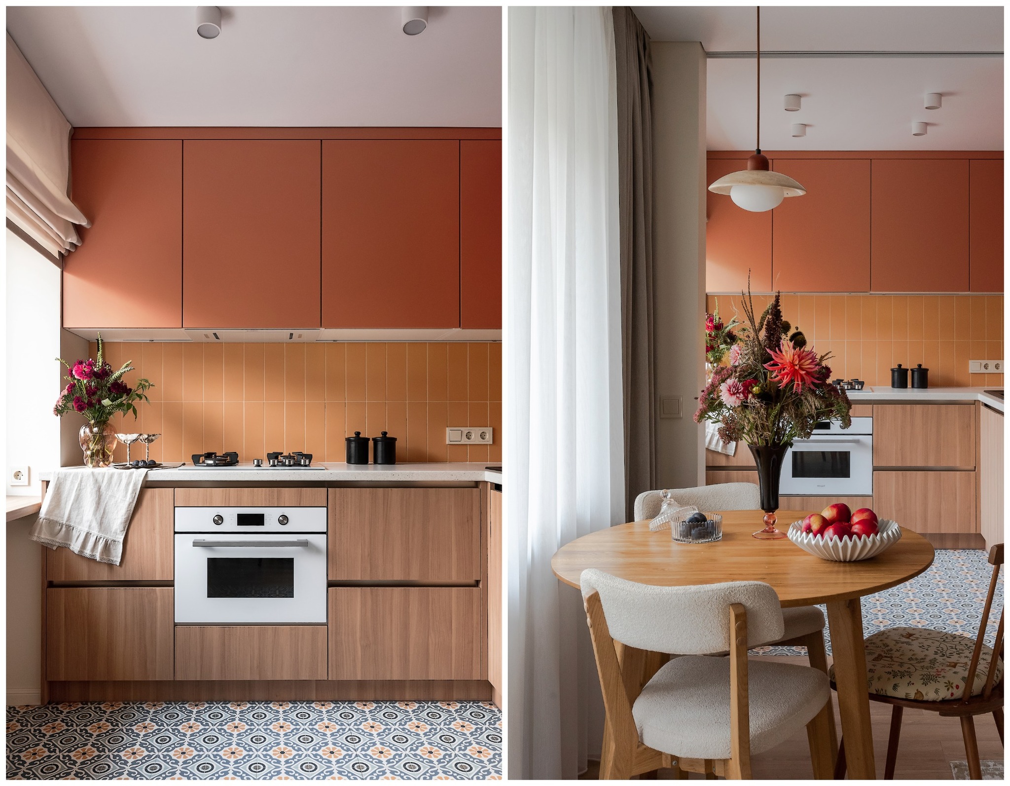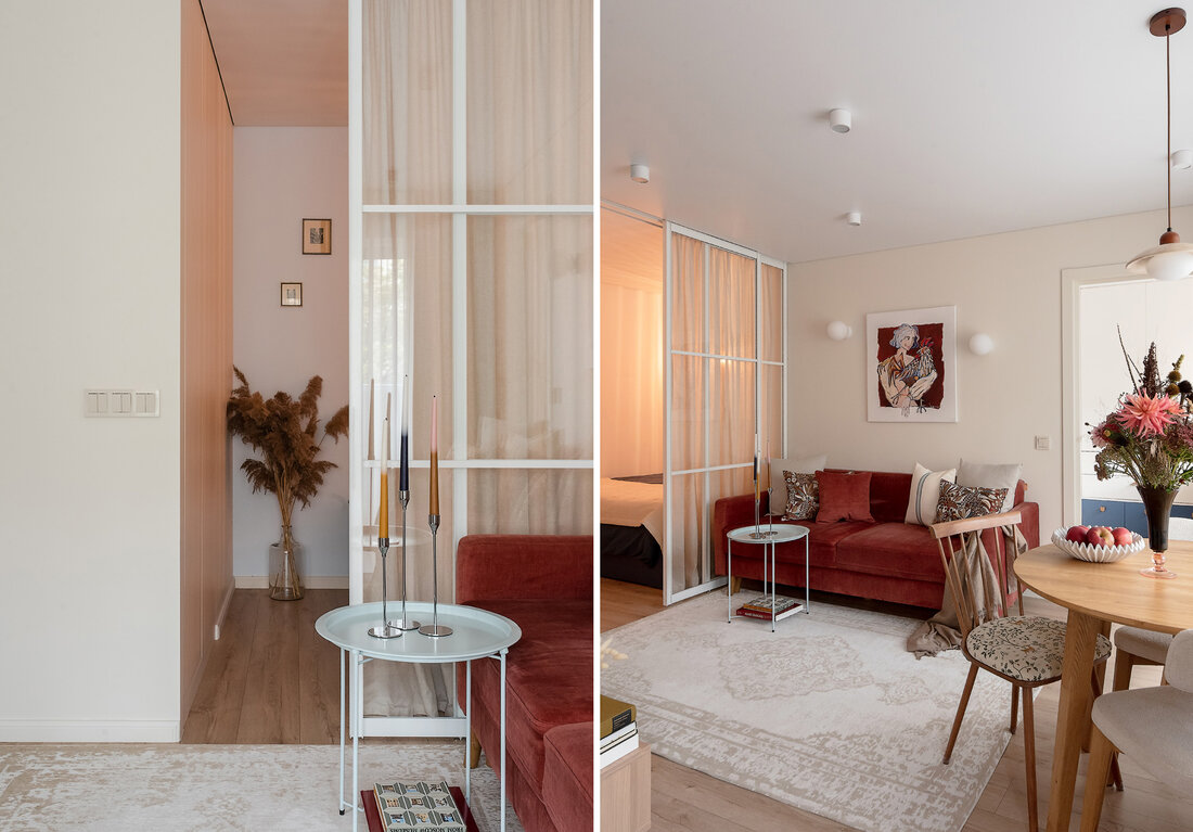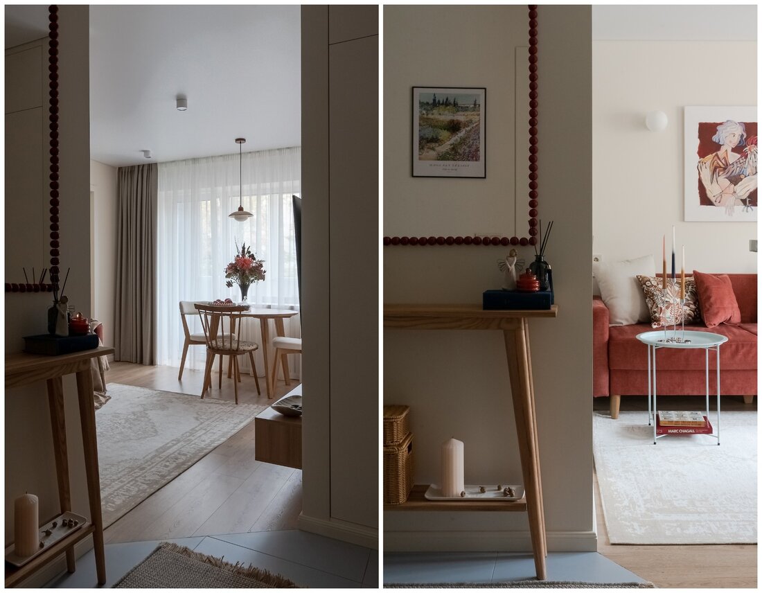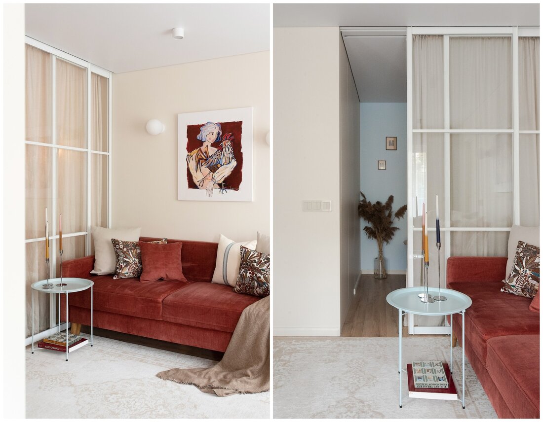 По концепции санузел должен давать ощущение чистоты и свежести, но при этом добавить тепла. Поэтому выбрали мягкий голубой оттенок плитки в сочетании с крупным терраццо и терракотовыми акцентами. Голубую плитку решили продлить и в прихожую, обозначив таким образом грязную зону, и визуально связав оба пространства.