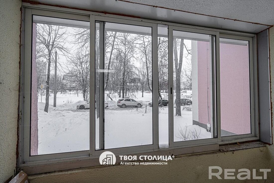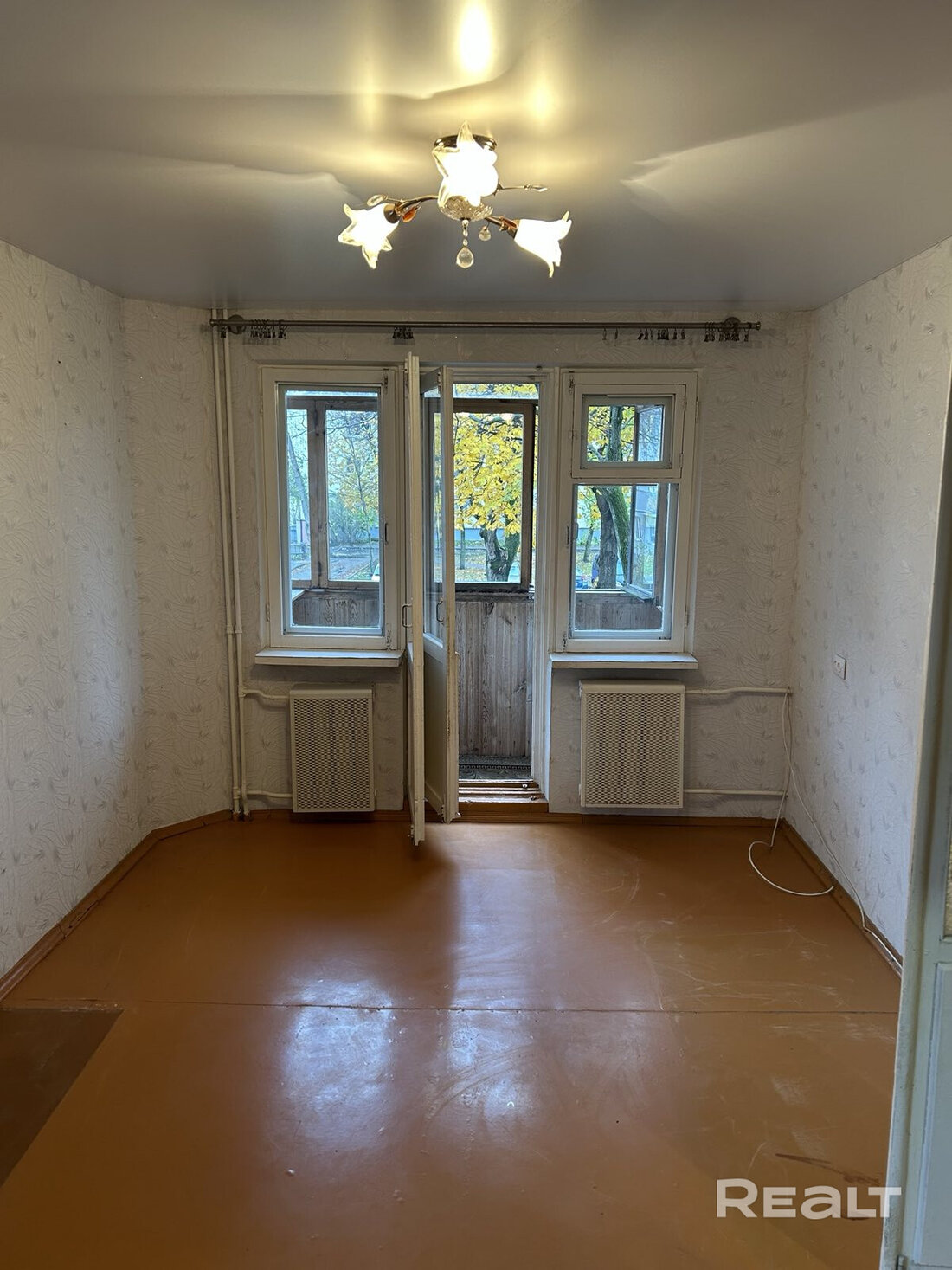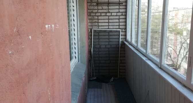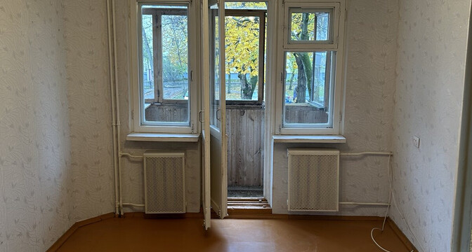 Квартира под ремонт. Тут на полу лежит линолеум, стены в обоях, а в окнах стоят деревянные рамы. Из комнаты имеется выход на застекленный балкон.