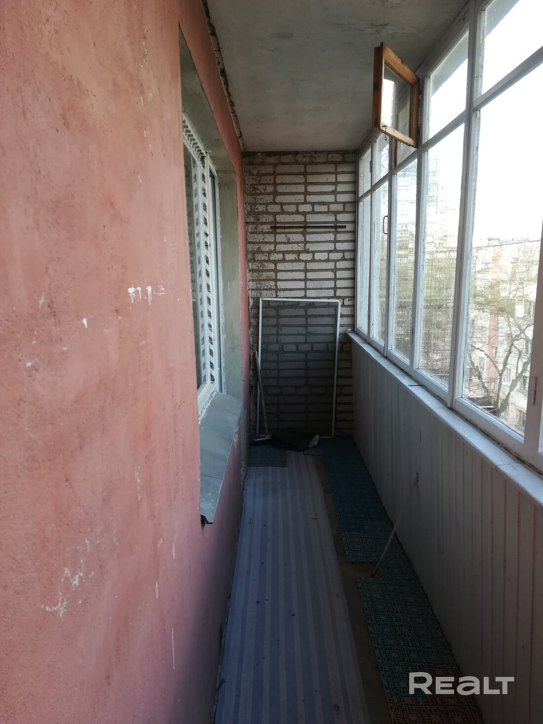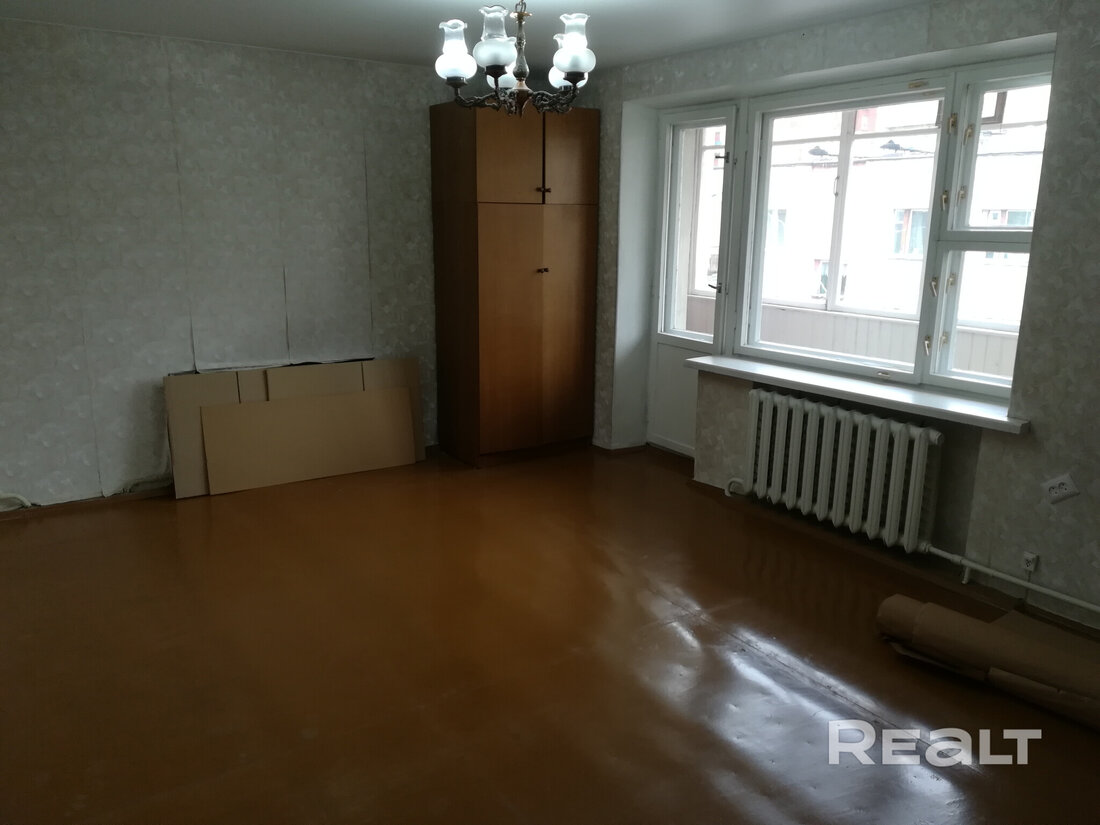 Квартира нуждается в обновлении. Ее практически очистили от мебели и техники. На полу тут лежит линолеум, стены оклеены обоями, установлены деревянные рамы. Из комнаты есть выход на длинный балкон.