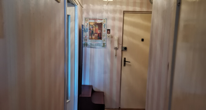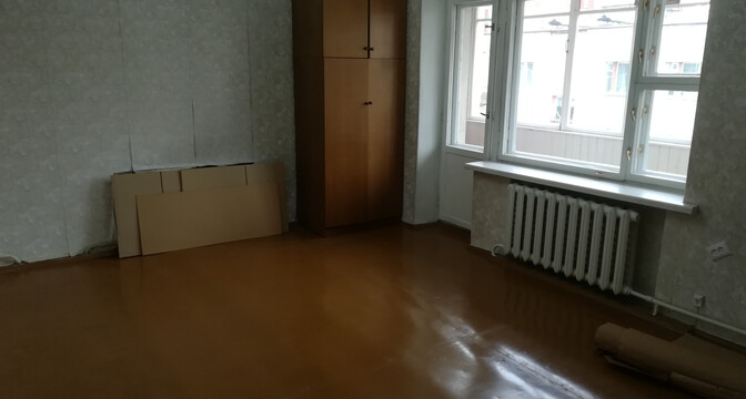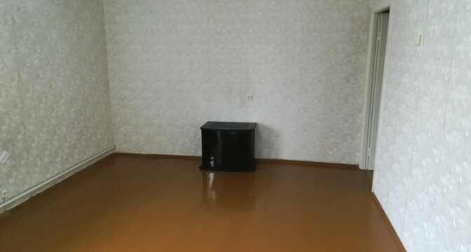 Квартира идет под ремонт и практически освобождена от мебели и техники. На полу лежат деревянное покрытие и линолеум, на стенах — обои. Жилье с застекленным балконом.