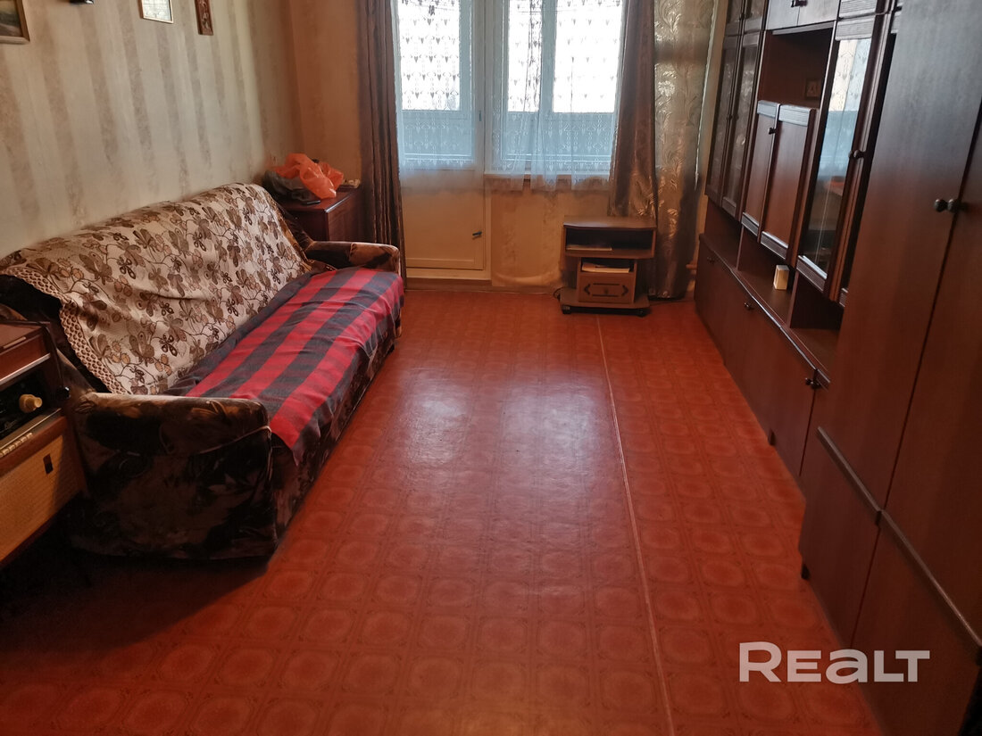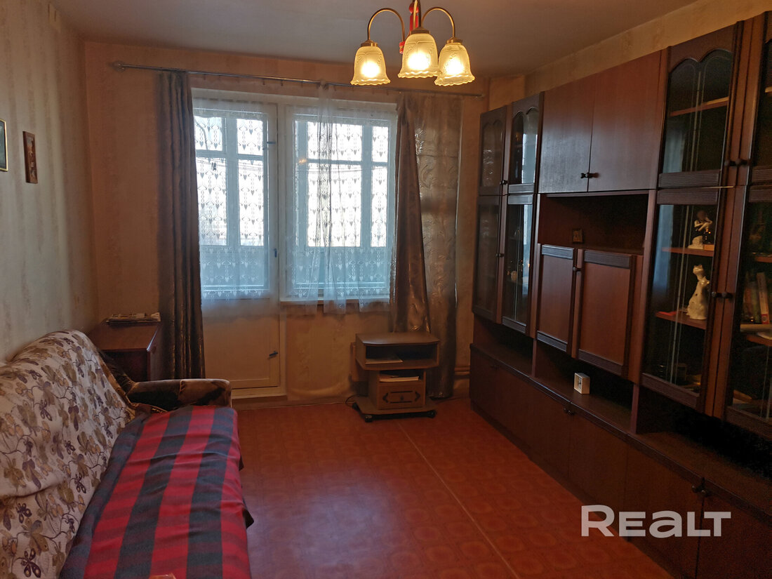 Однушка нуждается в обновлении. На полу лежит ДСП, стены оклеены обоями. Из комнаты есть выход на балкон.