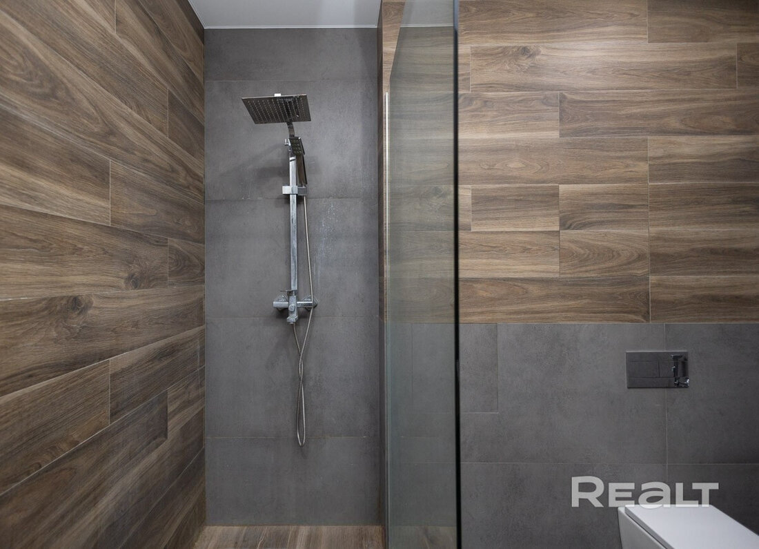 Отделка в квартире — современная, с преобладанием серых, черных и коричневых оттенков. Из примененных материалов — ламинат, обои, плитка.