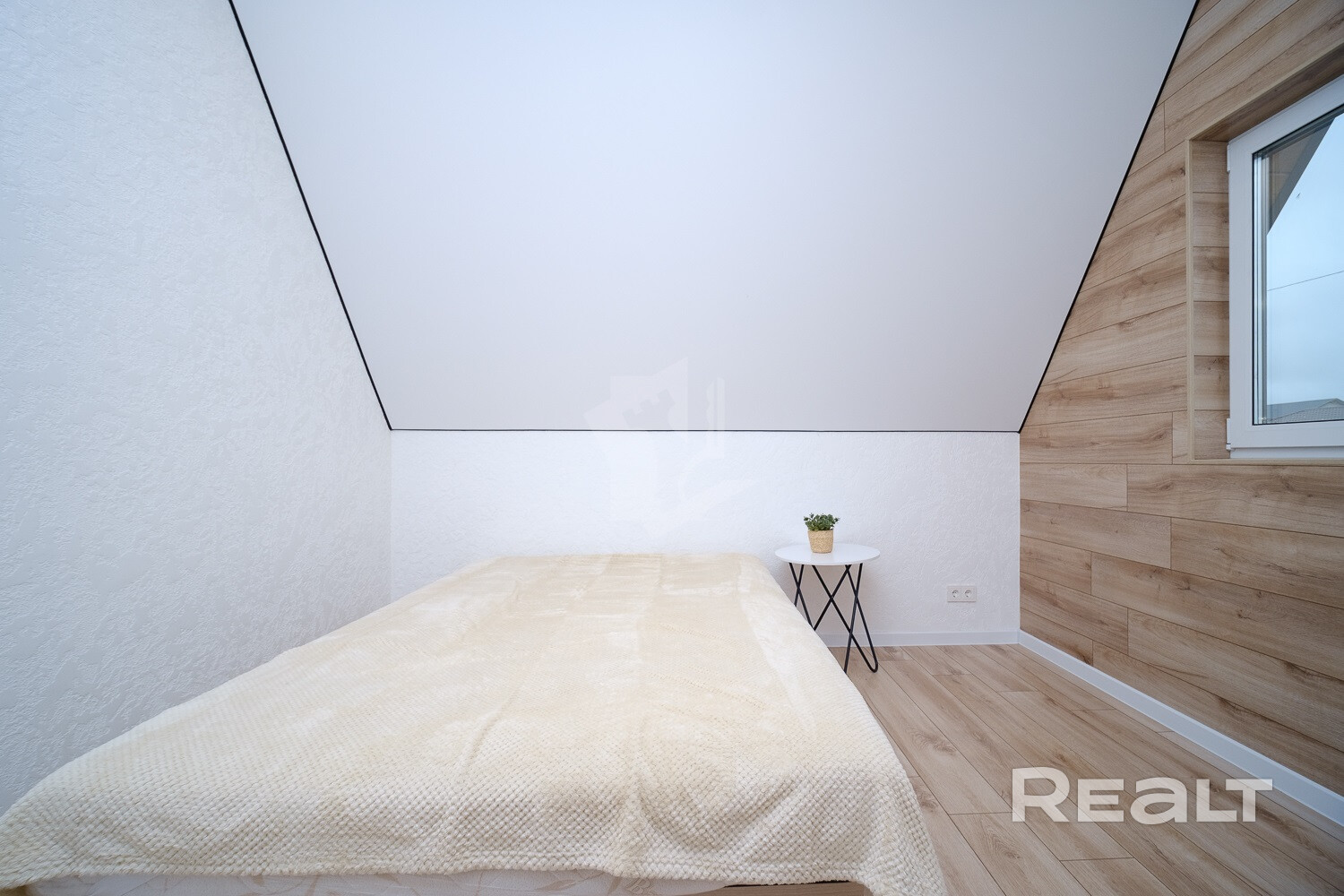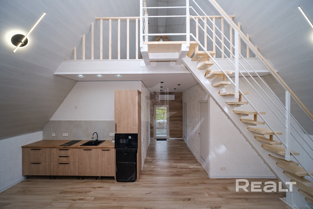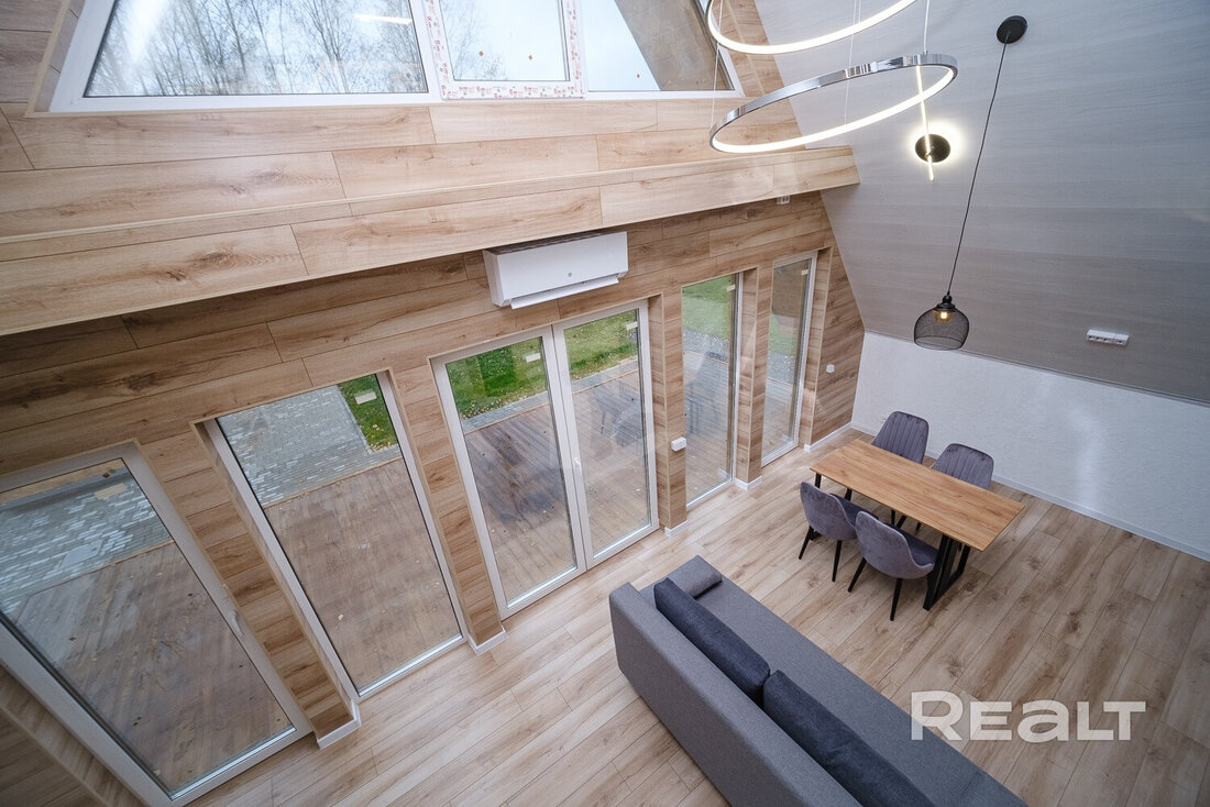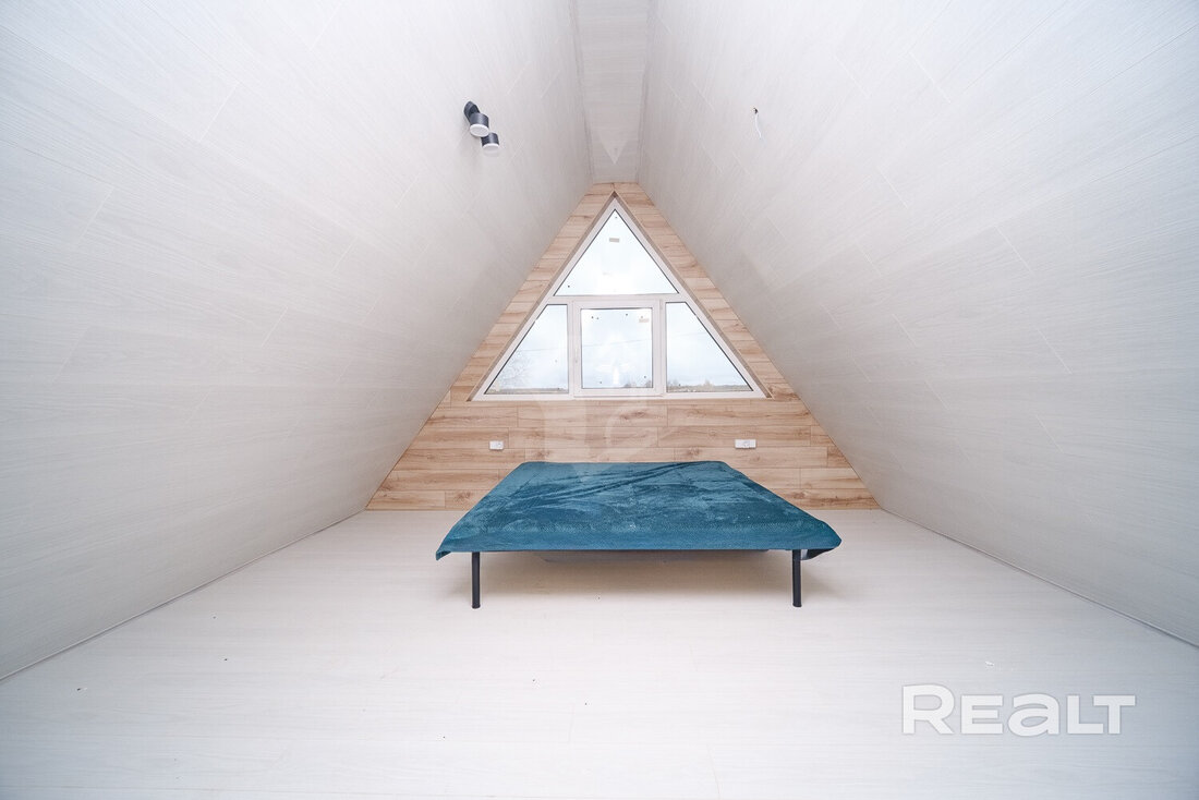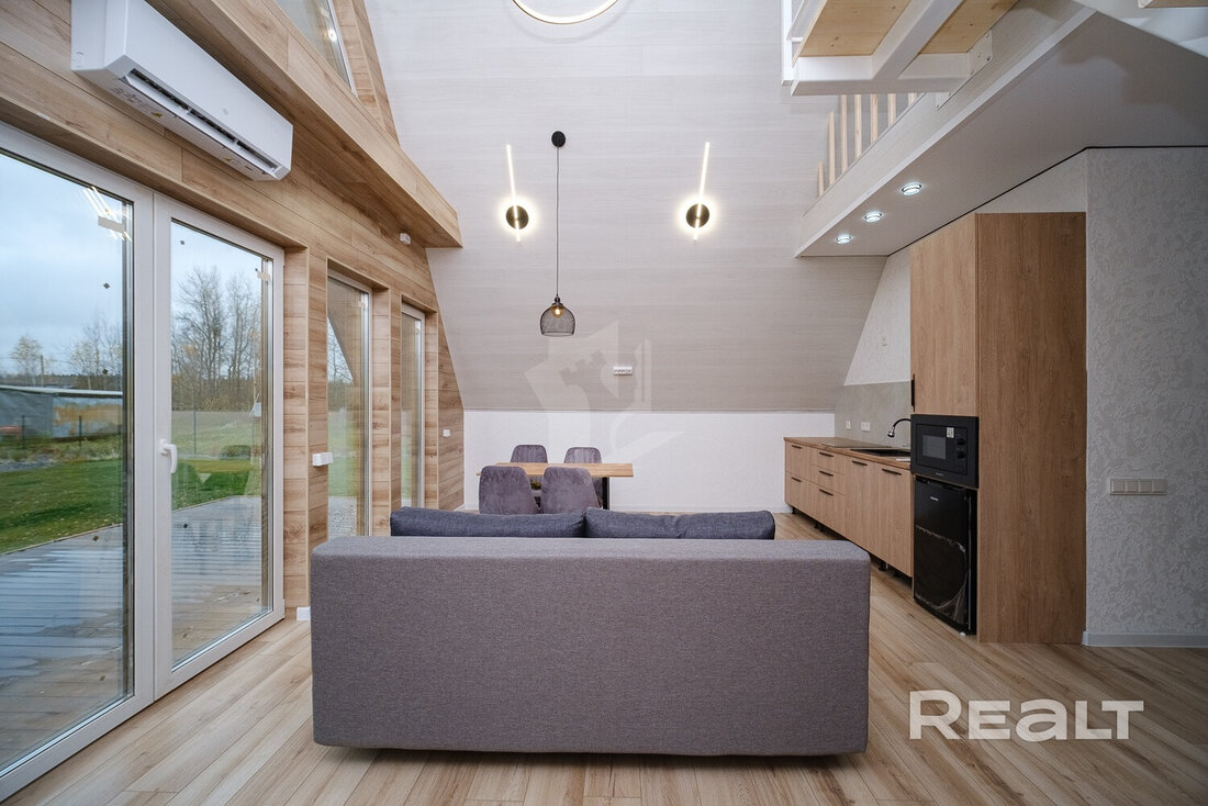 Общая площадь — 84,7 м2. Внутри гостиная-кухня, спальня, санузелы. Под самой крышей — спальное место. Имеется вся необходимая мебель и техника.