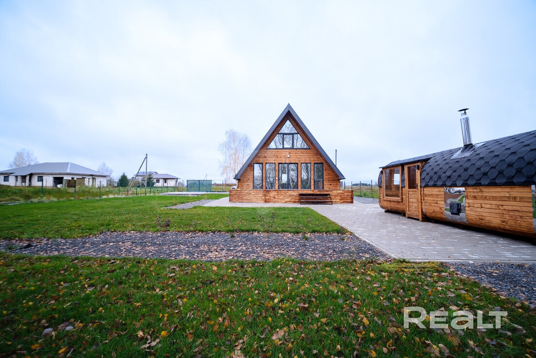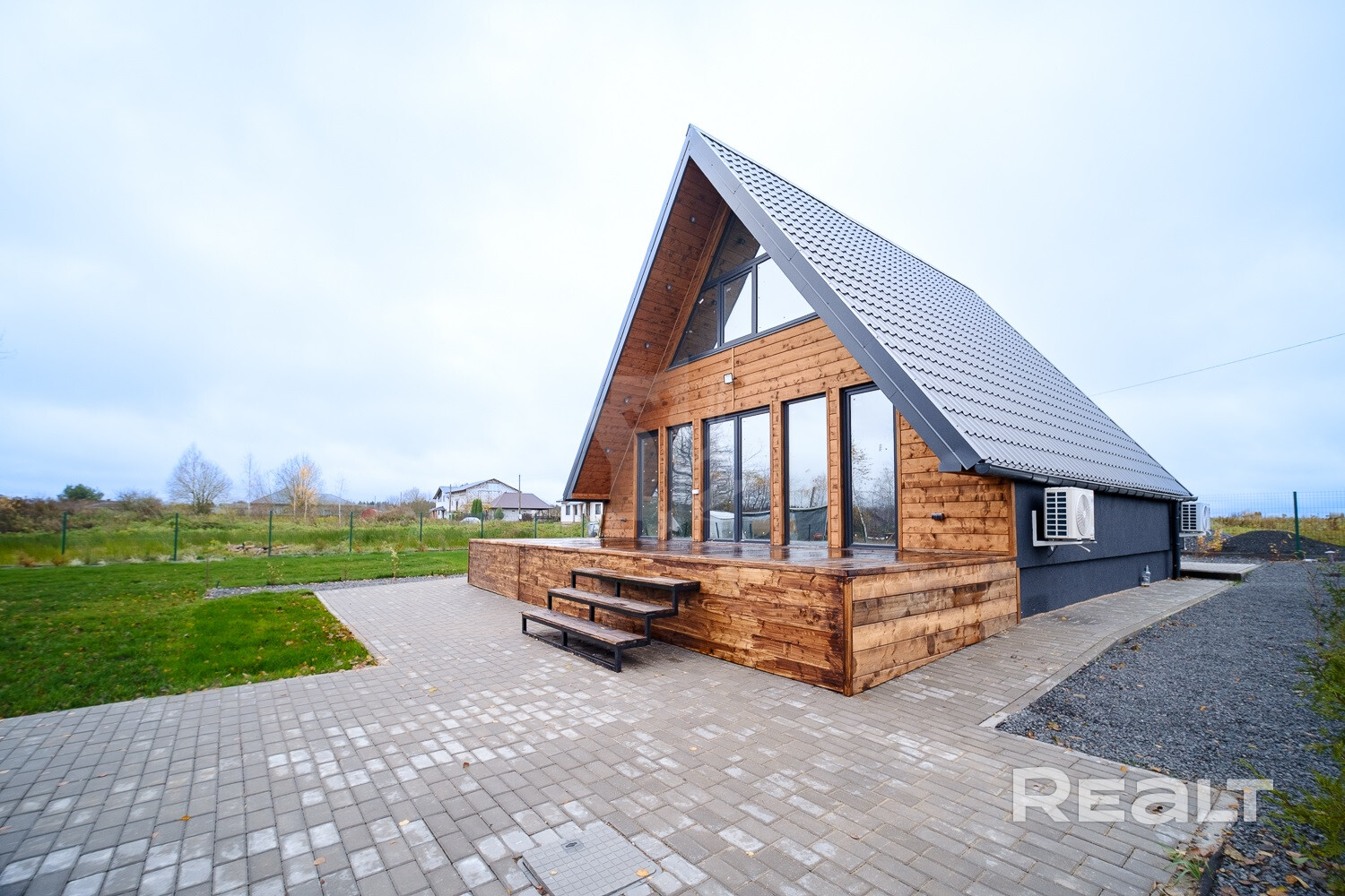 Здесь, на предпоследнем участке, продается дом в стиле A-frame 2025 года постройки. Фундамент под ним бетонный, стены подняты на 4 блока, далее идет скатная крыша. Один фронтон полностью остеклен.