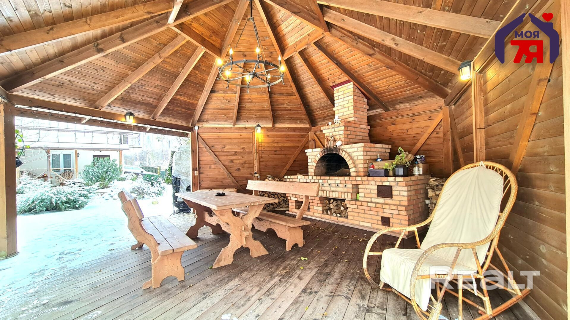 Имеется основательная беседка с печью-камином. За домом имеются еще 6 соток с парником, хозпостройкой, садом и огородом.